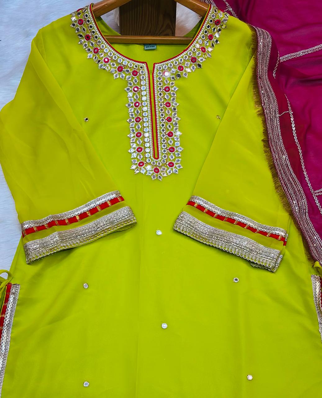 Function Wear Parrot Color Faux Blooming With Sequins And Thread Embroidered Work Sharara Suit