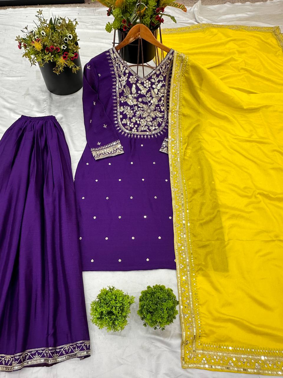 Function Wear Purple Color Heavy Pure Chinon Silk With 5mm Embroidery Sequence Work Palazzo Suit