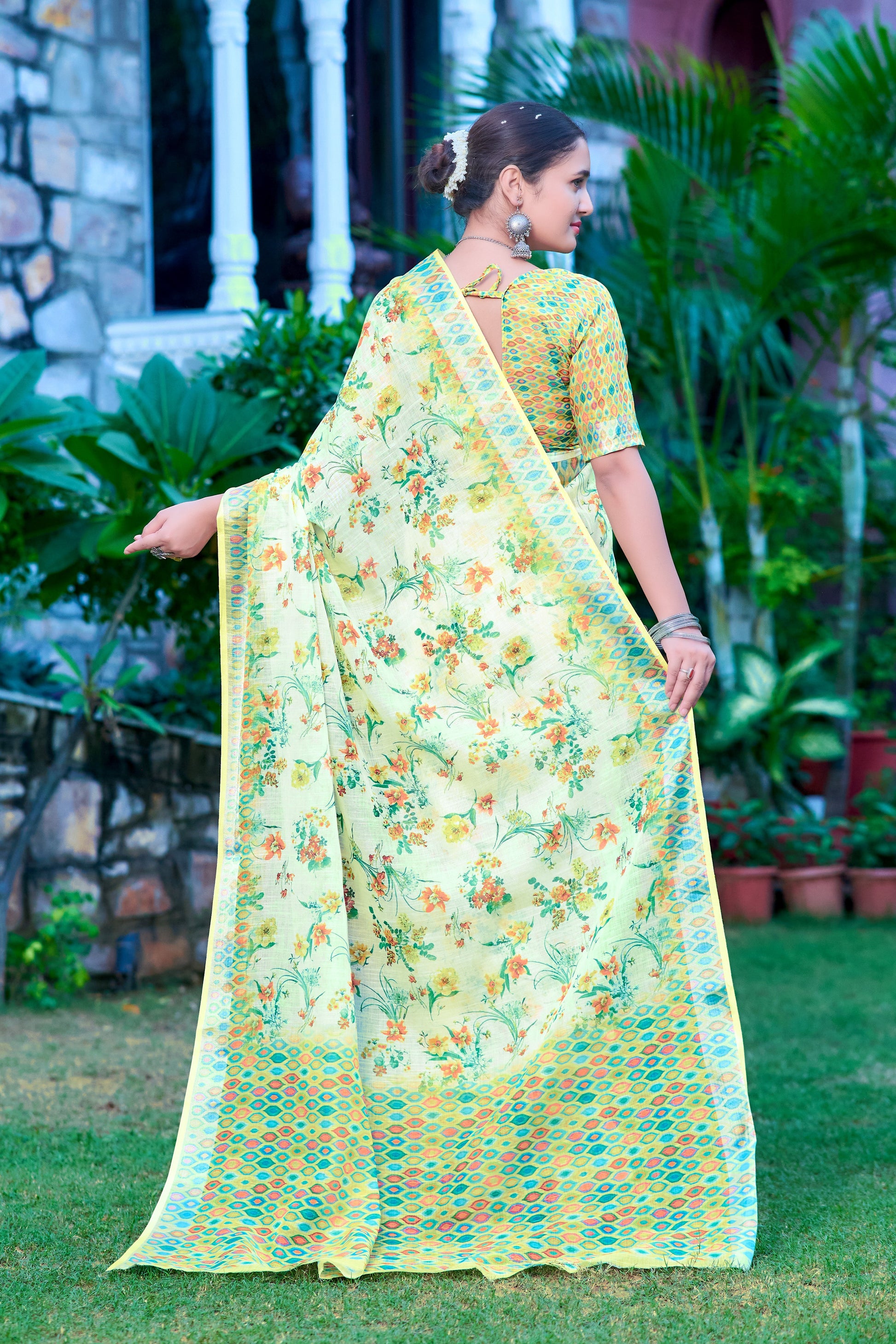 Design :- Zari Patta Pure Cotton Lilen Saree With Digital Print With Digital Blouse Pieces