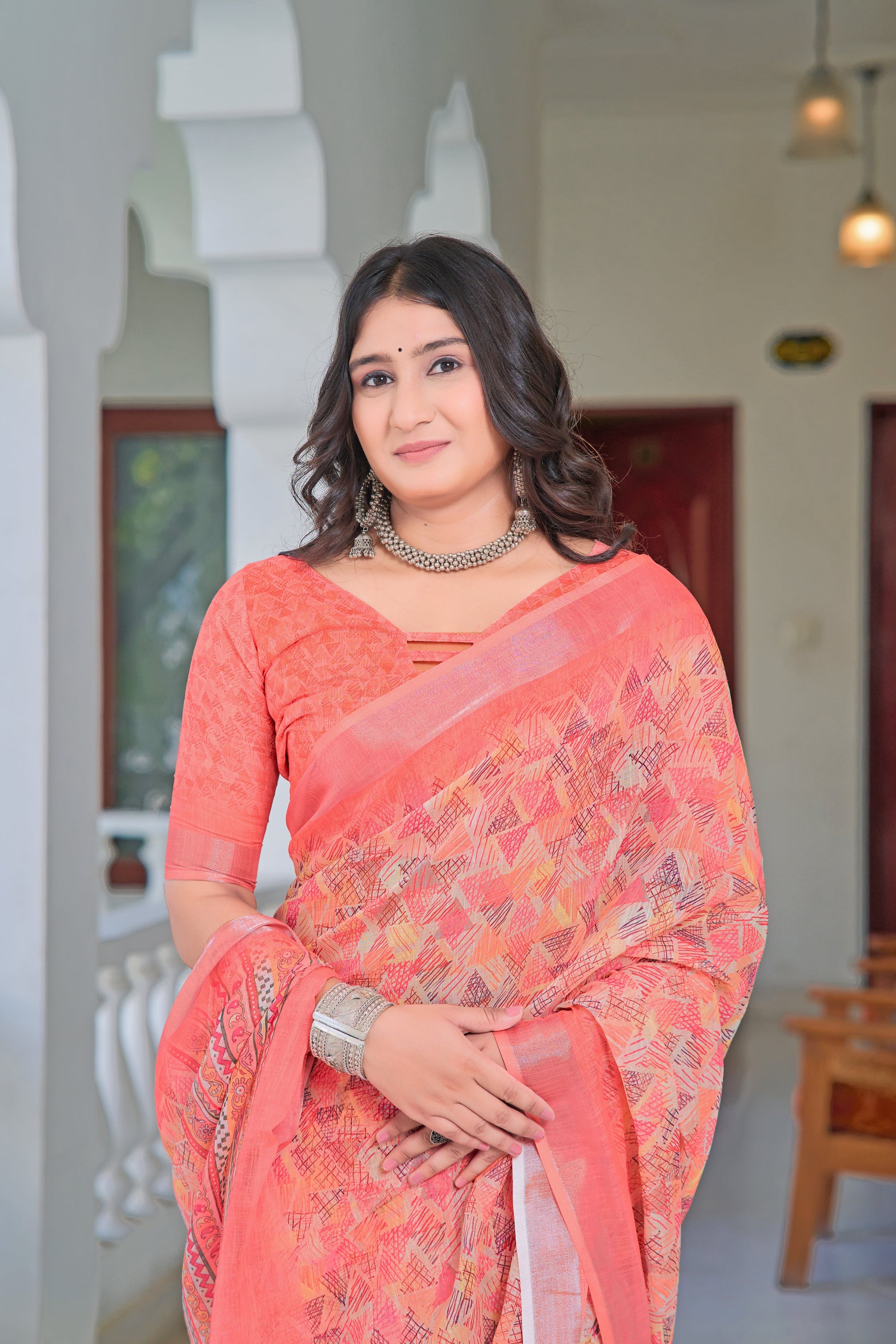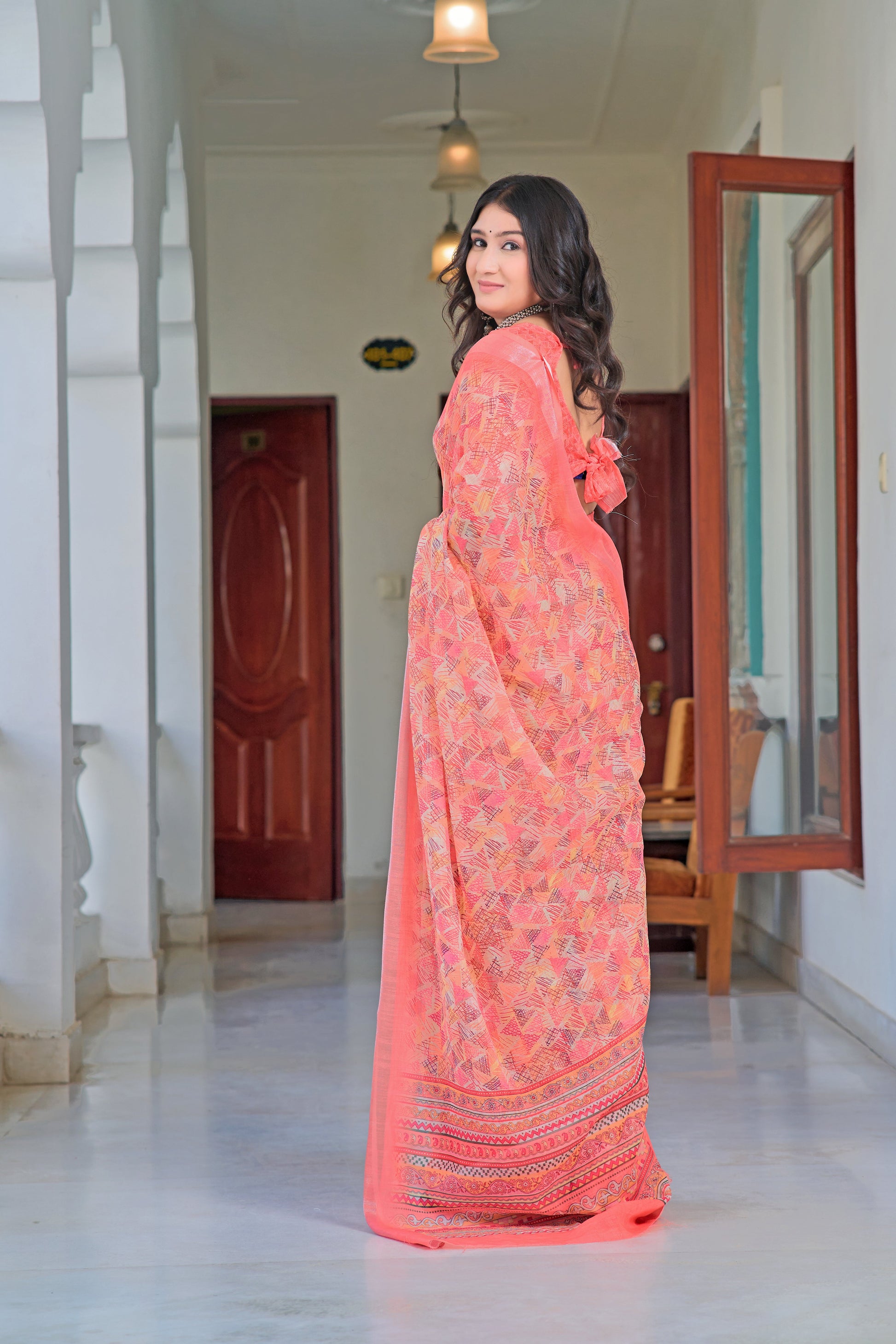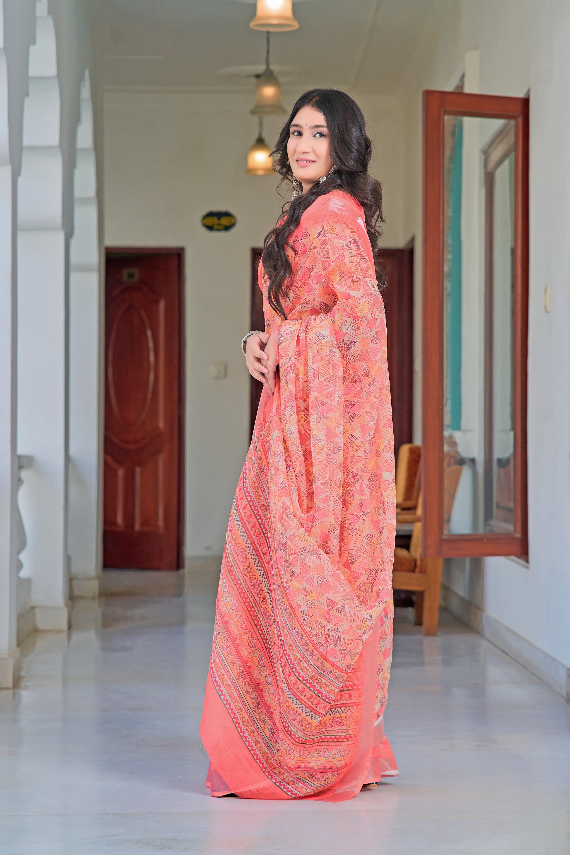 Glorious Peach Color Color Pure Cotton Lilen With Digital Printed Designer Saree