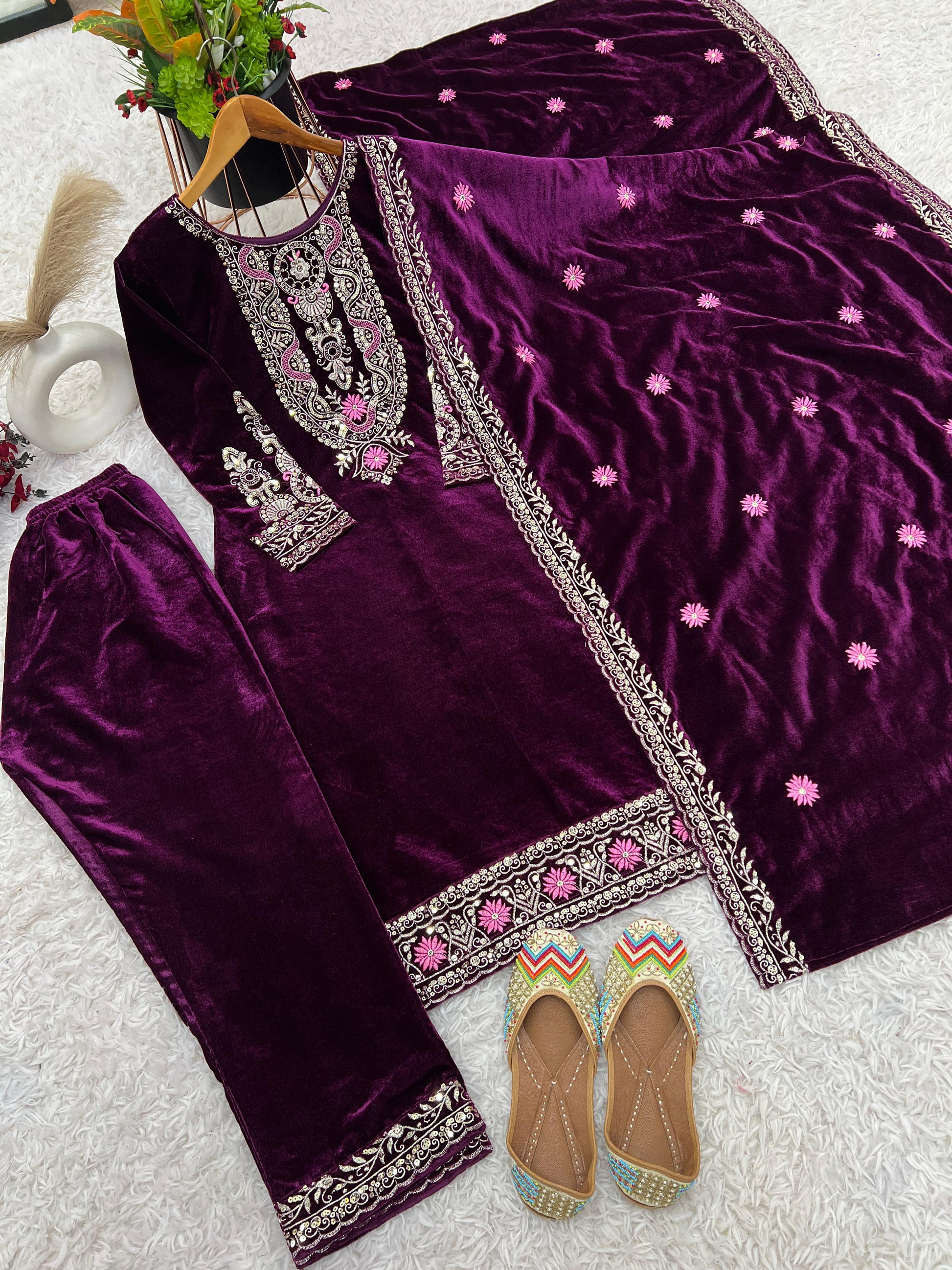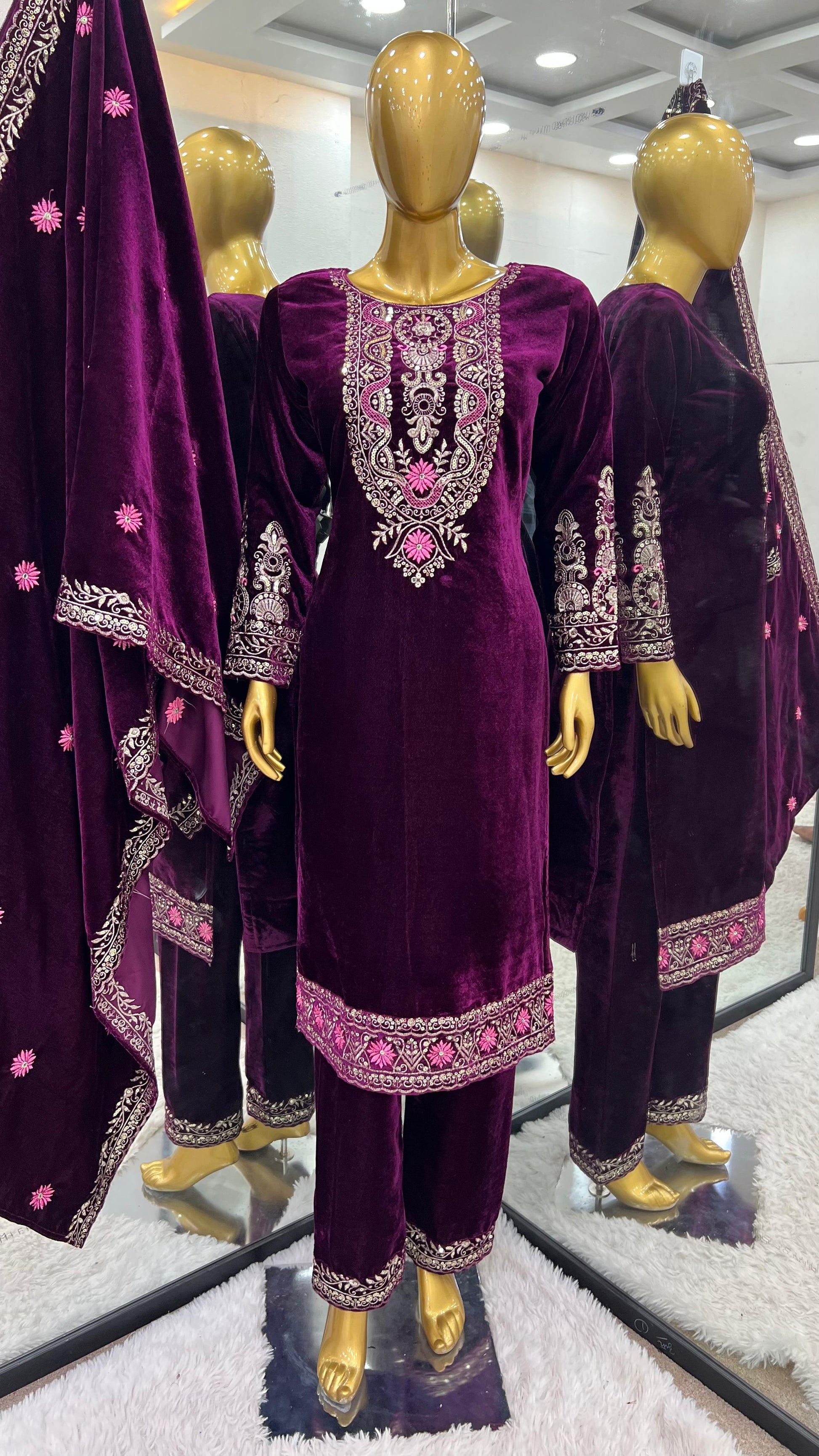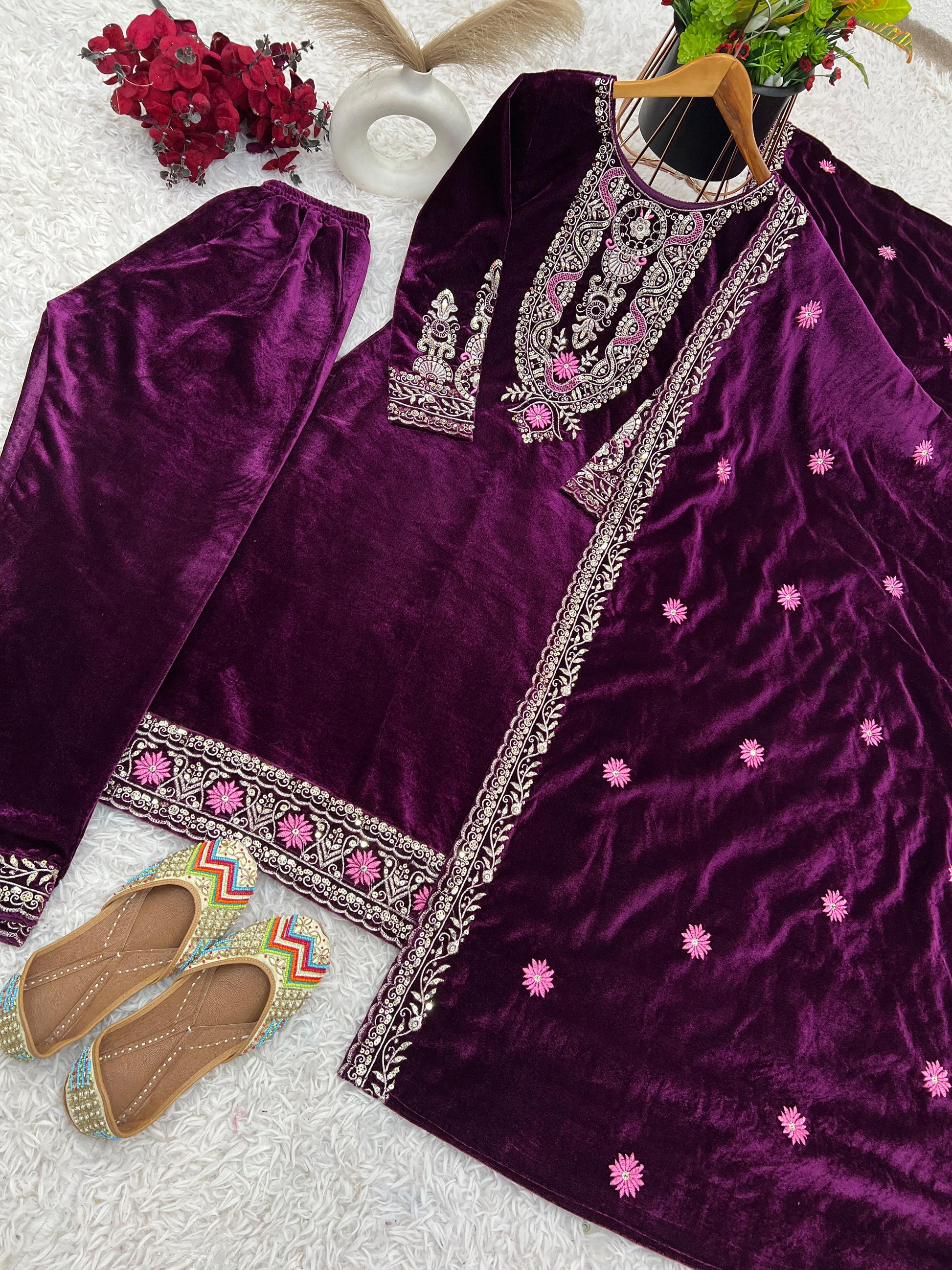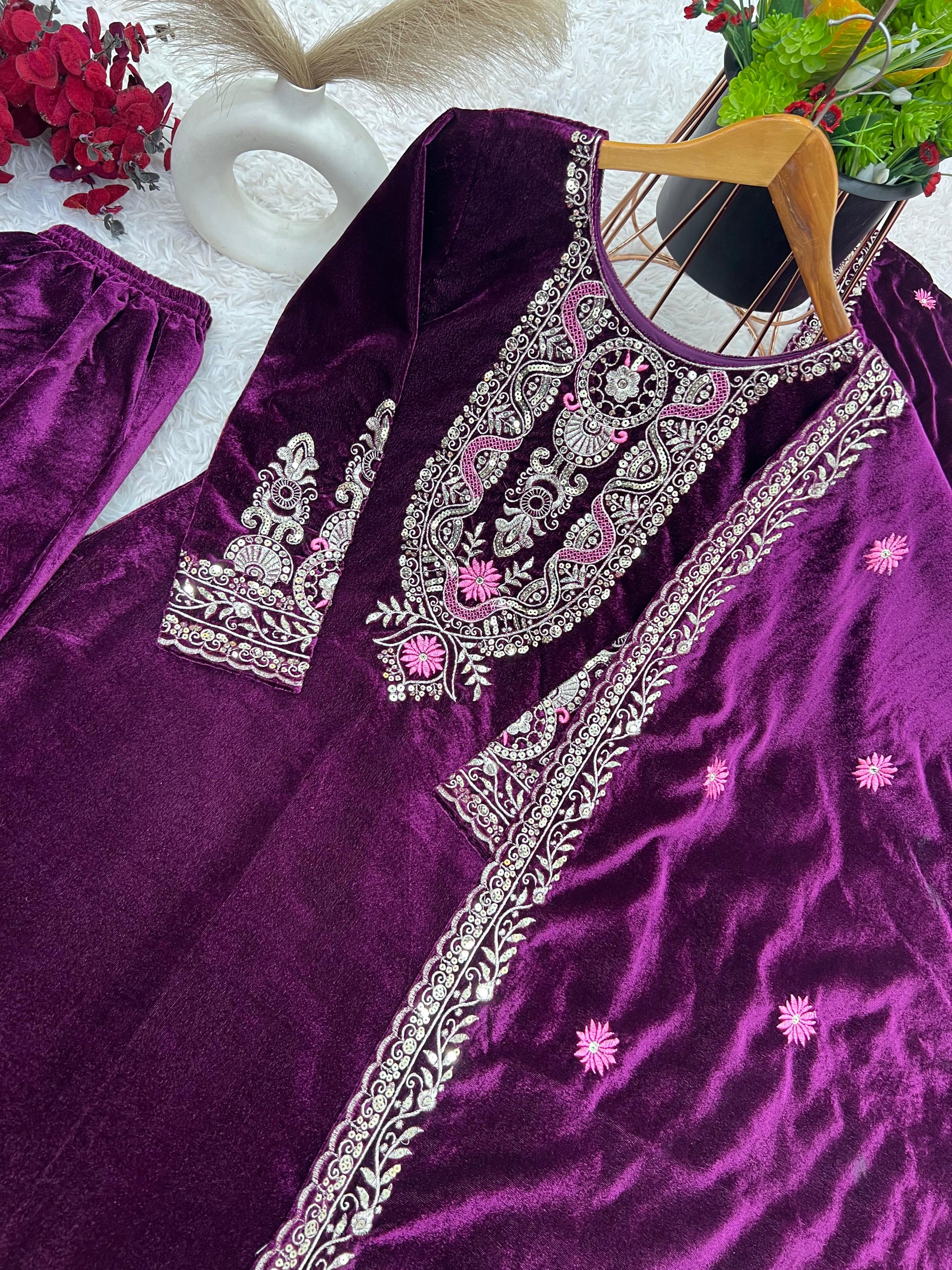 Glorious Purple Color Heavy Viscose Velvet With Heavy Embroidery Sequence Work Velvet Salwar Suit