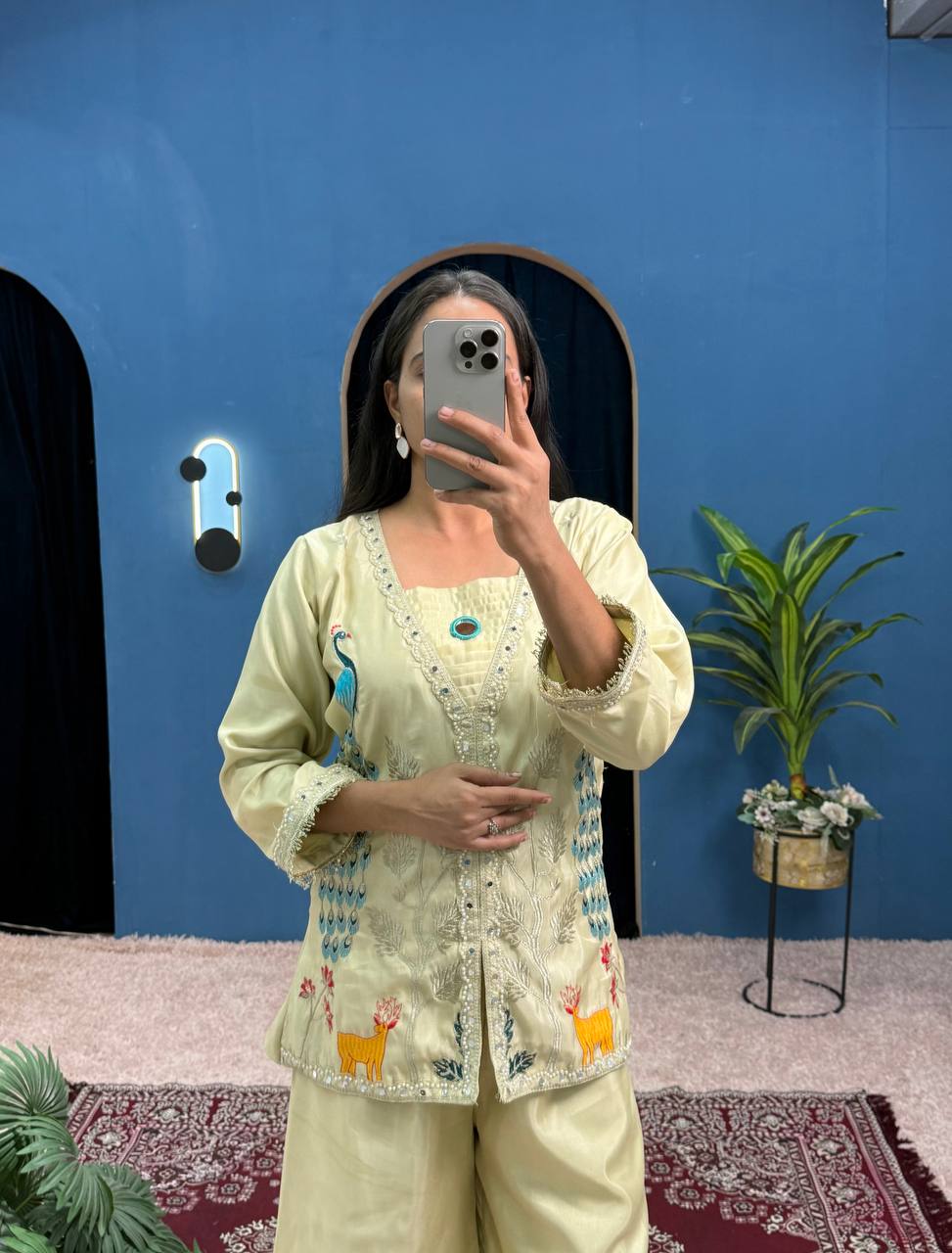 Glossy Trending Cream Color Full Embroidery With Mirror Work Co-Ord Palazzo Set
