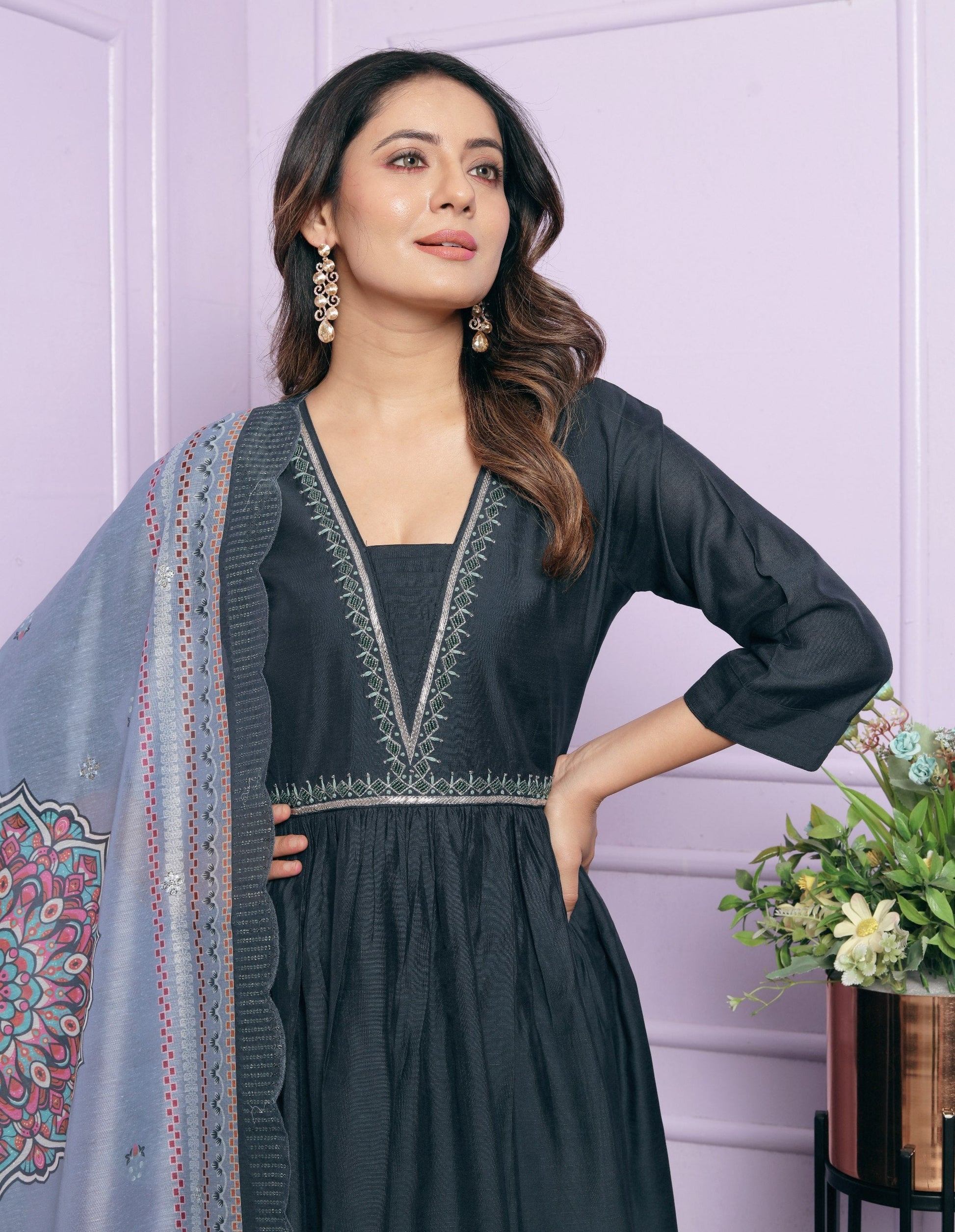 Gorgeous Dark Grey Color Work Palazzo Suit