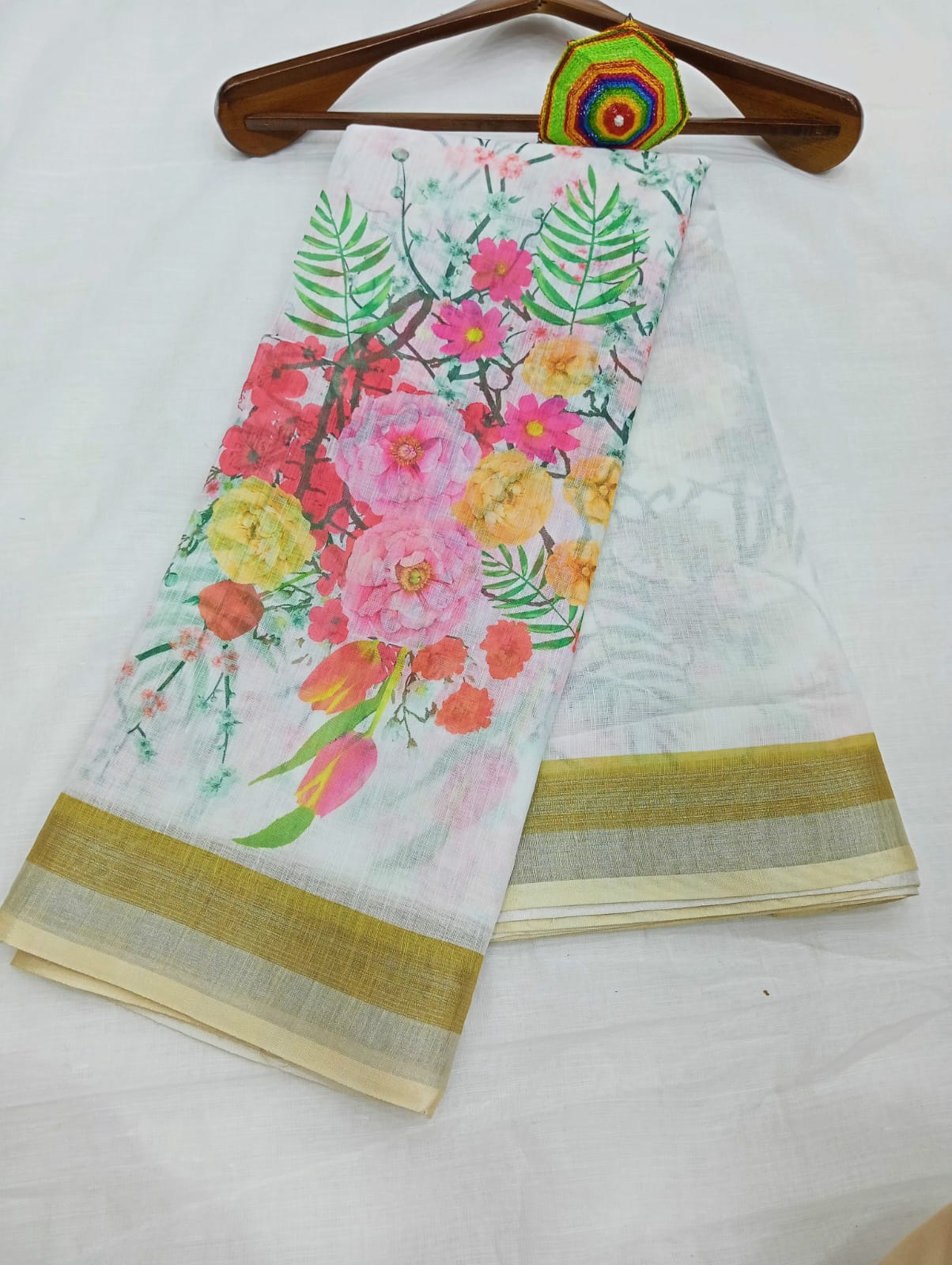 Design :- Zari Patta Pure Cotton Lilen Saree With Digital Print With Digital Blouse Pieces