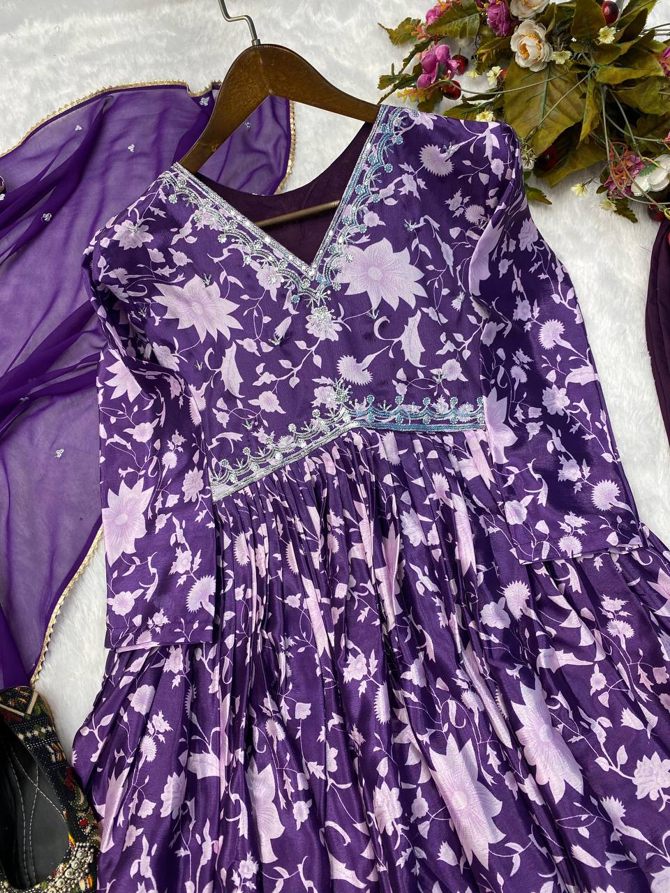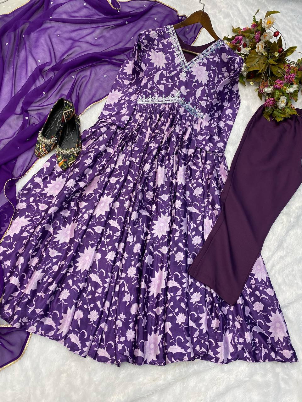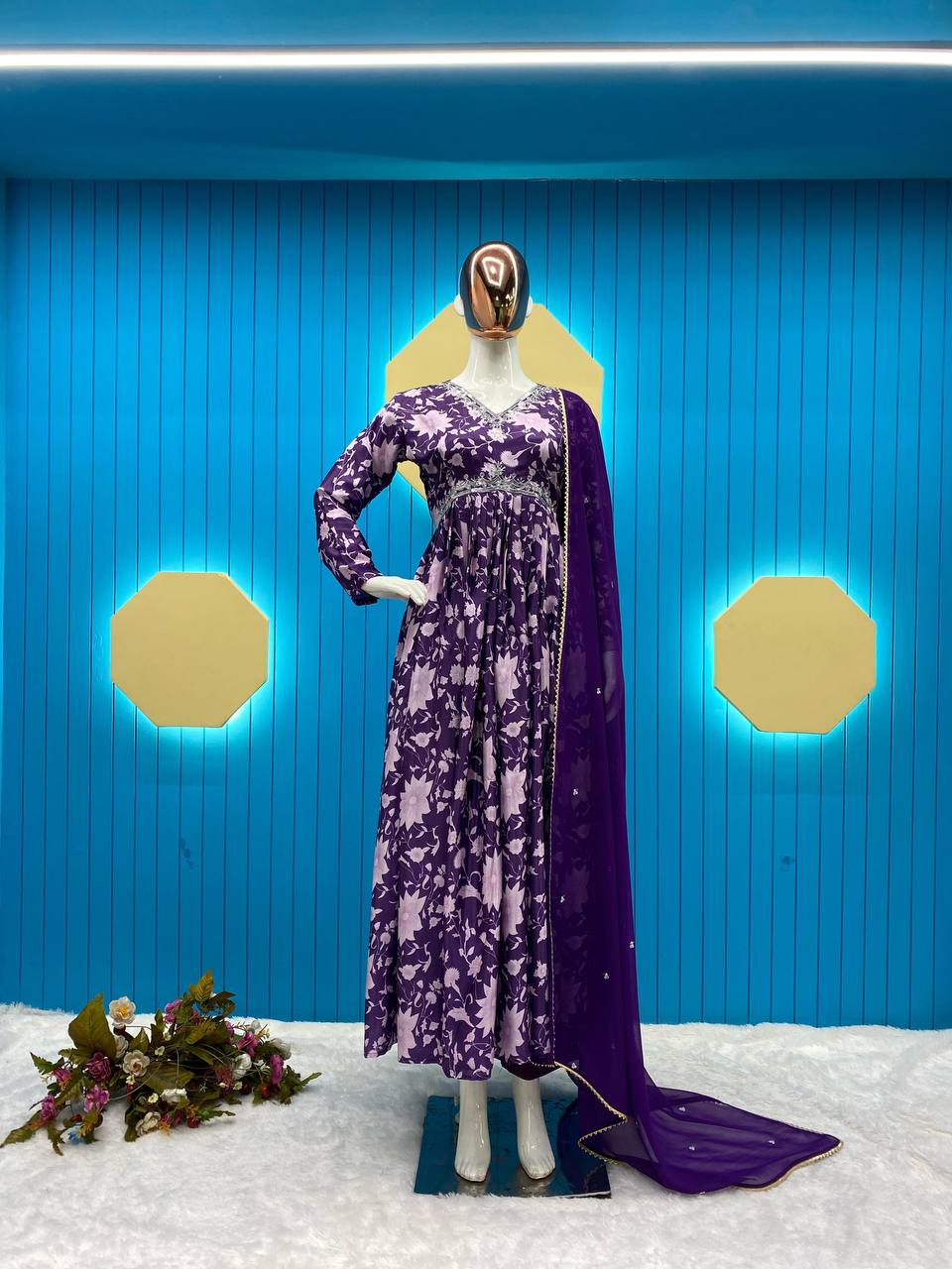 | Work | Print And Sequence Embroidery Work And 3meter Flair With Sleeves |