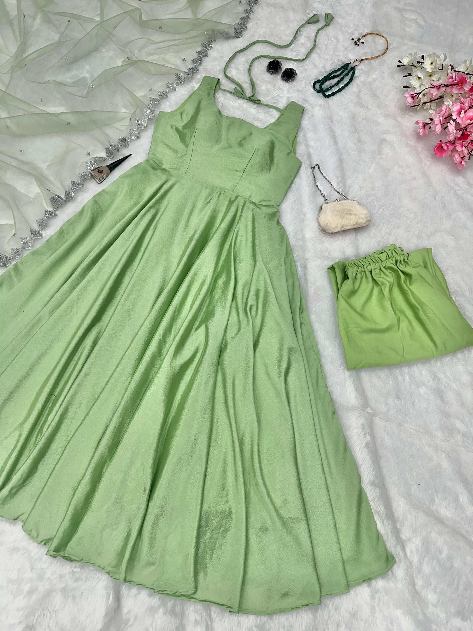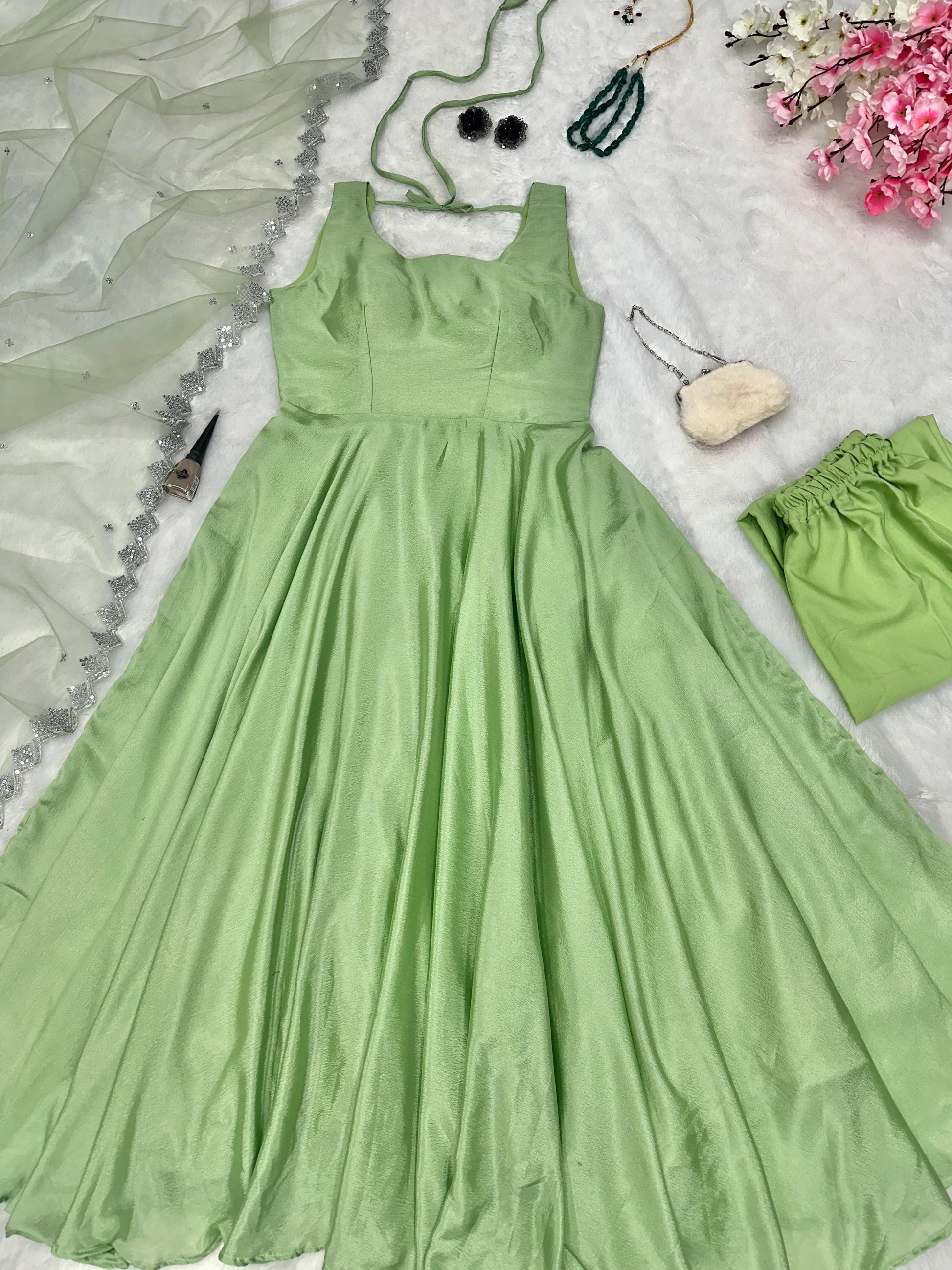 Green Chinon Plain Anarkali GownWith Work Dupatta