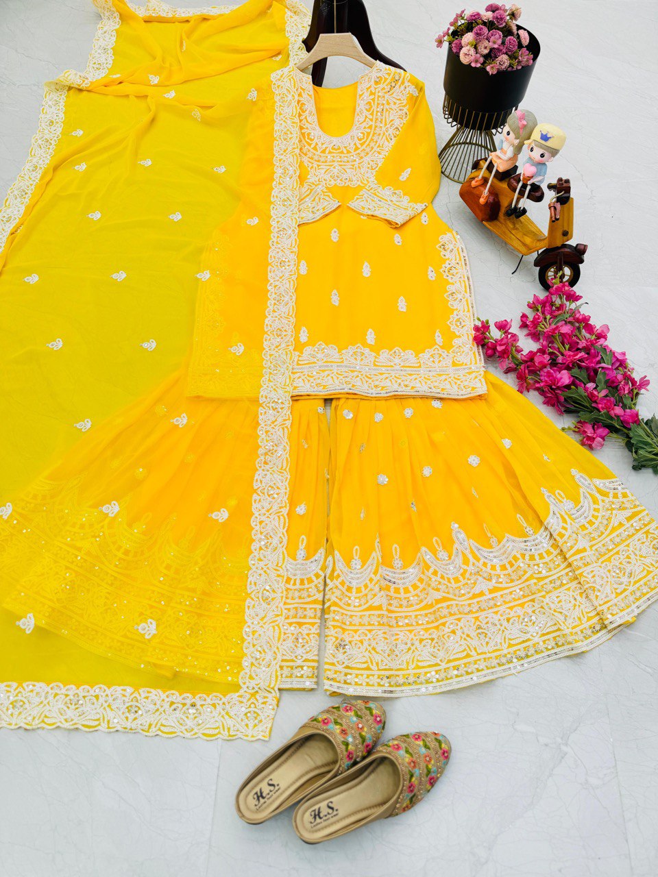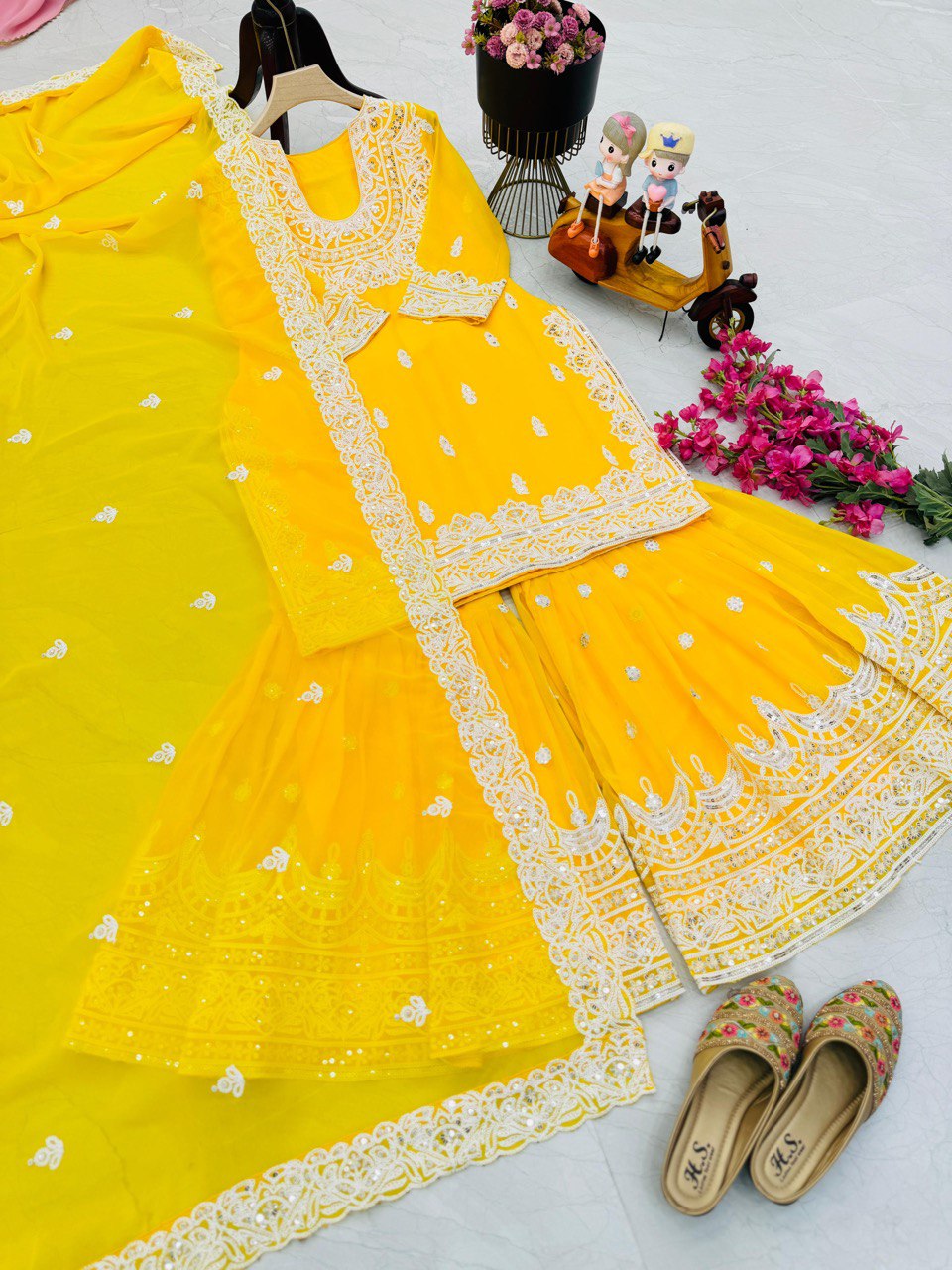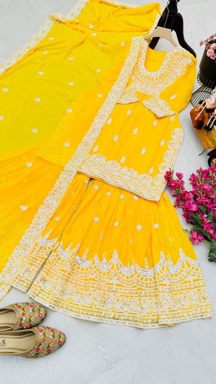 Haldi Wear Faux Georgette And Codding Embroidery Sequence Work Sharara Suit