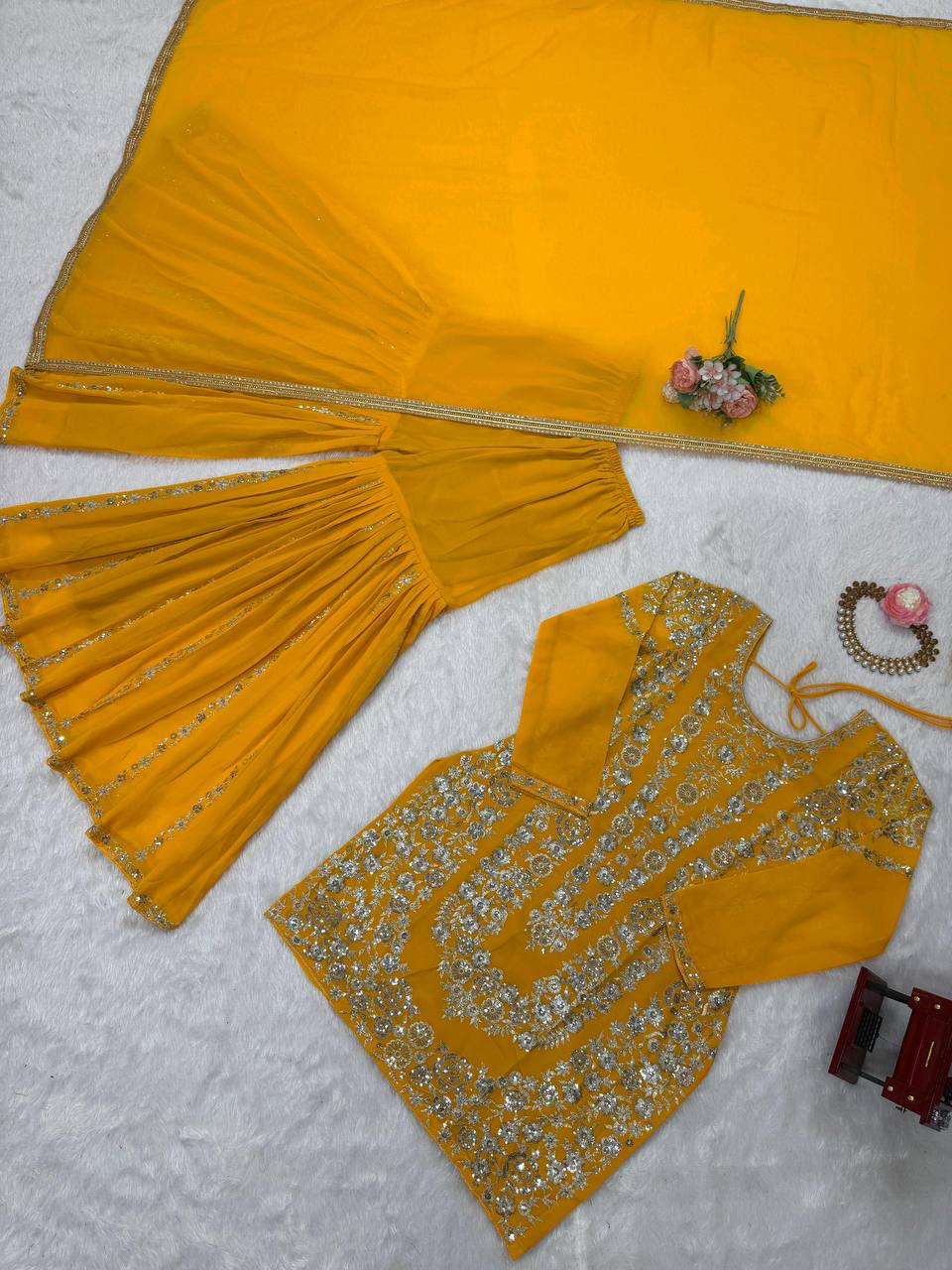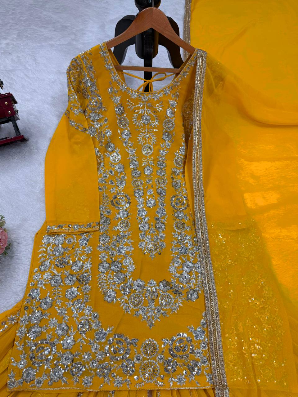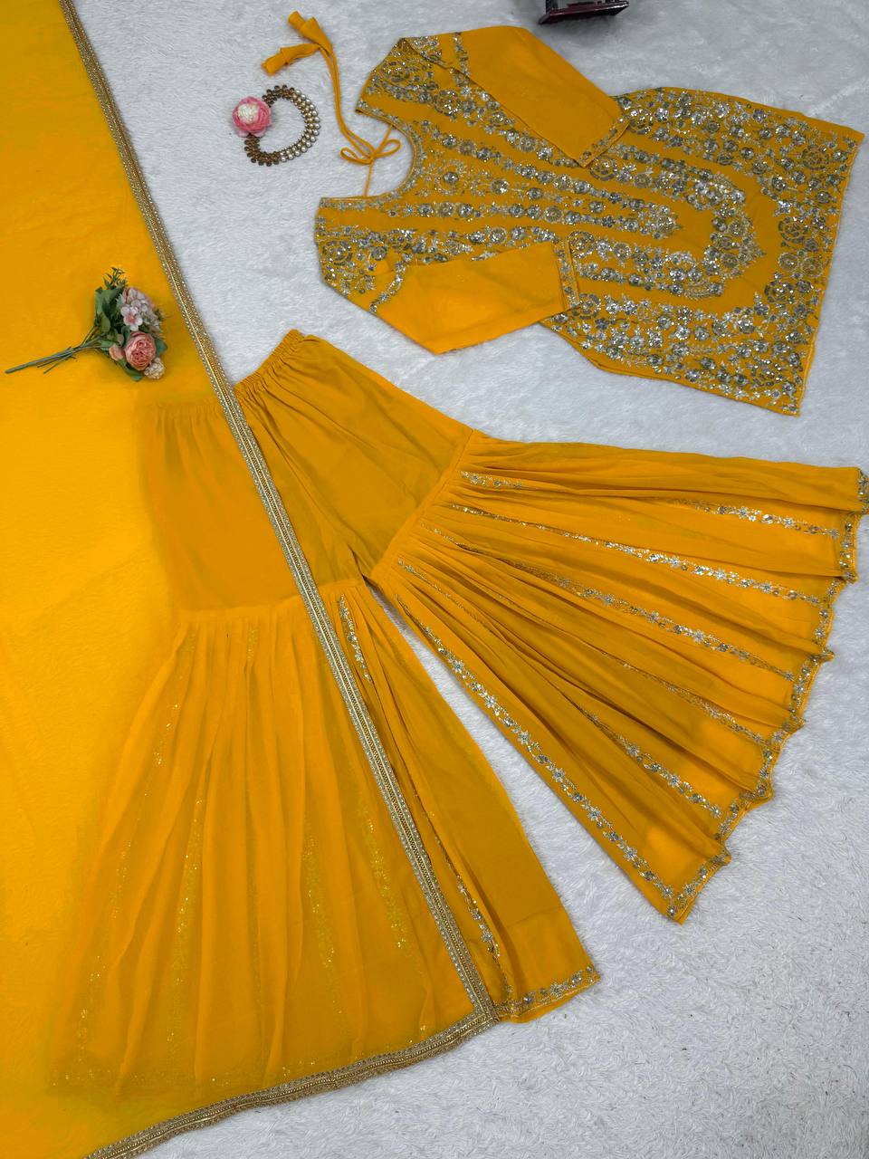 Haldi Wear Yellow Color Thread With Sequin Embroidery Work Sharara Suit