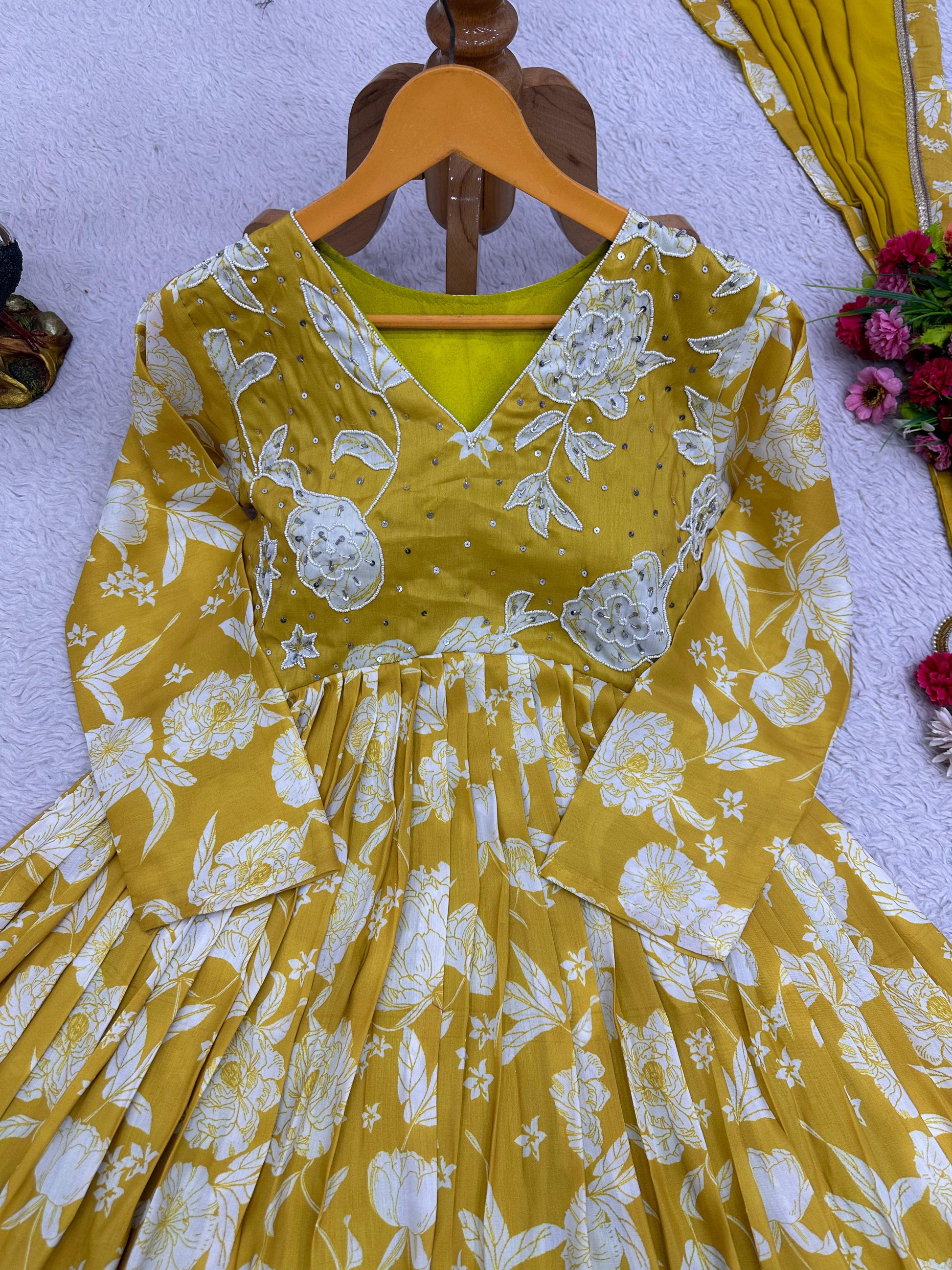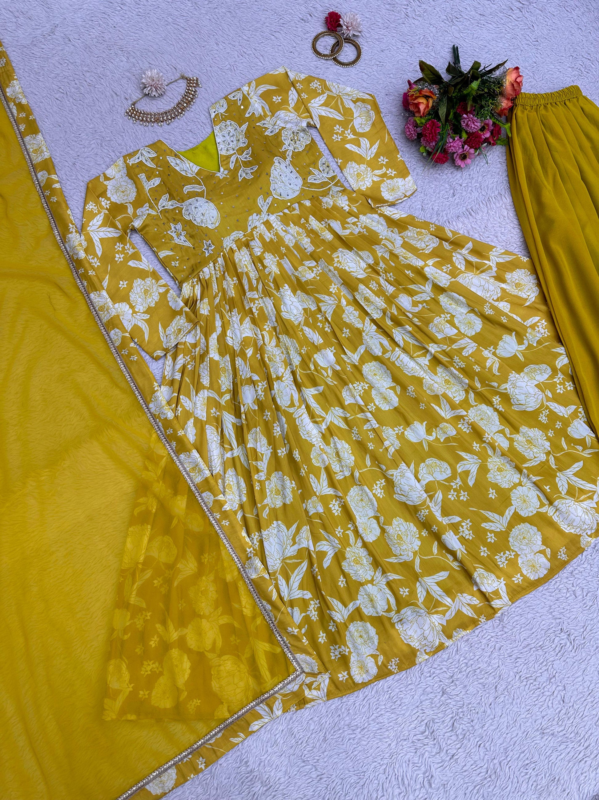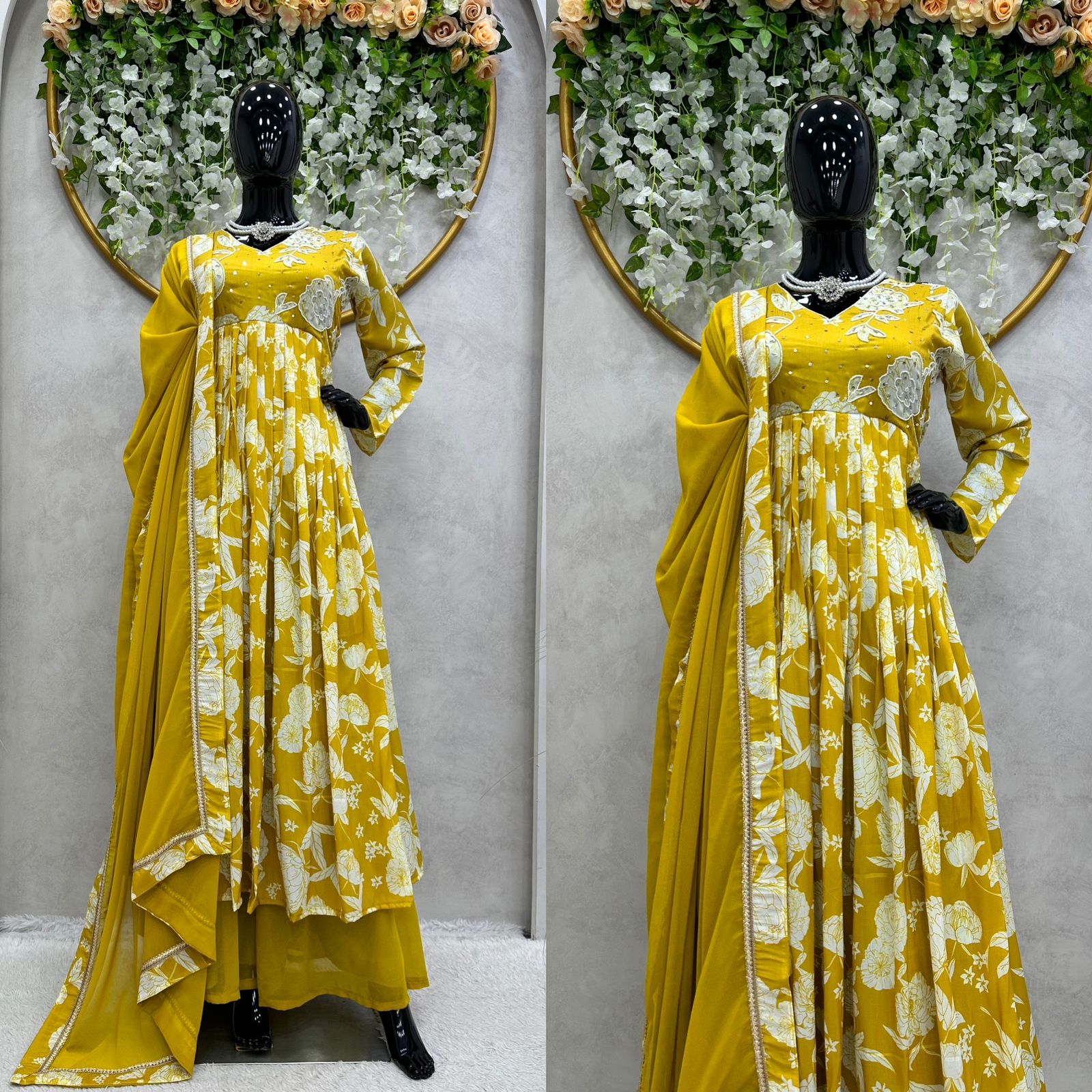 Hand Work With Digital Print Yellow Gown With Palazzo