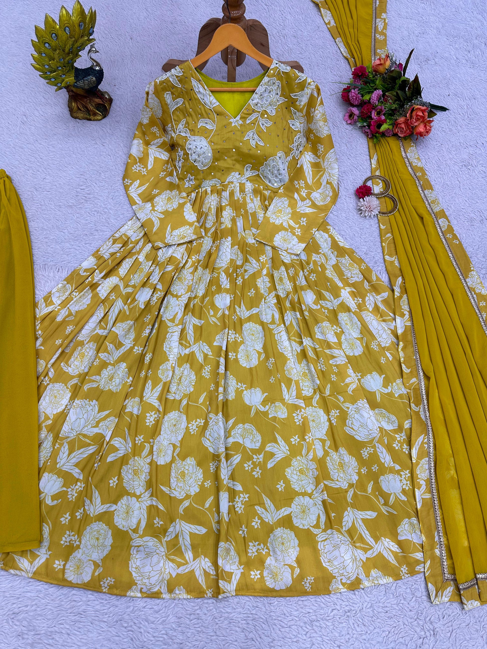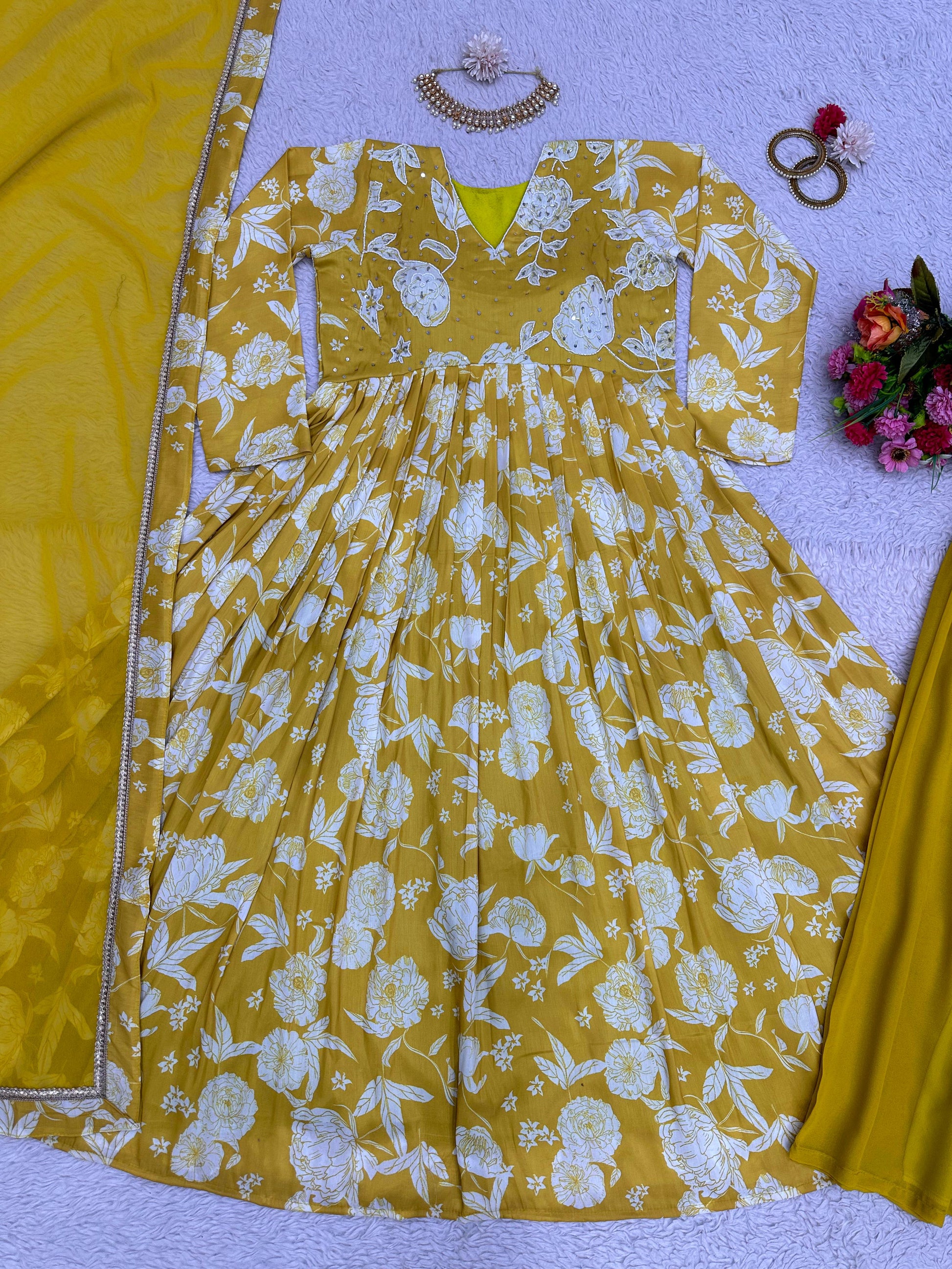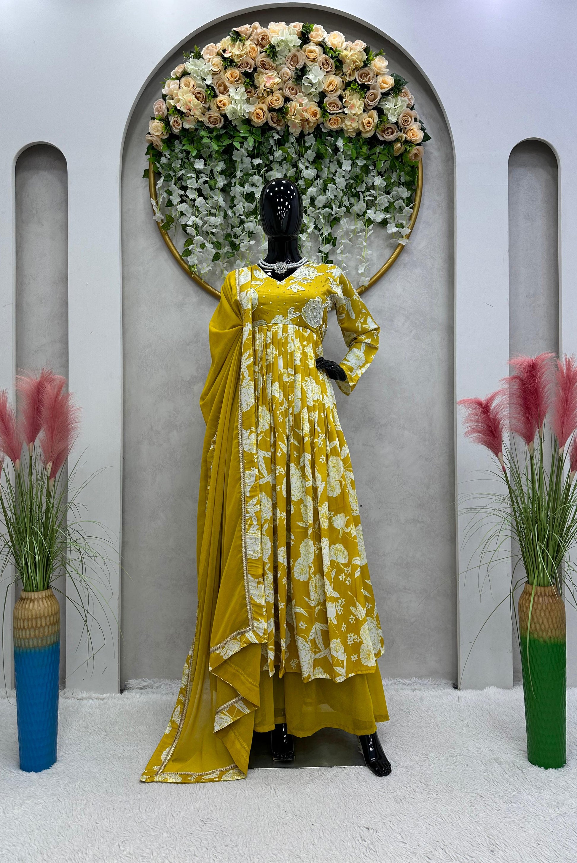 Hand Work With Digital Print Yellow Gown With Palazzo