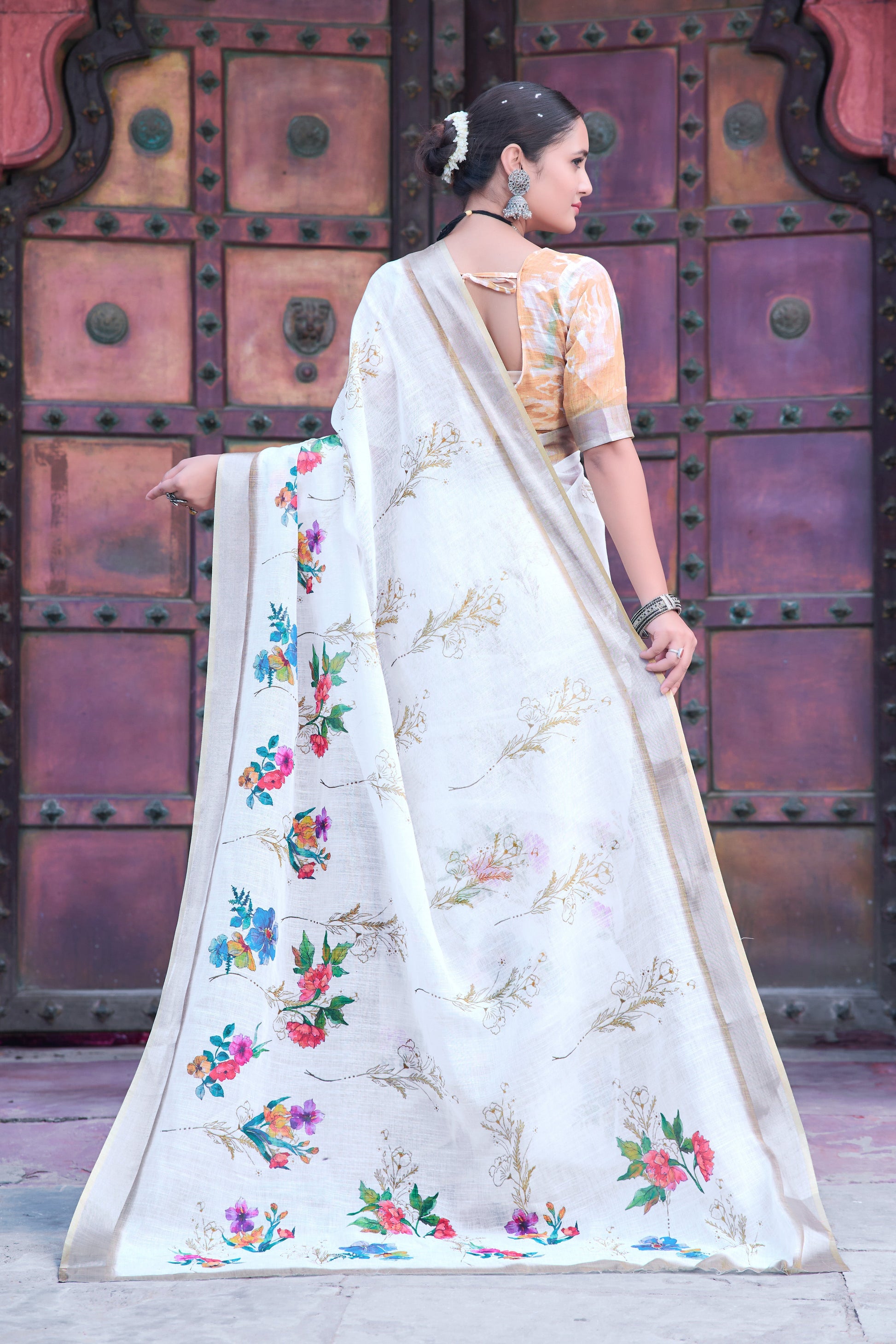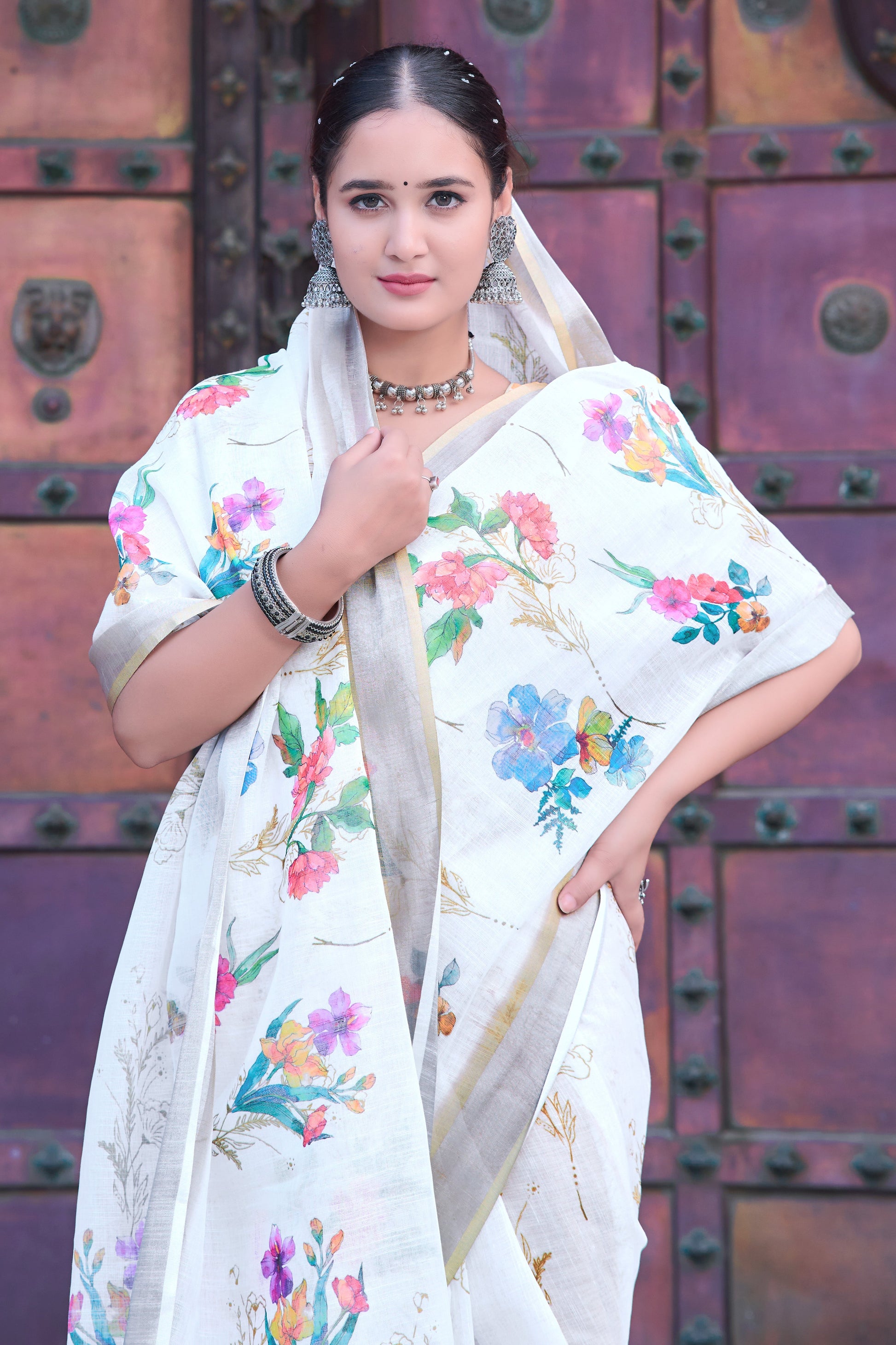 Imposing Off White Color Color Pure Cotton Lilen With Digital Printed Designer Saree