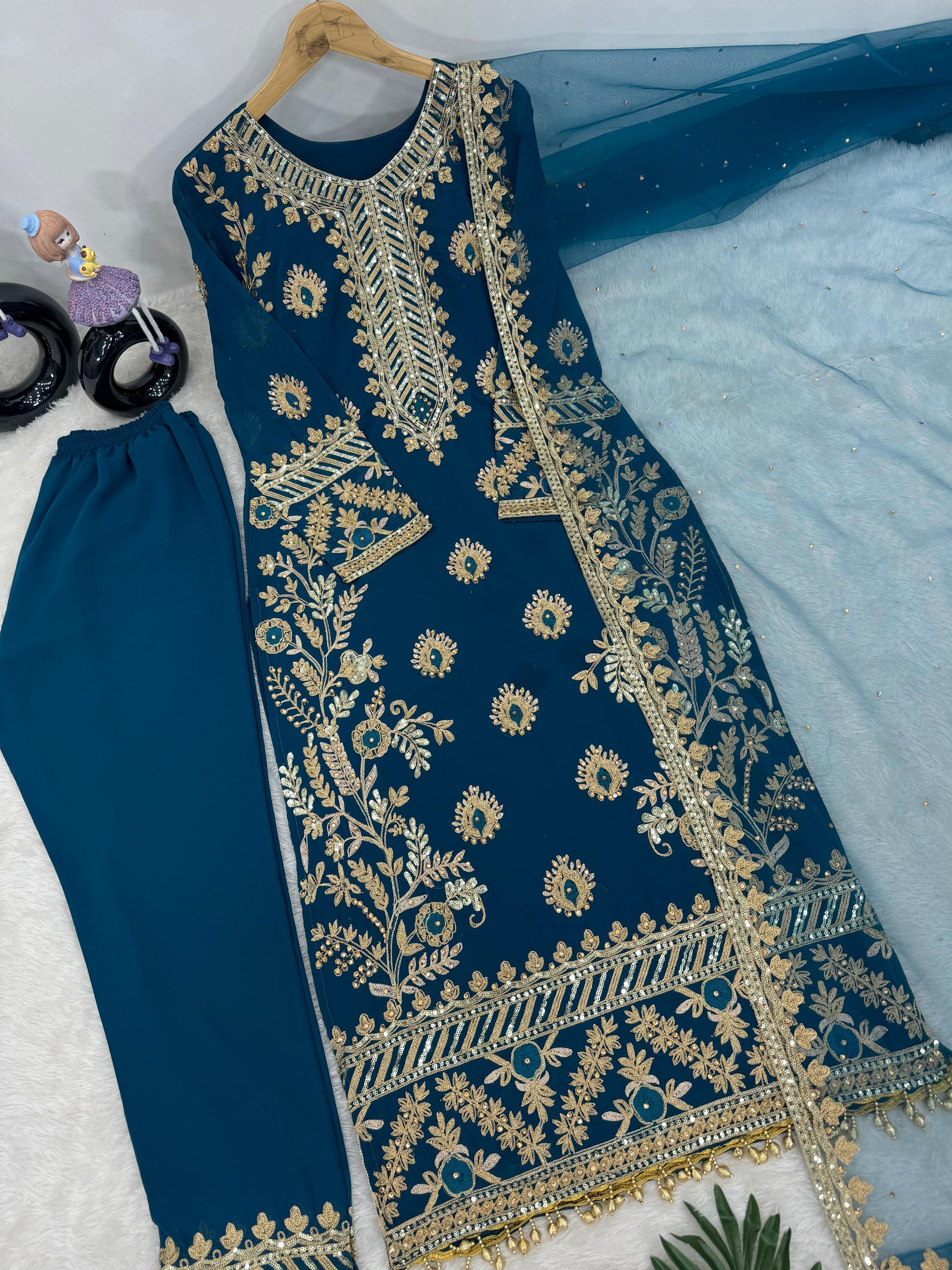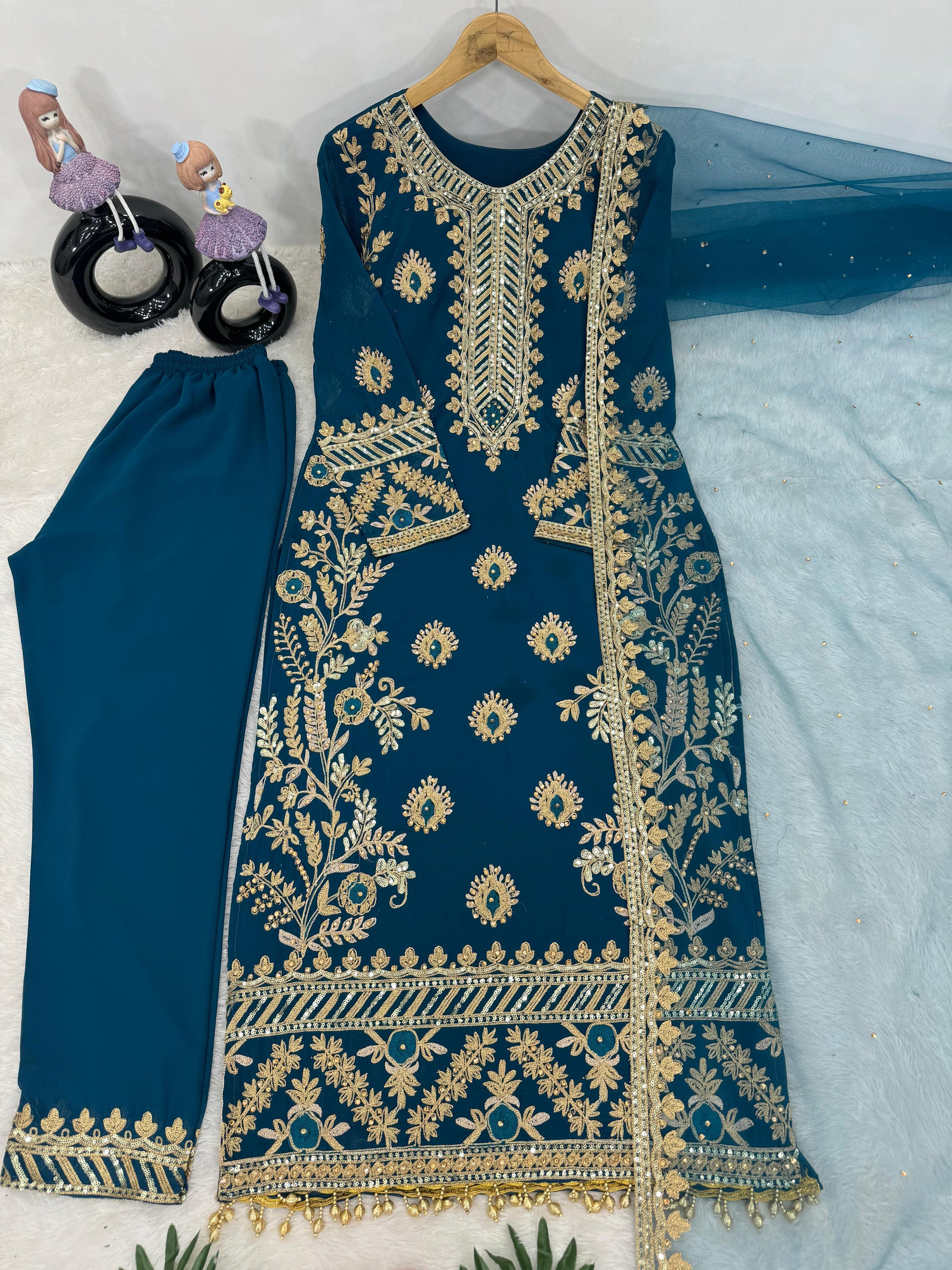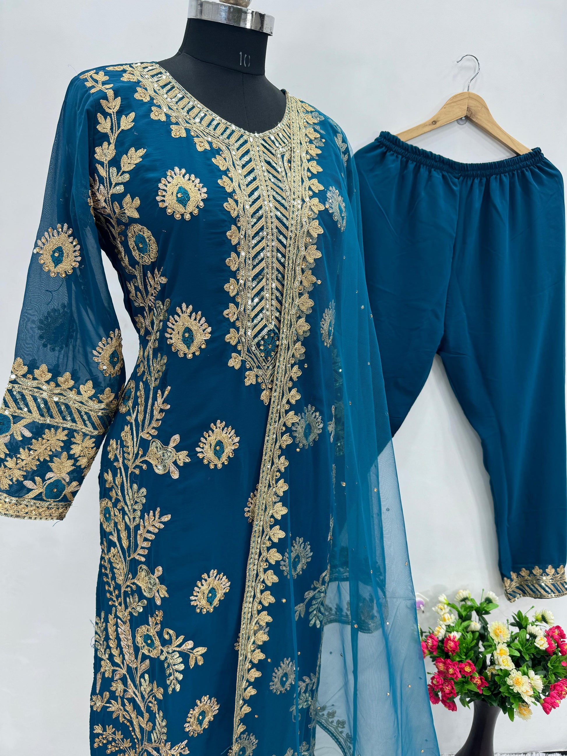 Latest Rama Color Heavy Faux Georgette And Chain Sequence Work Designer Pakistani Salwar Suit