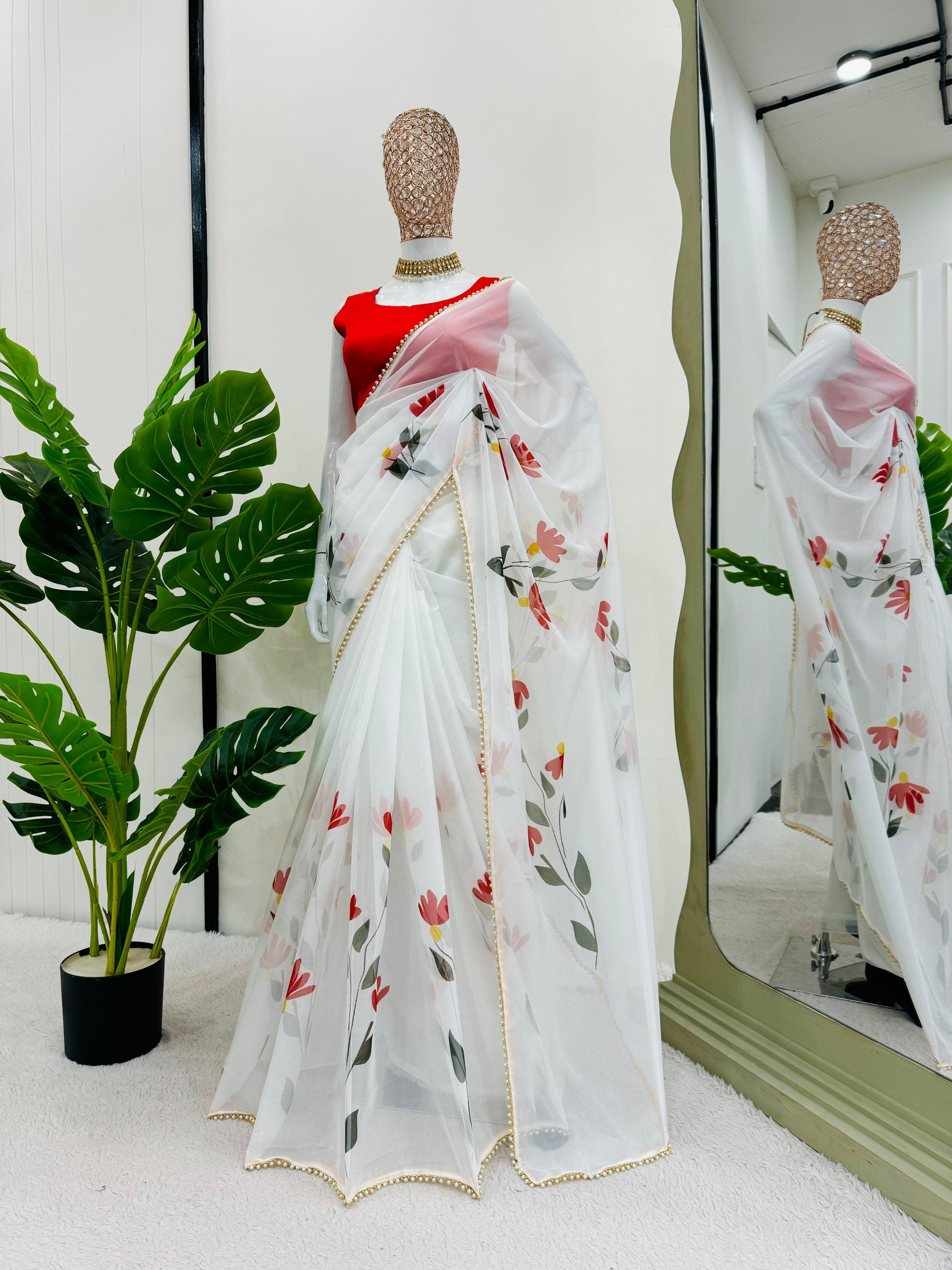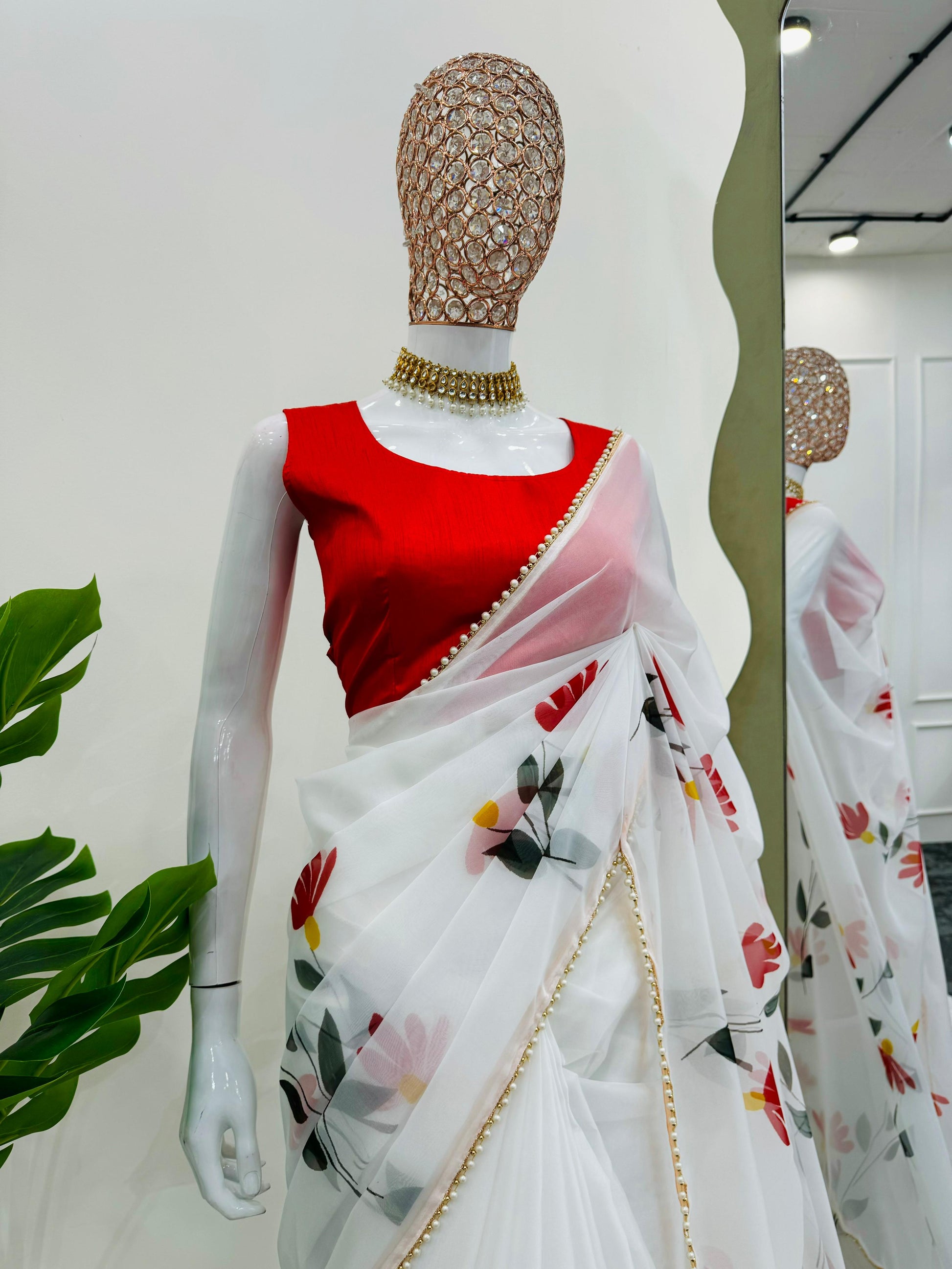 Luxuriant White Color Tabby Silk Digital Print With Pearl Work Fancy Lace Saree