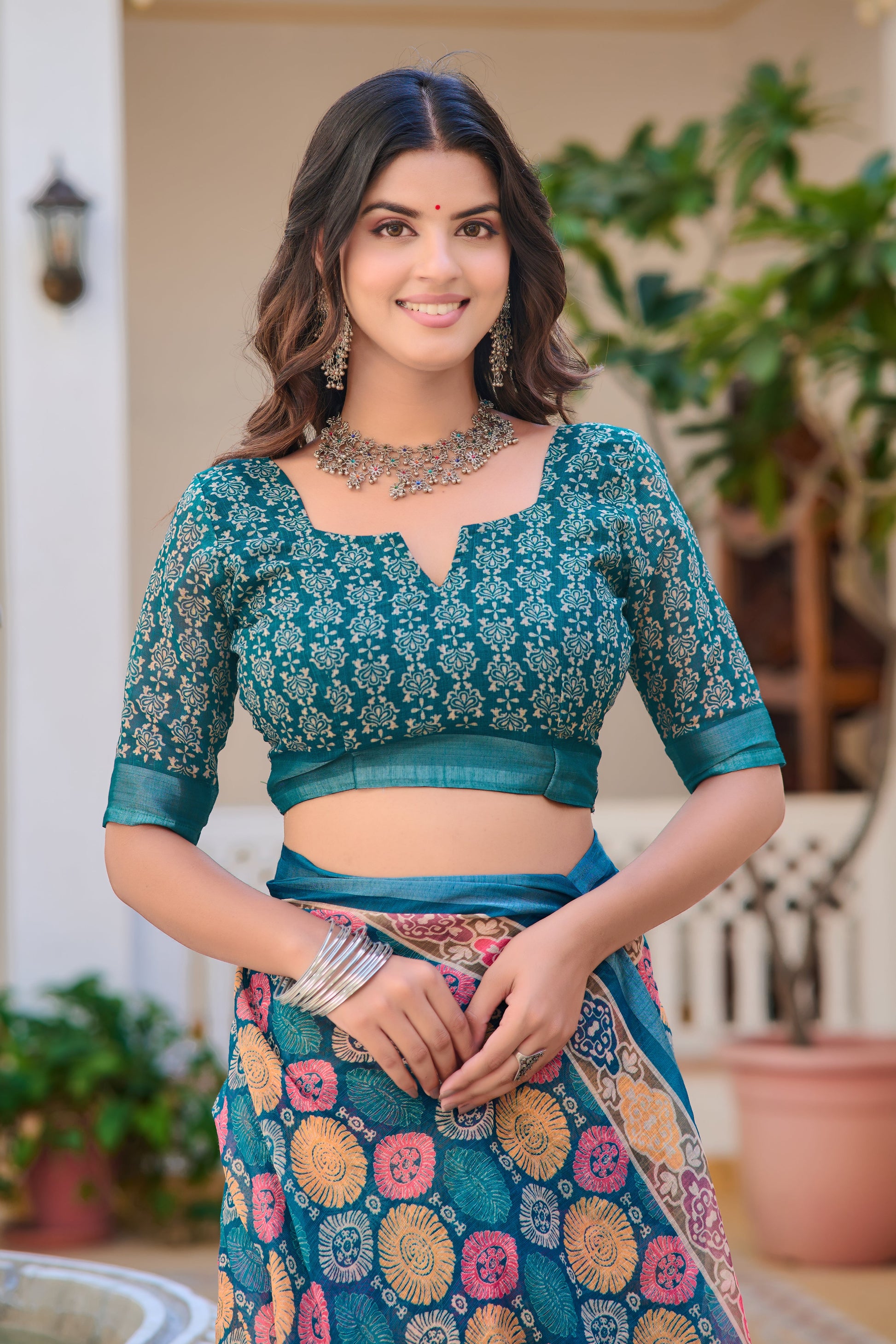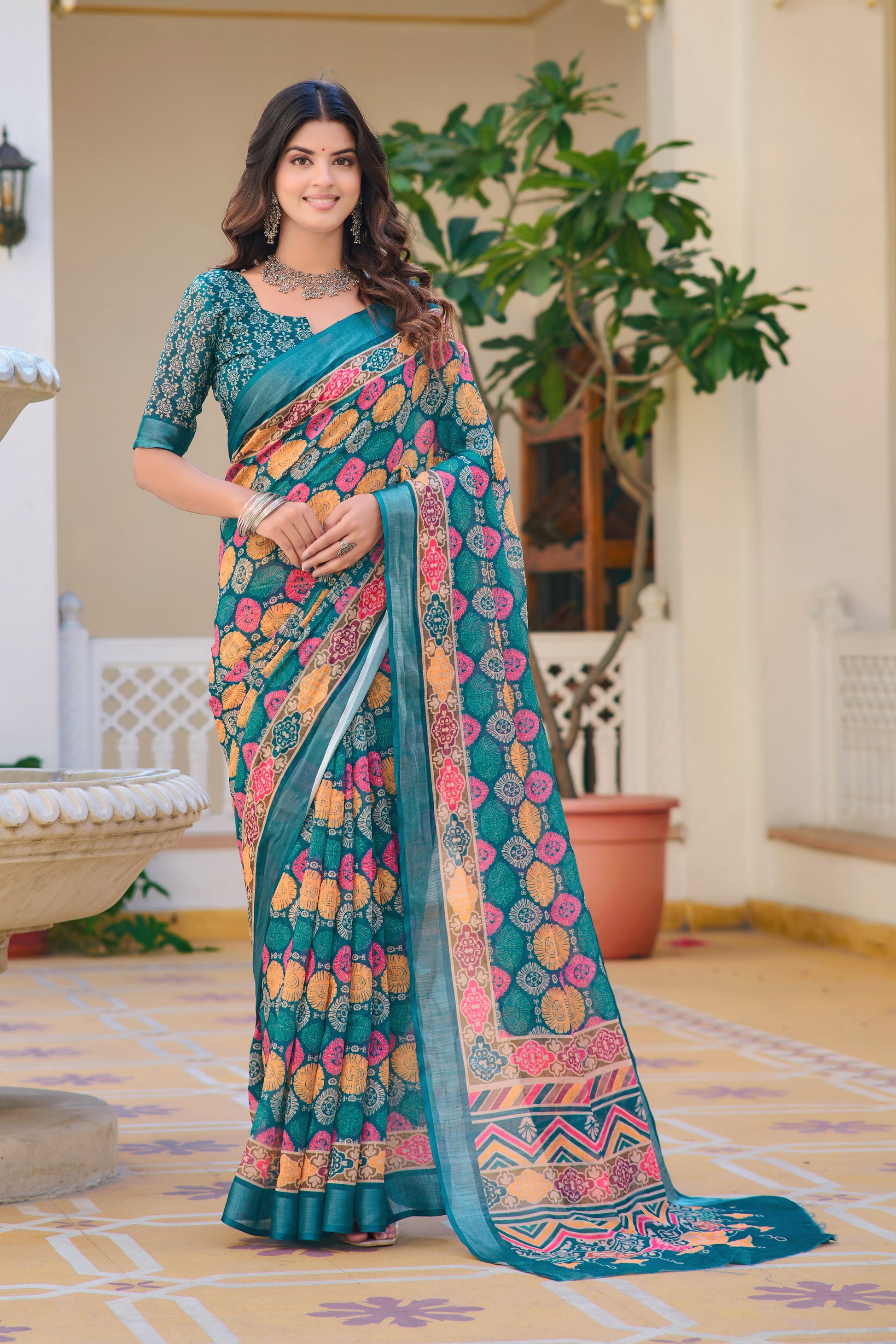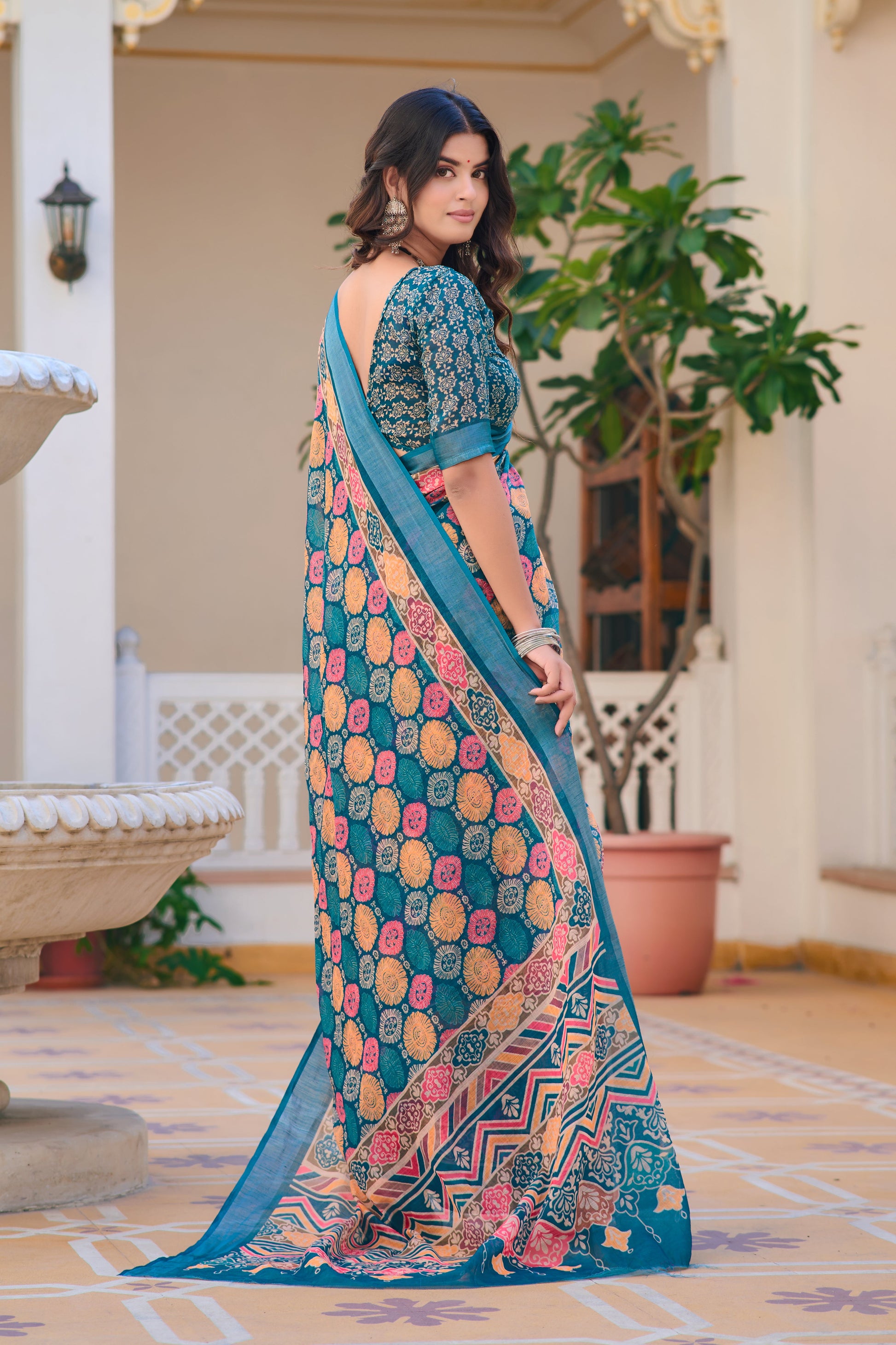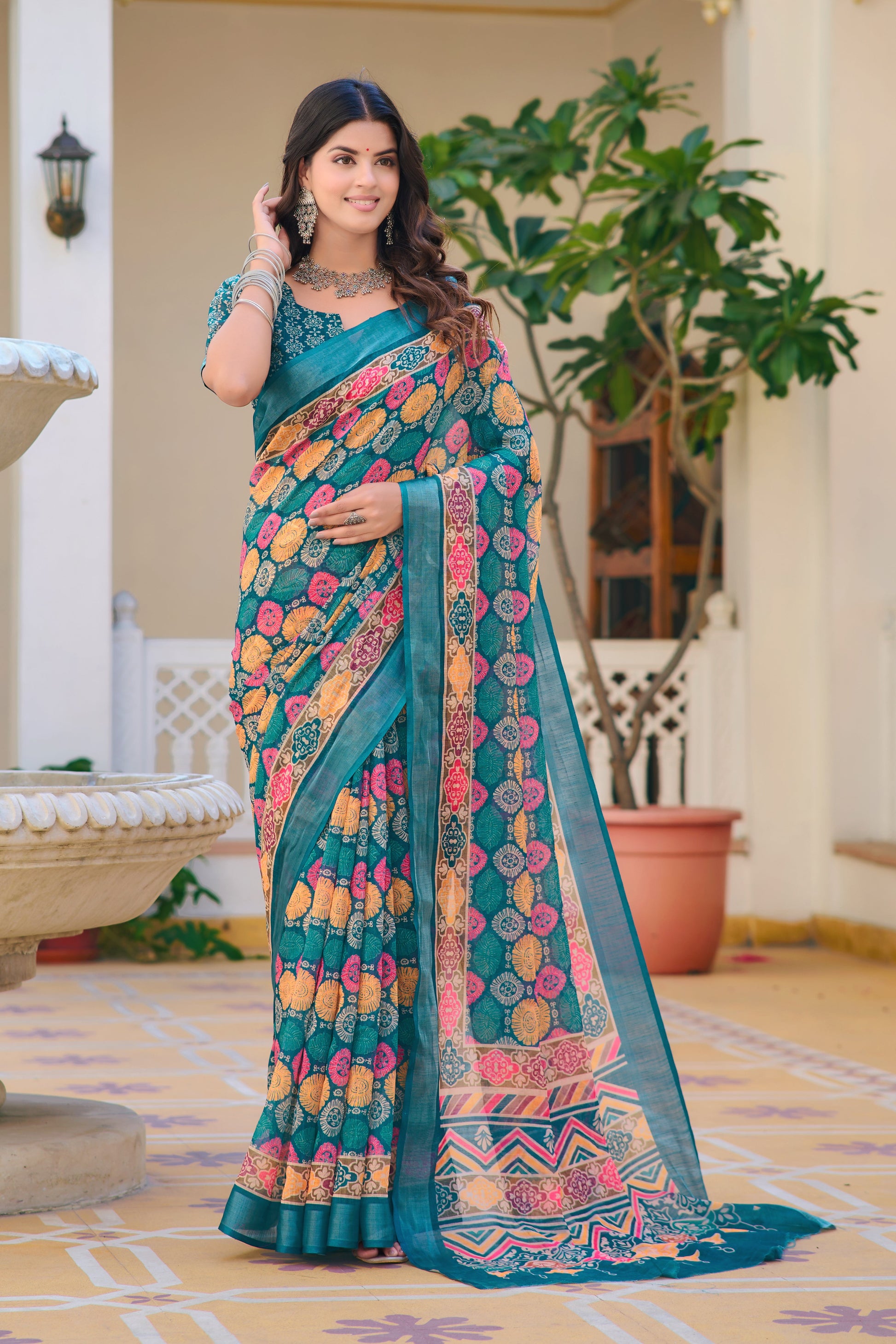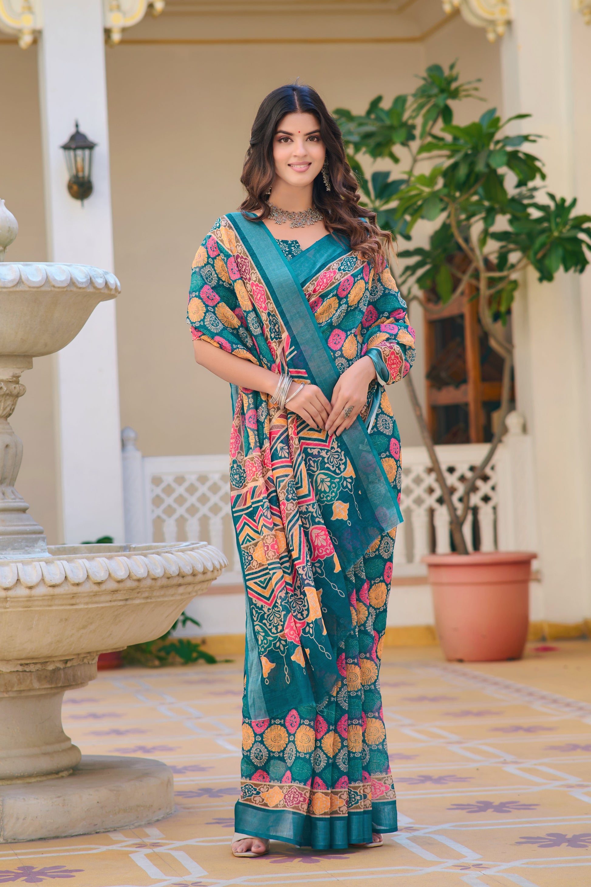 Luxury Sky Blue Color Color Pure Cotton Lilen With Digital Printed Designer Saree