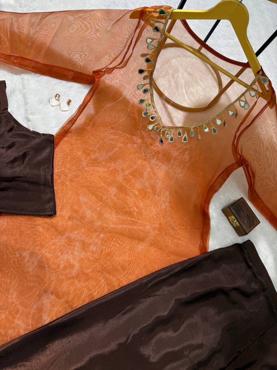 Mesmerizing Coffee Color Organza With Mirror Lace Work Fully Stitch Salwar Suit