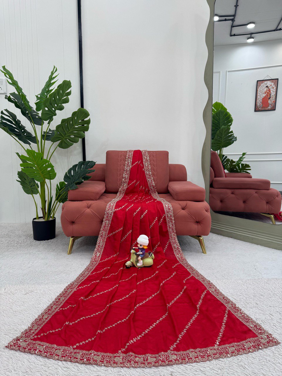 Mesmerizing Red Color Chinon Silk With Thread And Sequence Work Designer Saree