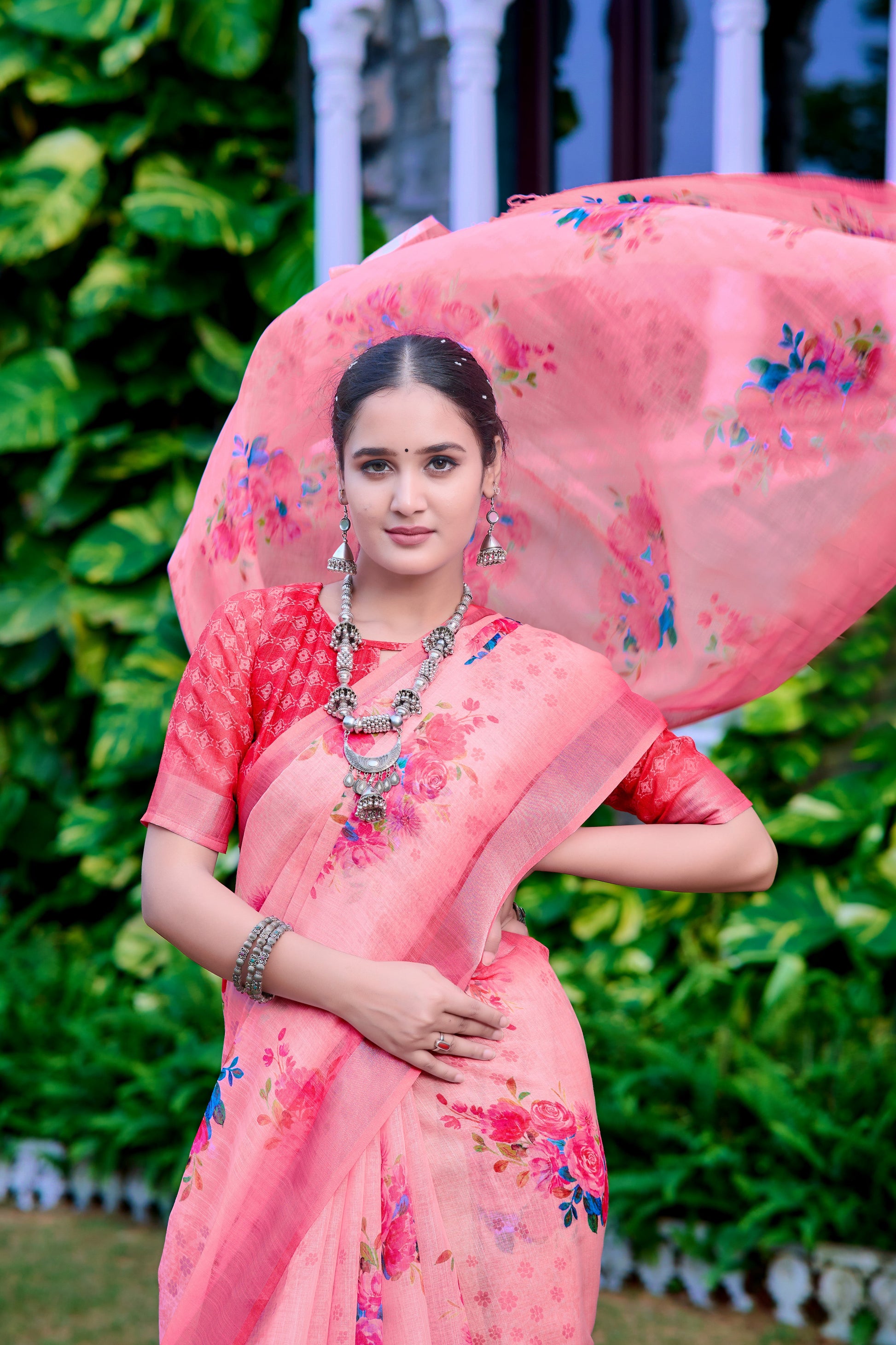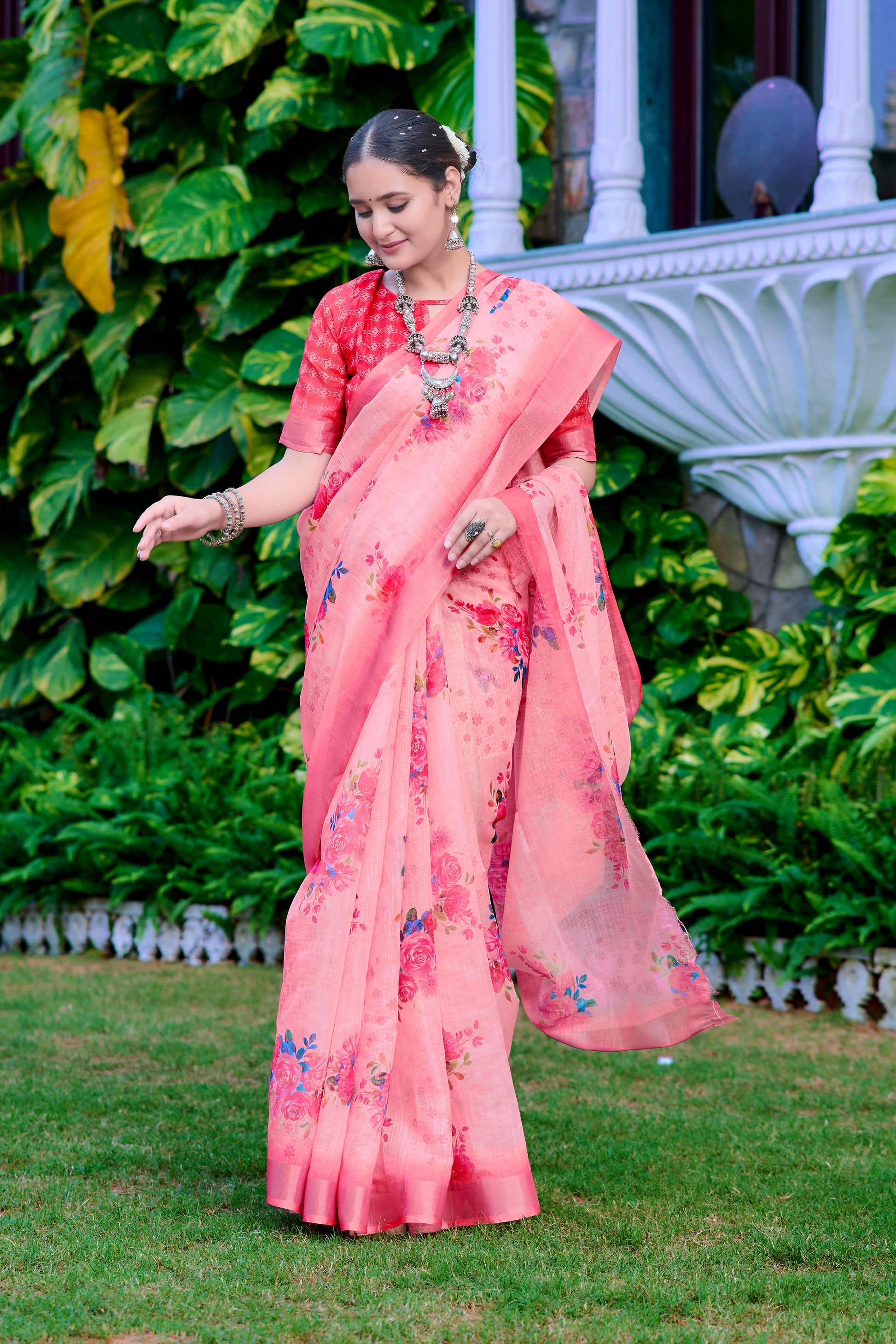 Outstanding Light Pink Color Color Pure Cotton Lilen With Digital Printed Designer Saree