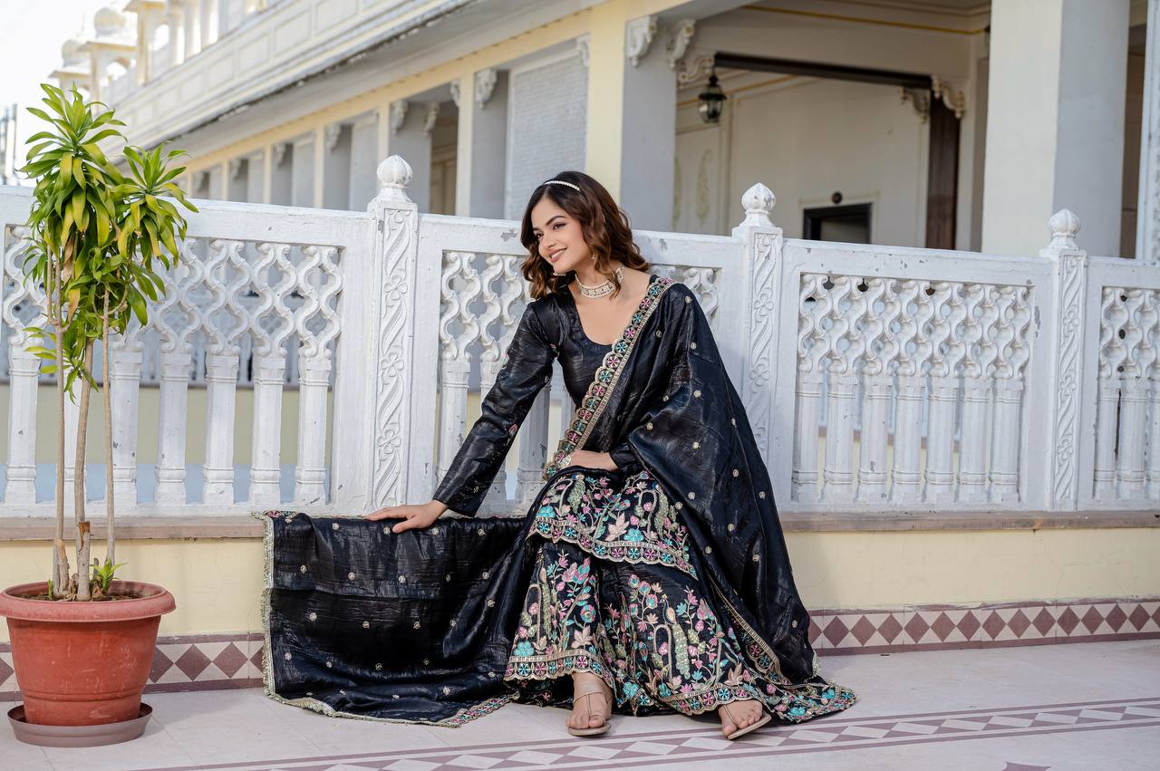 Party Wear Black Color Embroidery Work Beautiful Kurti Plazzo Dupatta Set