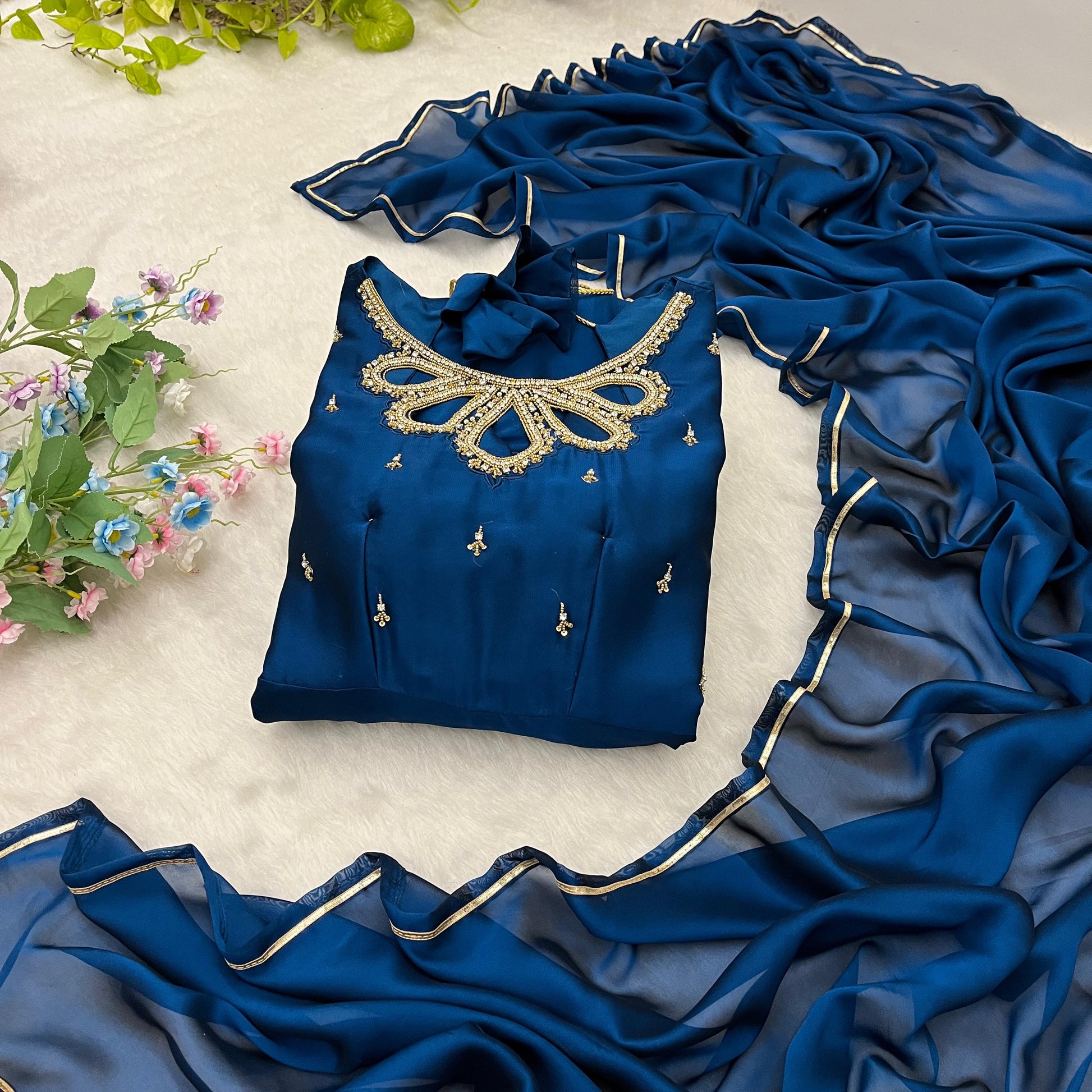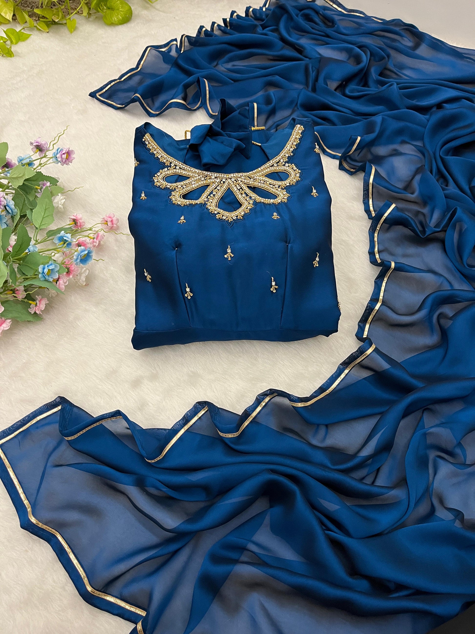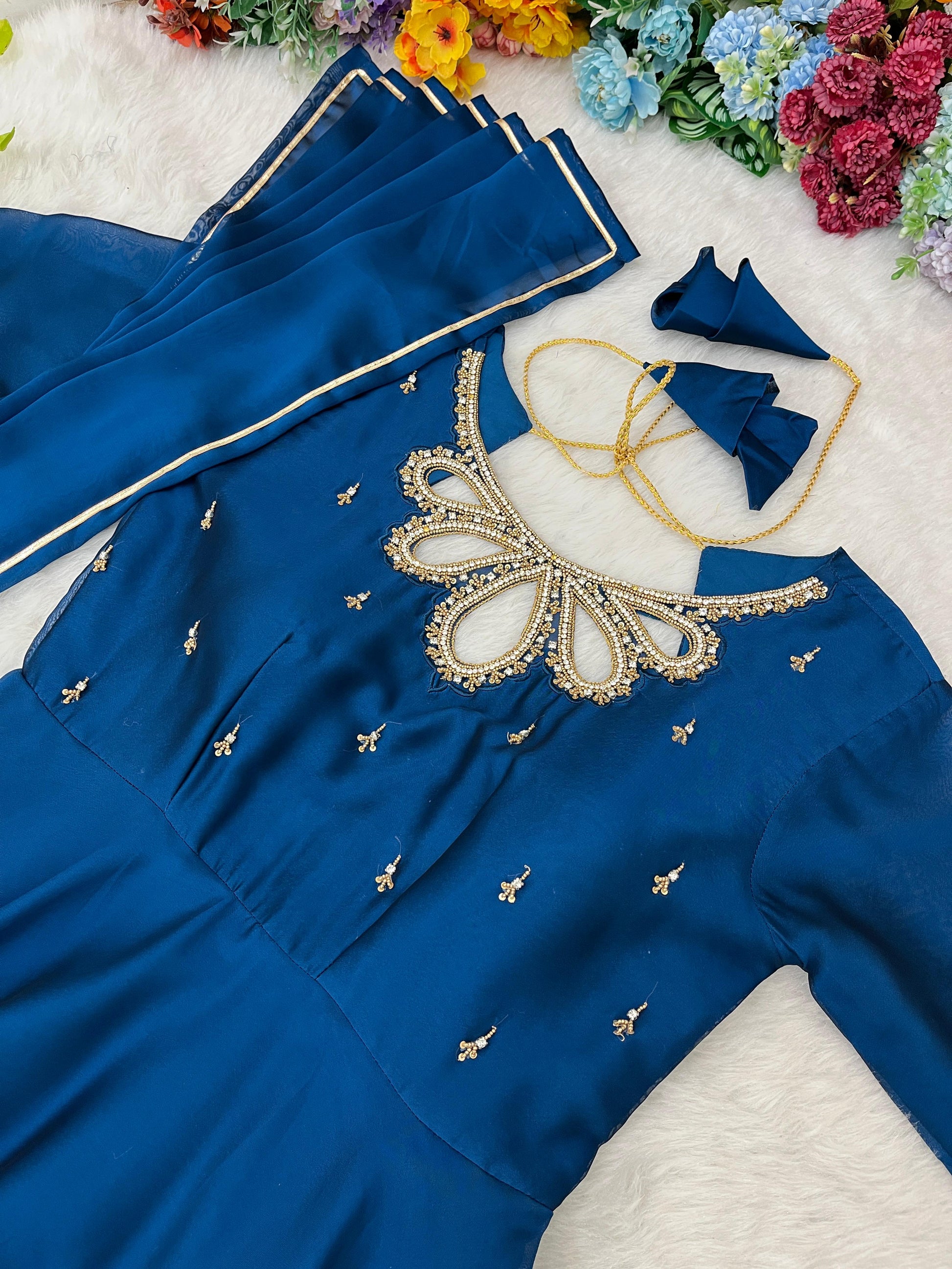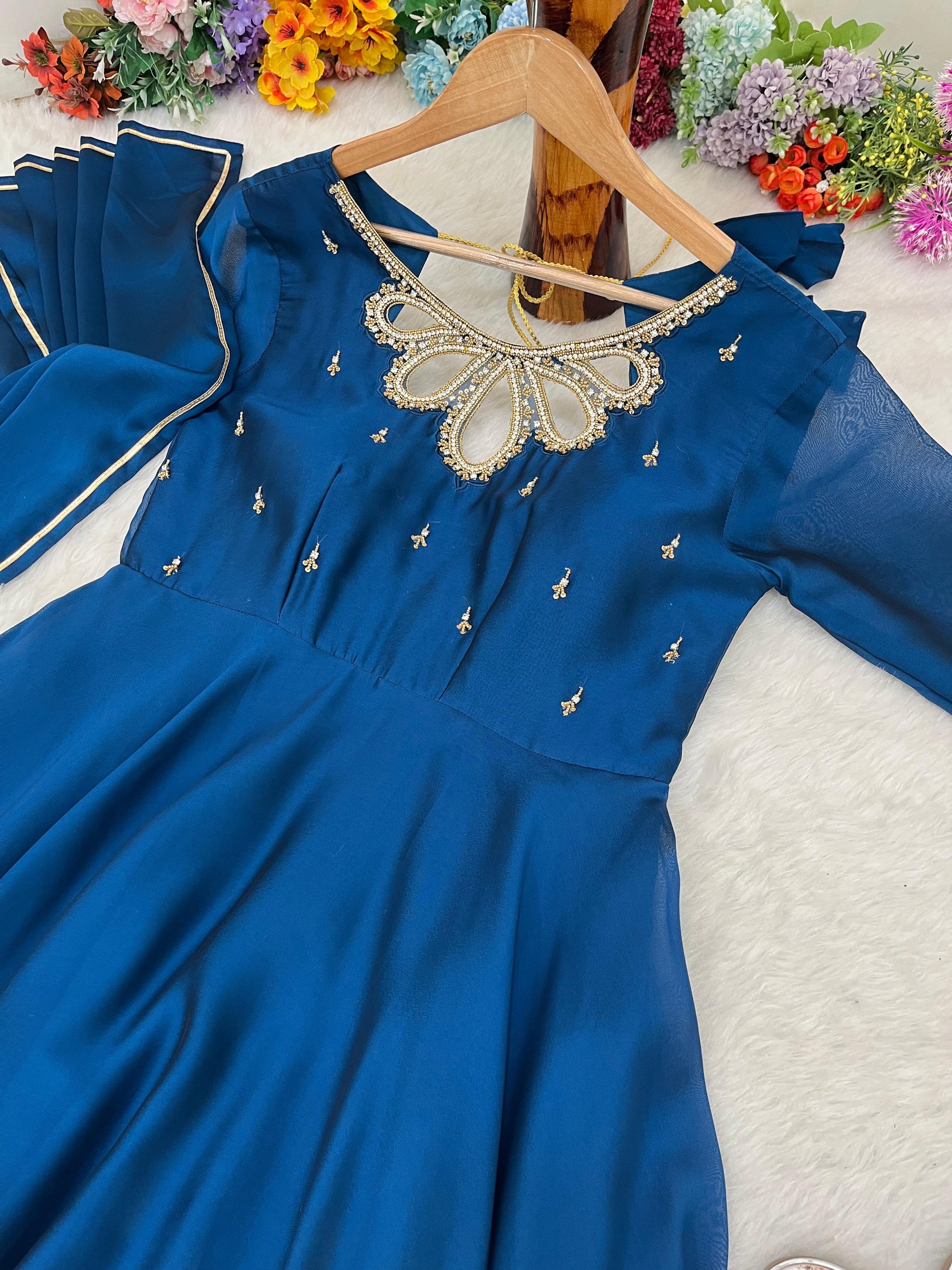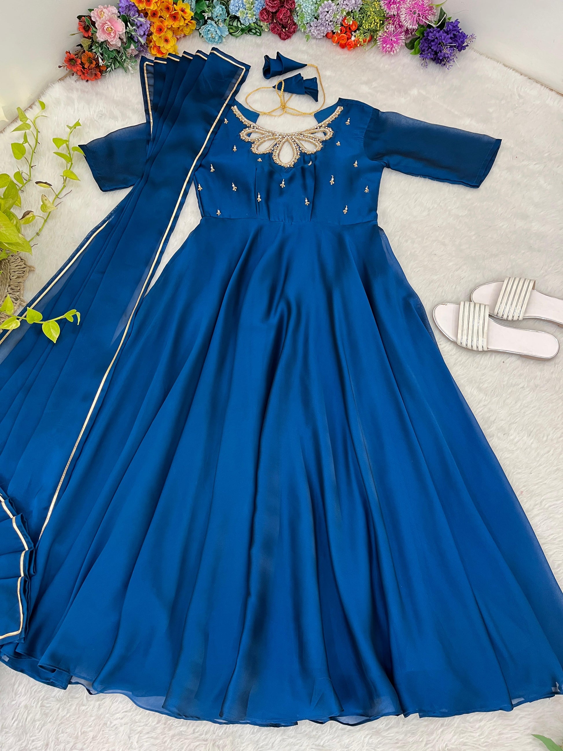 đź‘—gown Fabric Back Rangoli  Georgette Heavy Quality 2 Tone Fabric , 1/4 SleeveÂ