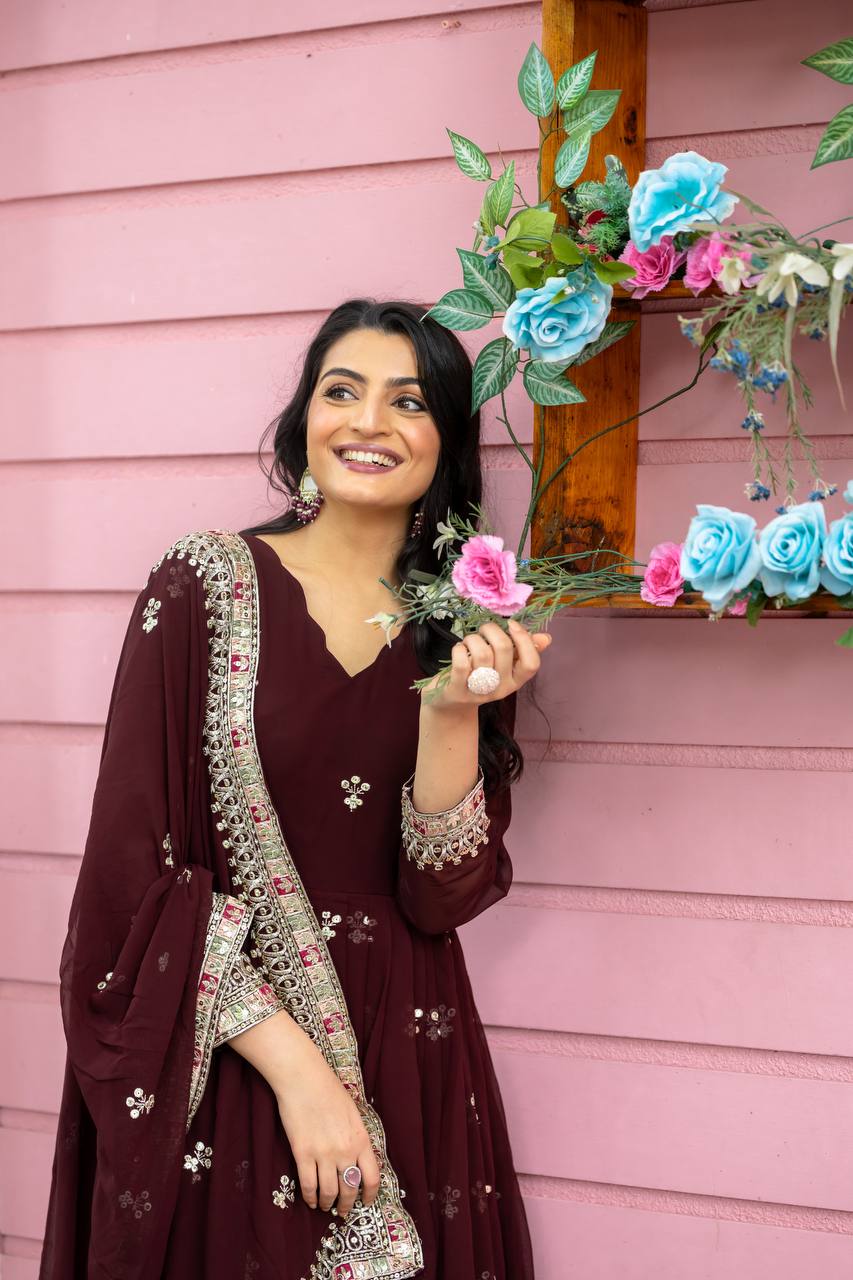 Party Wear Brown Color Faux Georgette With Full Heavy Embroidery Sequence Work Gown