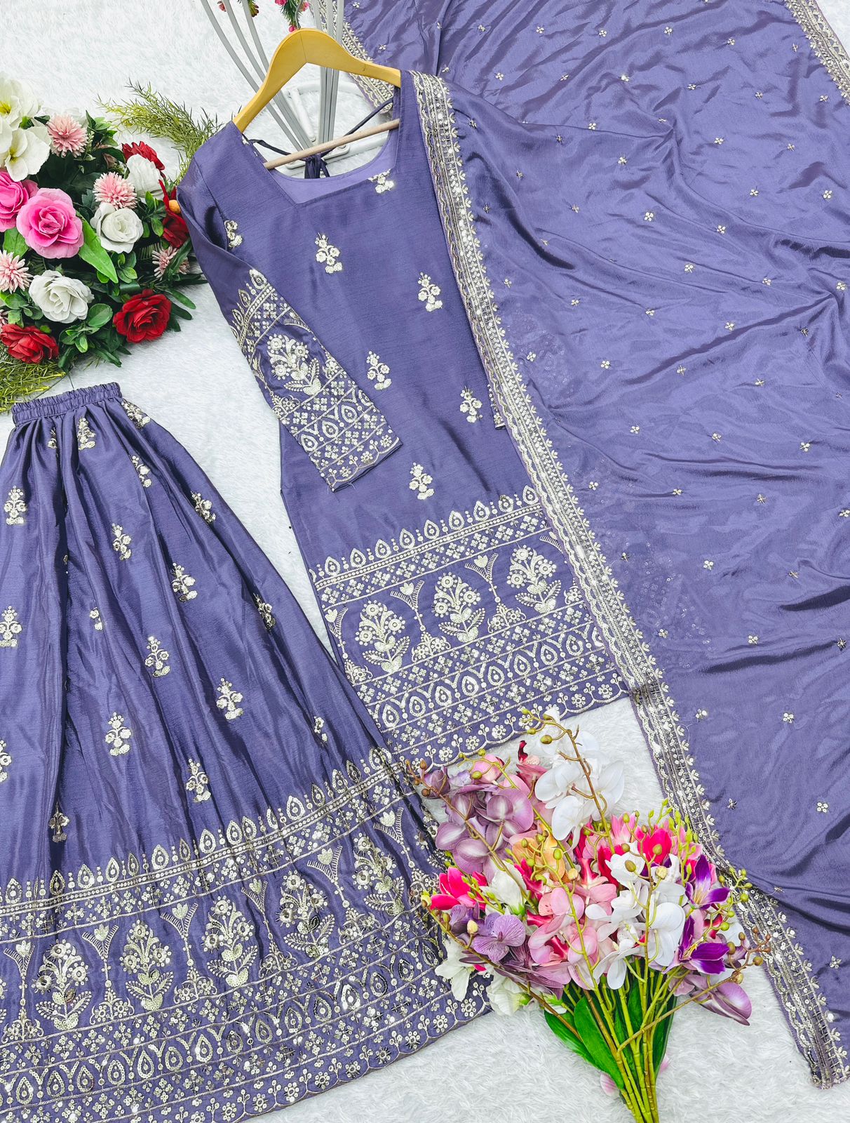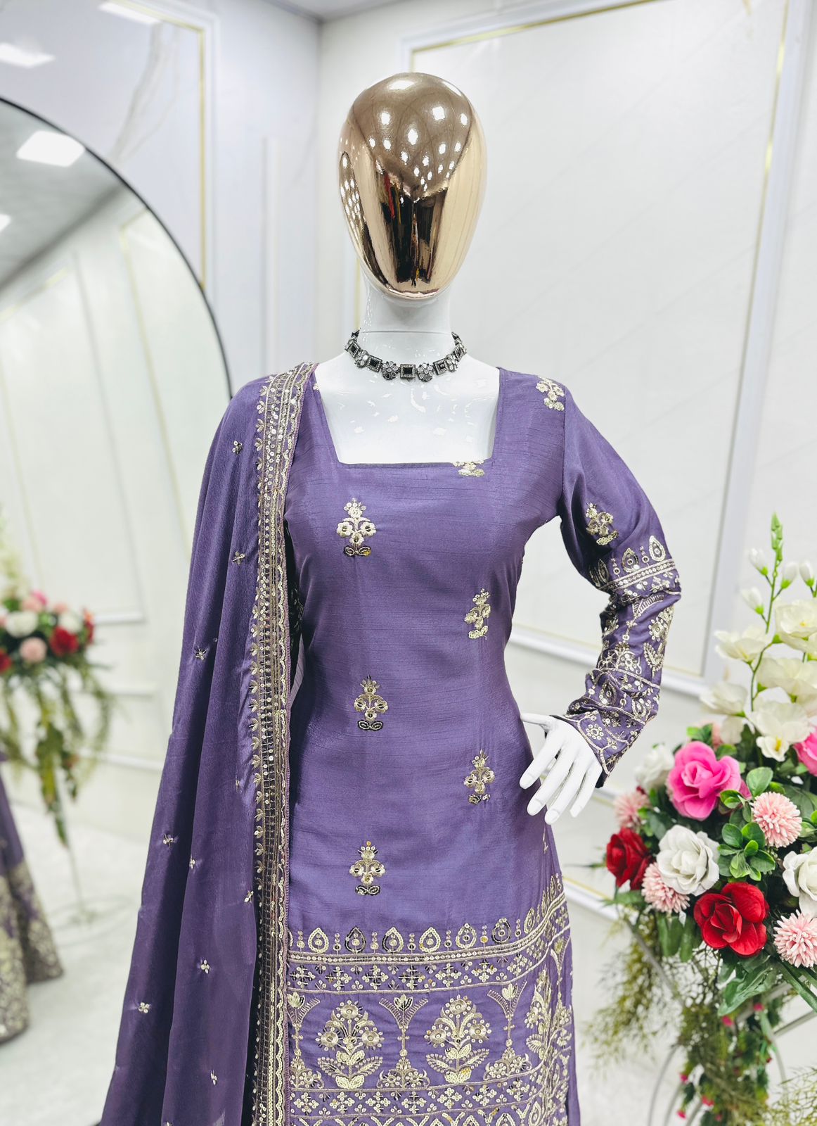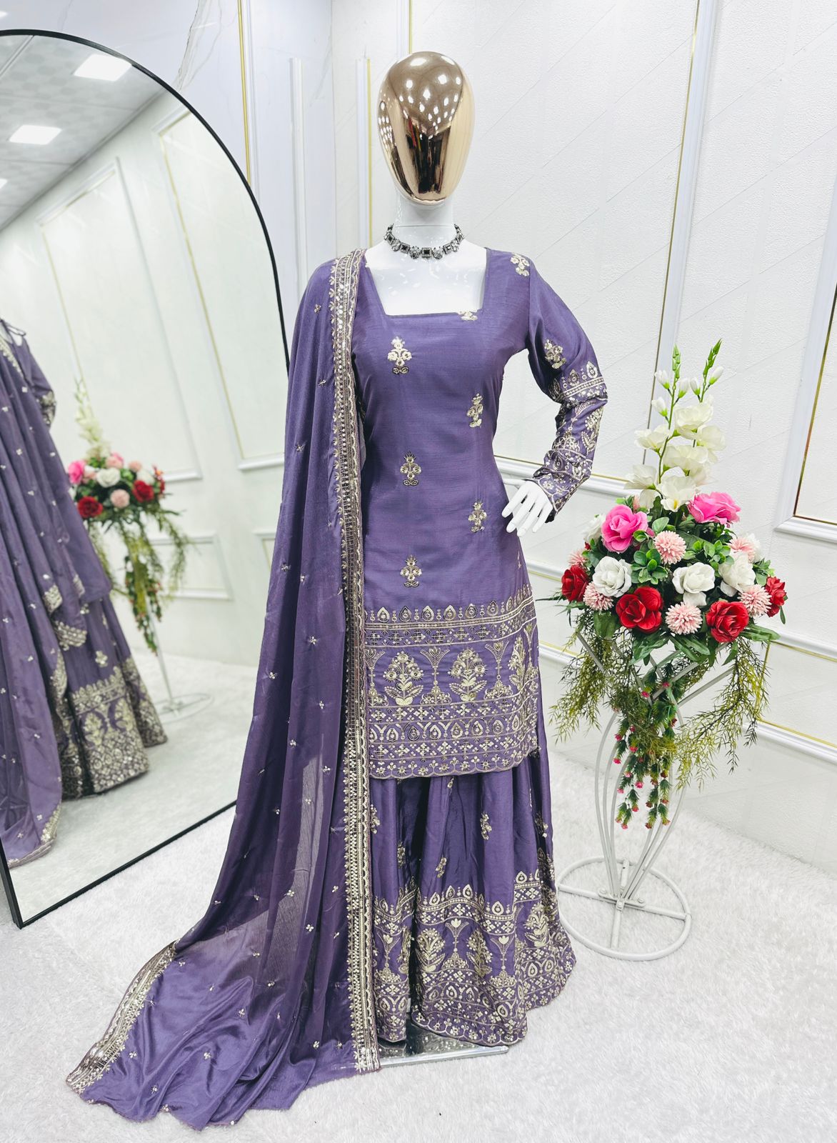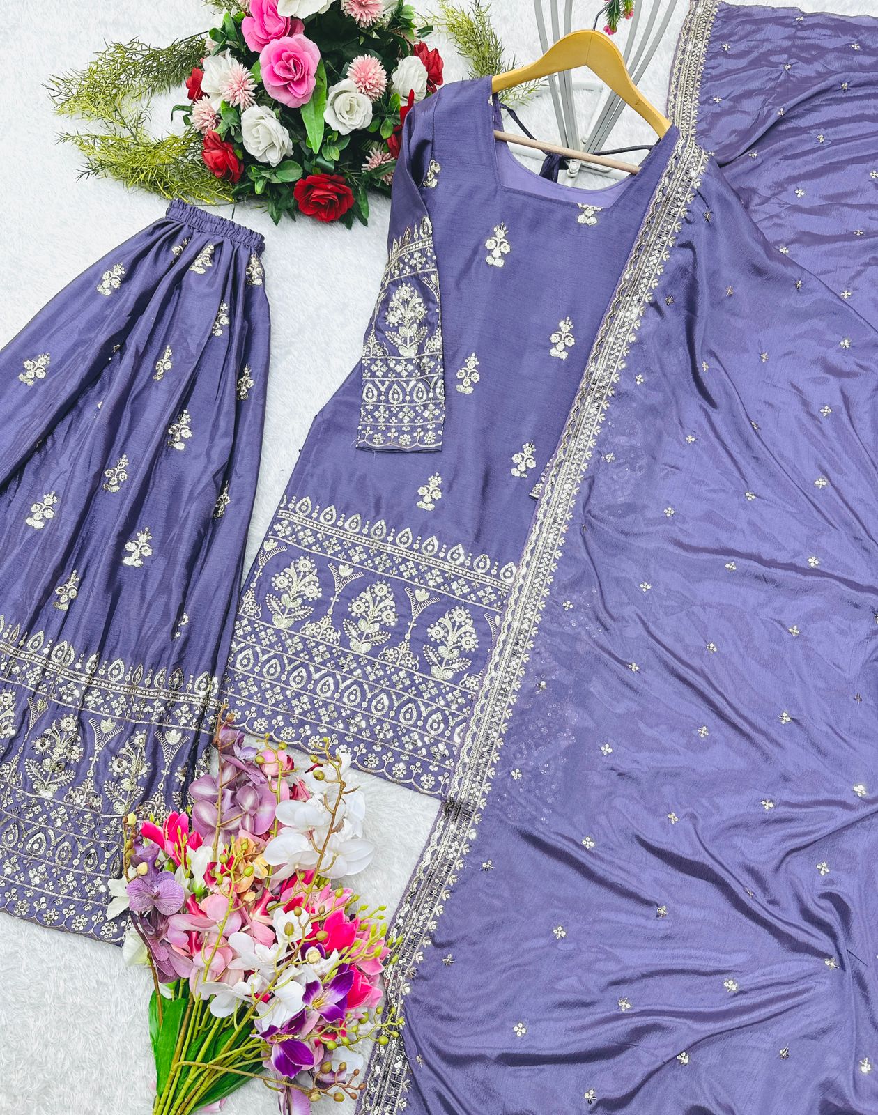 Party Wear Lavender Color Pure Chinon Silk With Embroidery 5mm Sequence Work Sharara Suit