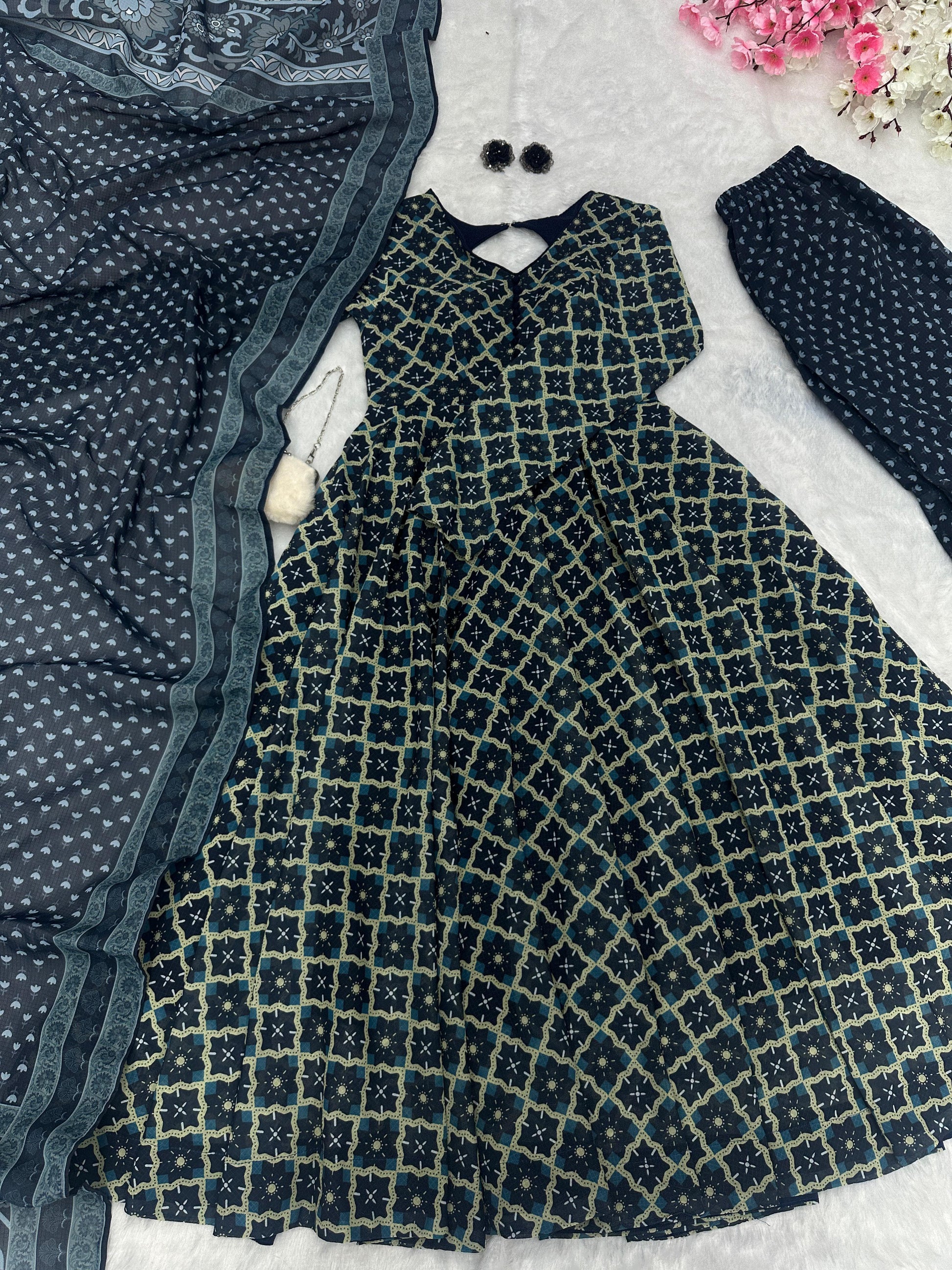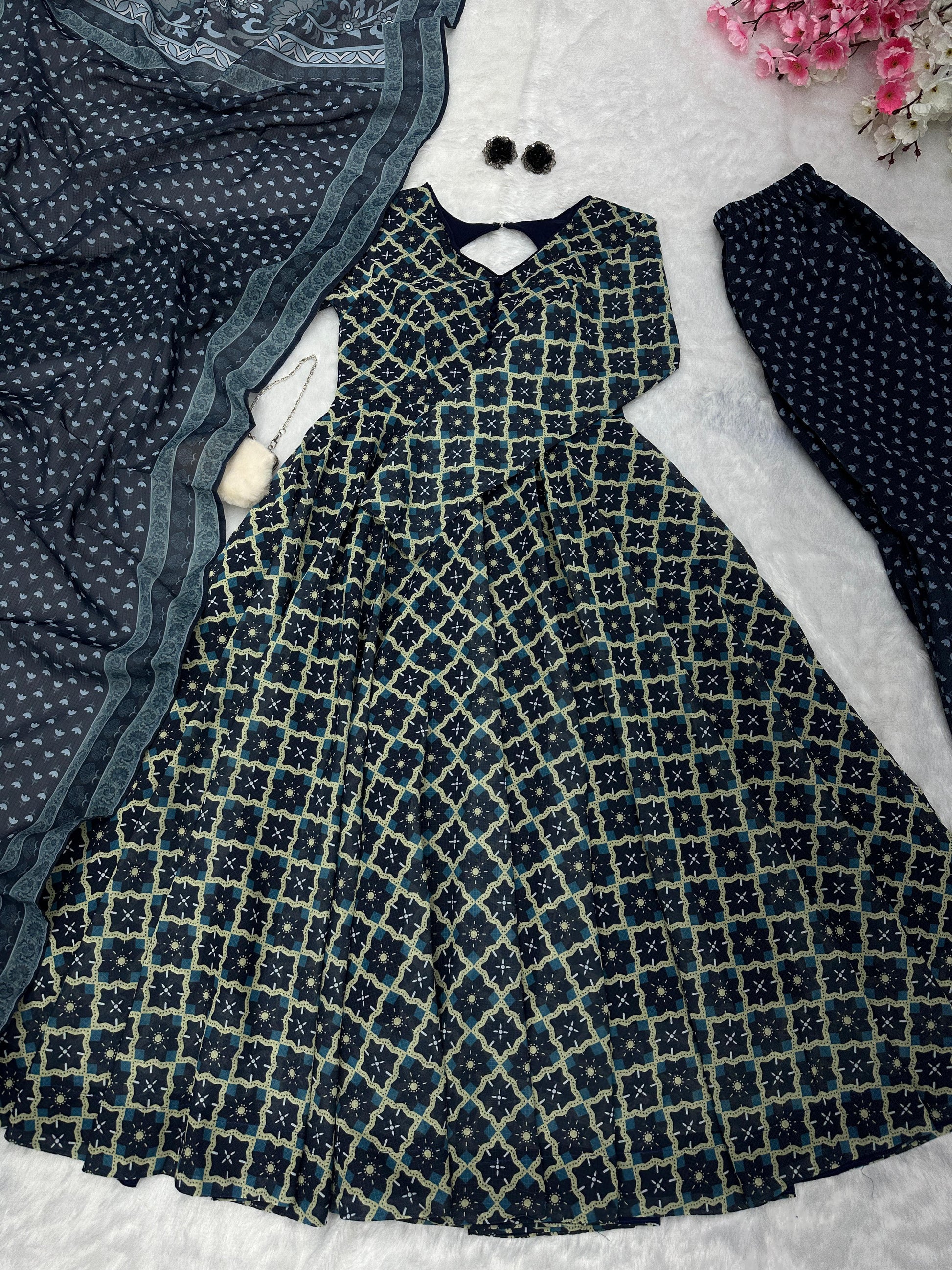 Party Wear Navy Blue Color Pure Soft Cotton Printed Anarkali Suit