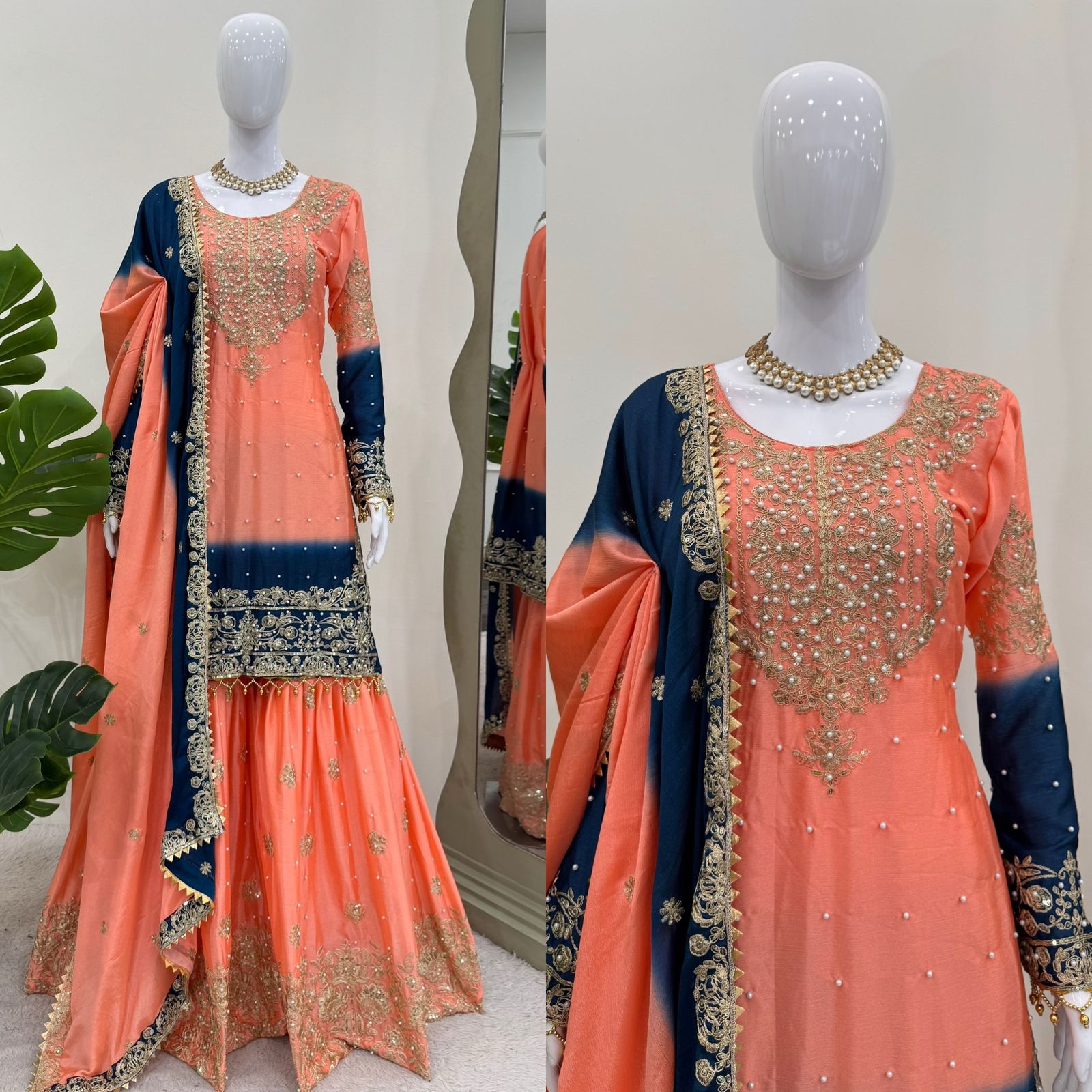 Party Wear Peach Color Chinon Silk And Coding Dori With Sequence With Rivet Moti Beautiful Sharara Suit
