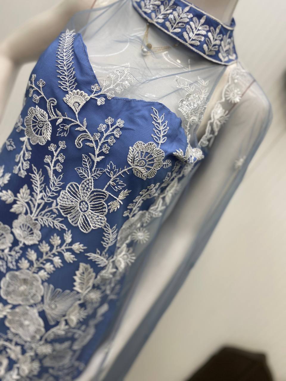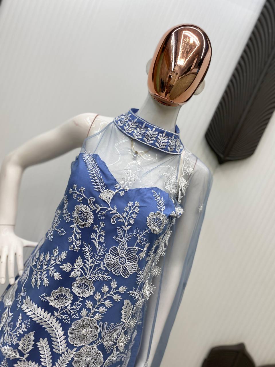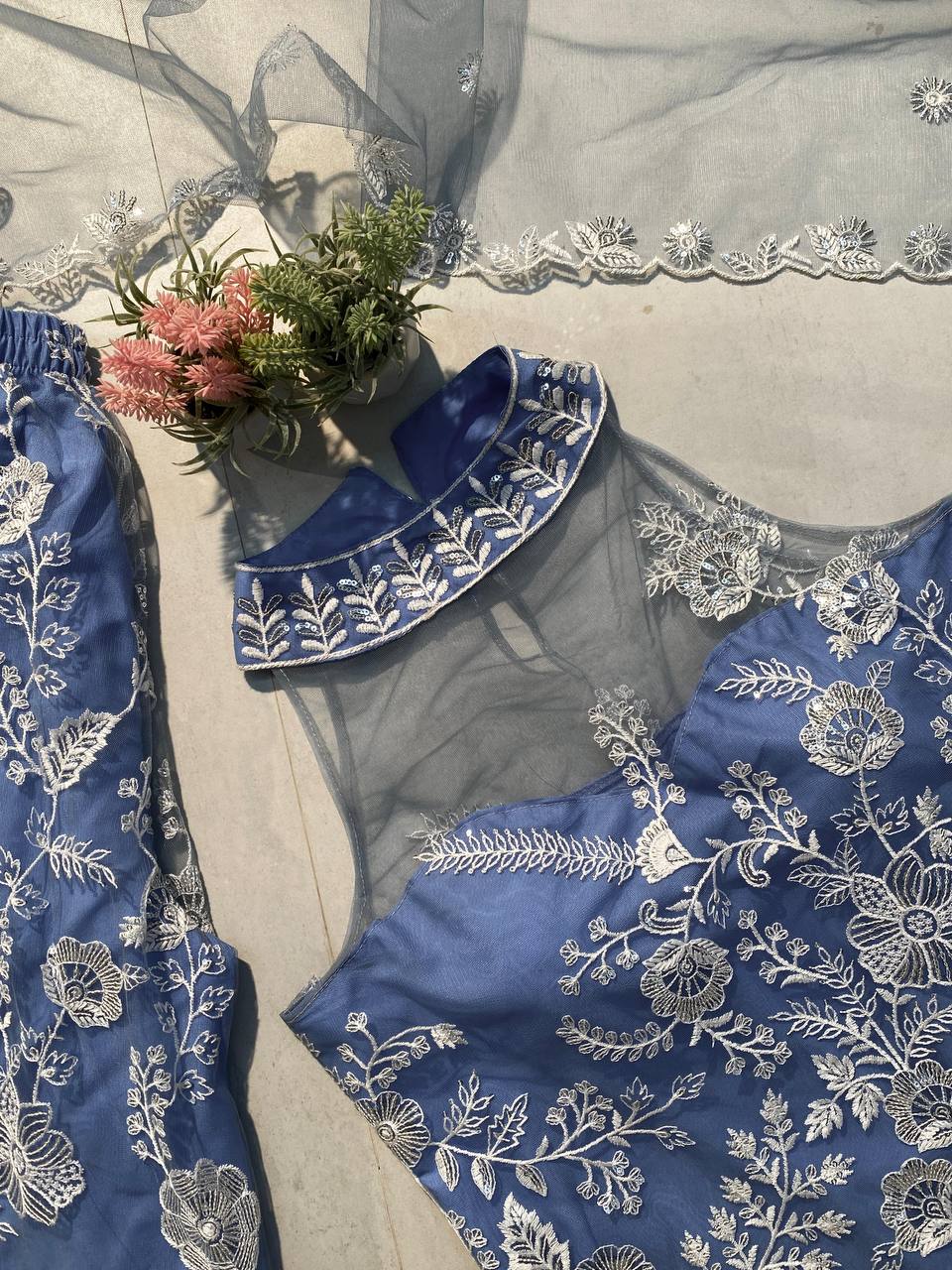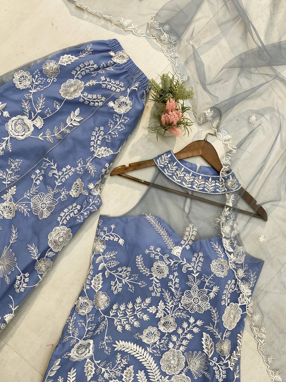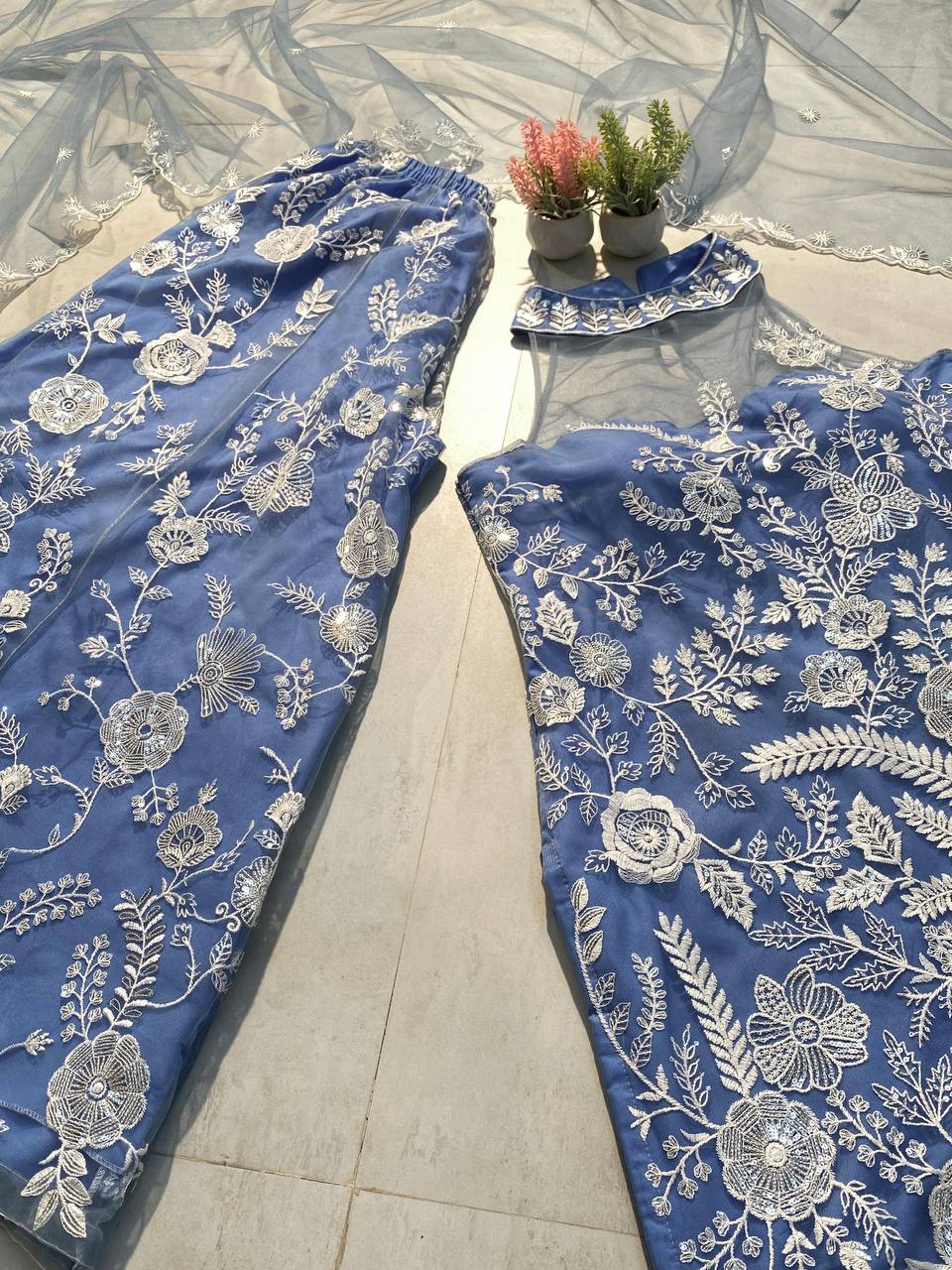 Party Wear Sky Blue Color Butterfly Net Sequence Embroidery Work Palazzo Suit