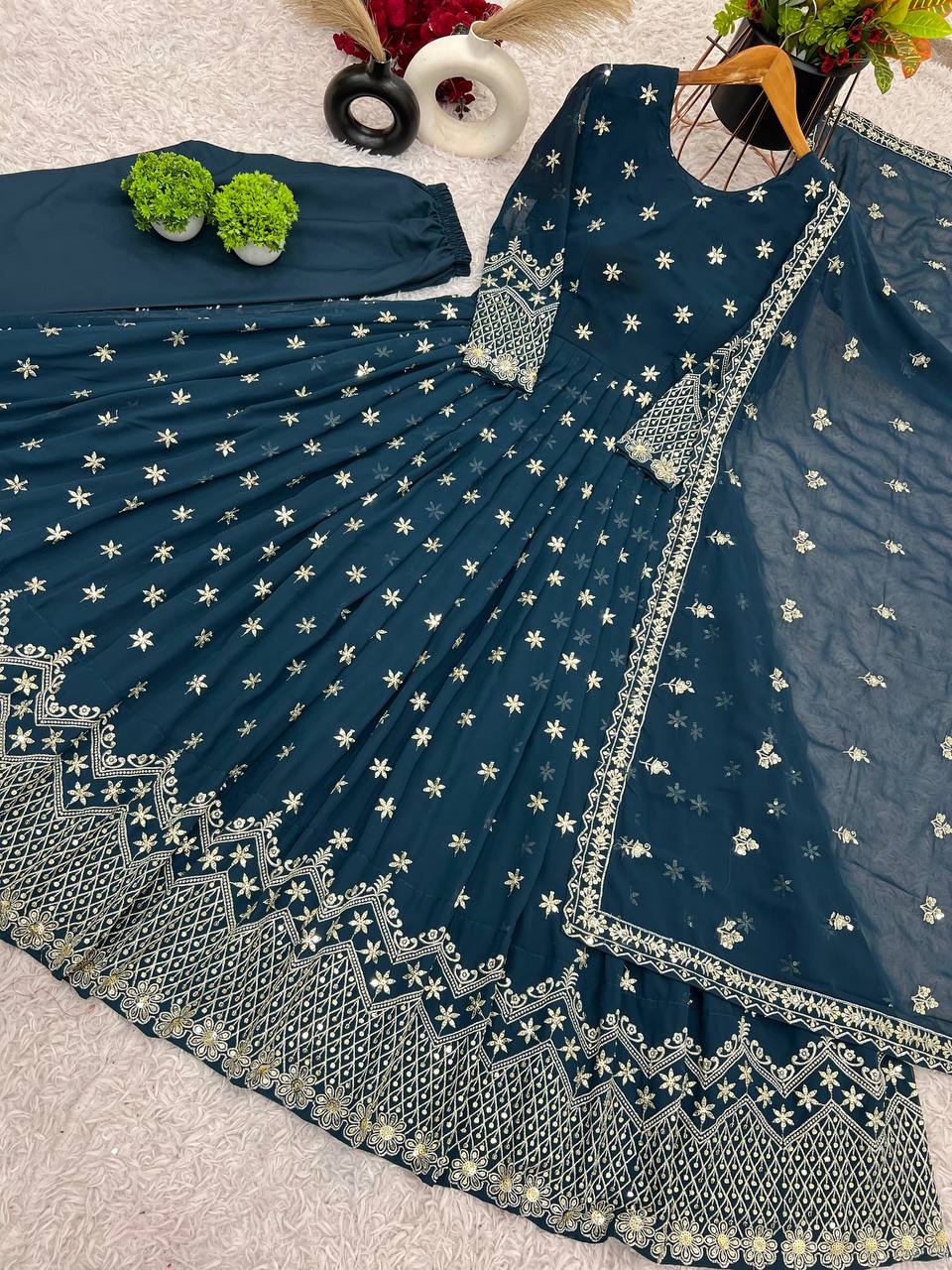 Party Wear Teal Blue Color Faux Georgette With Heavy Embroidery Sequence Work Gown