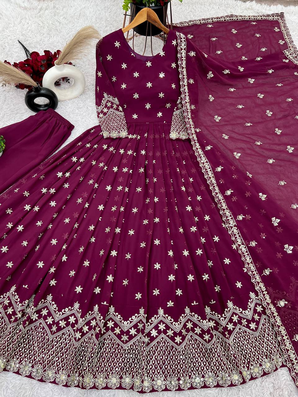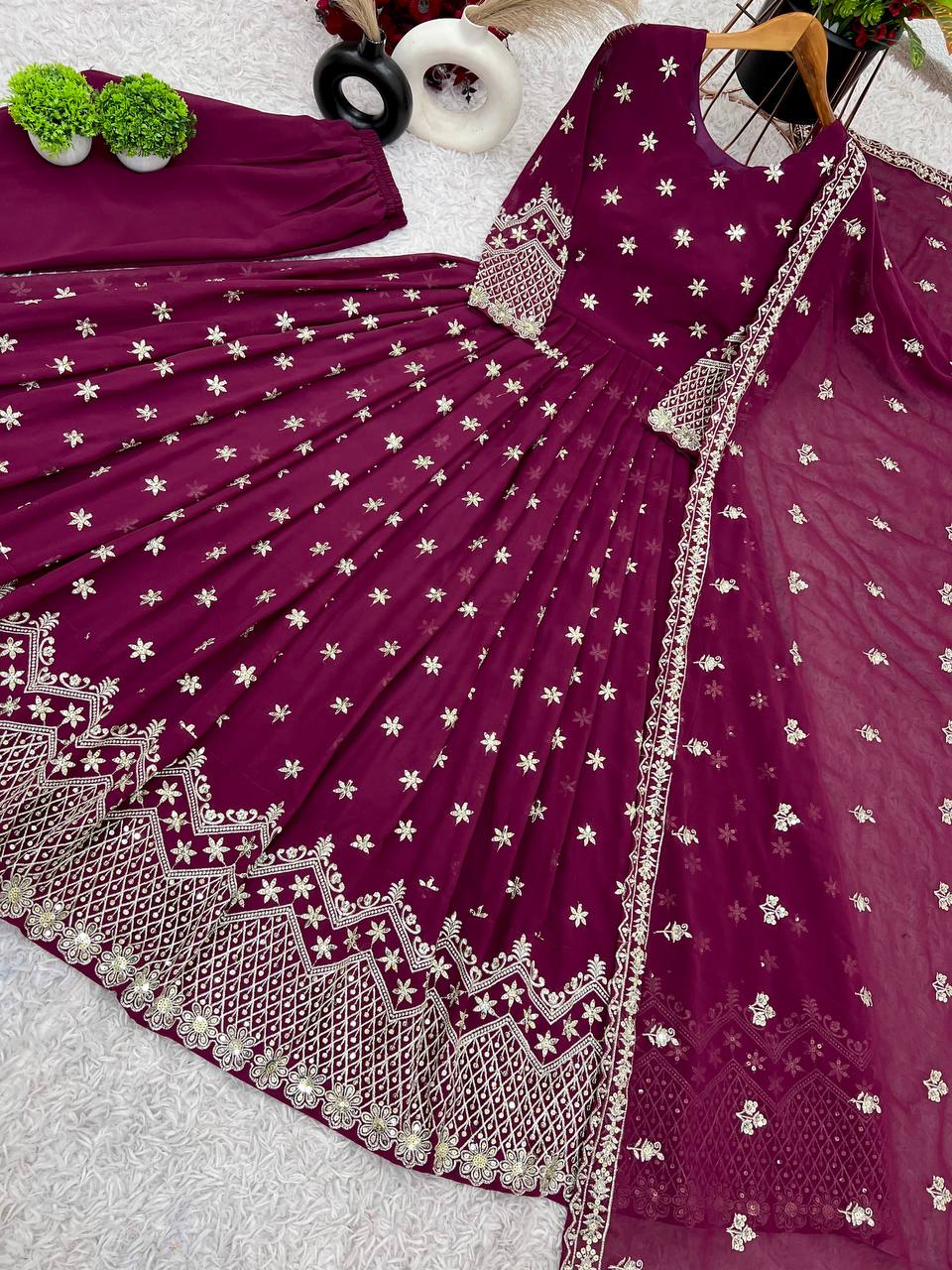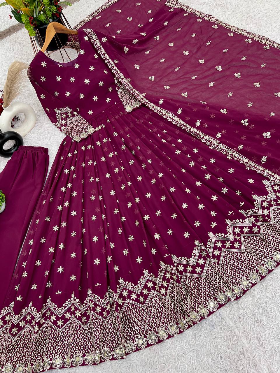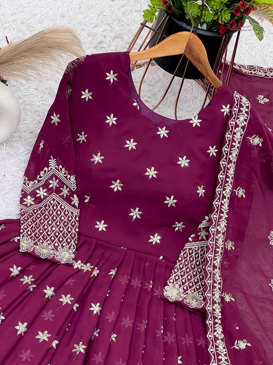 Party Wear Wine Color Faux Georgette With Heavy Embroidery Sequence Work Gown
