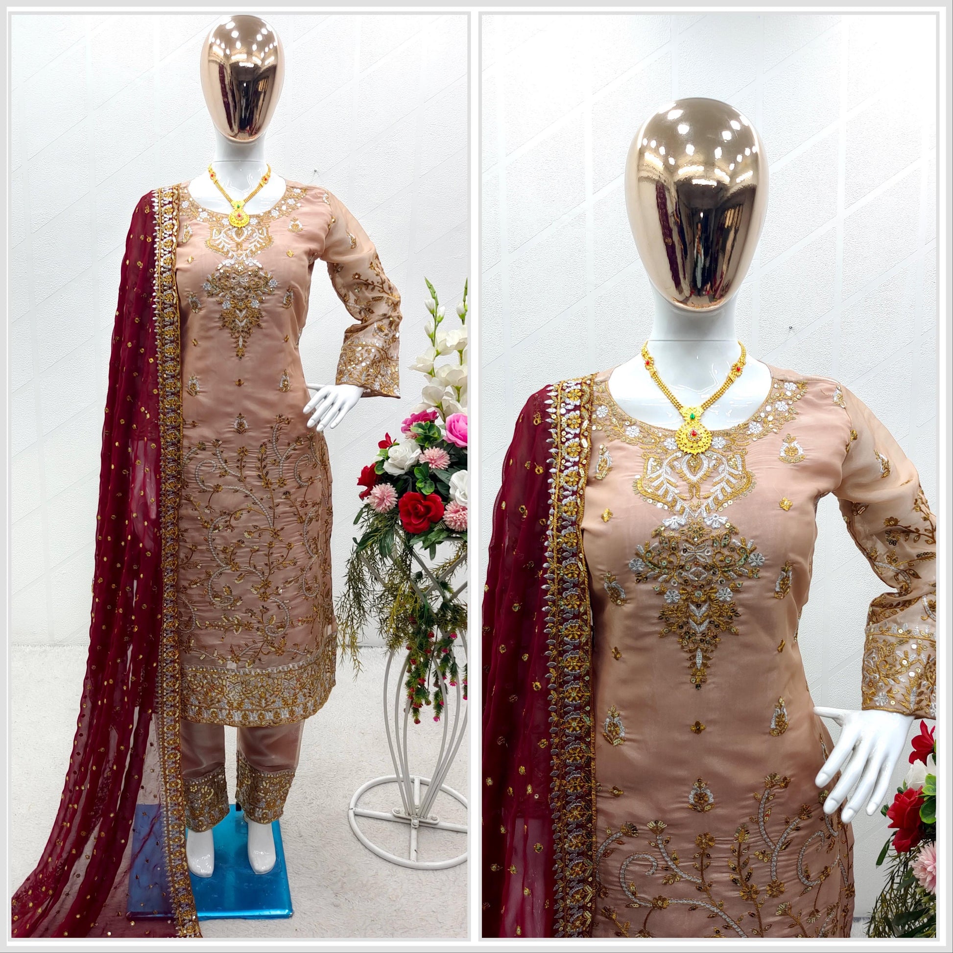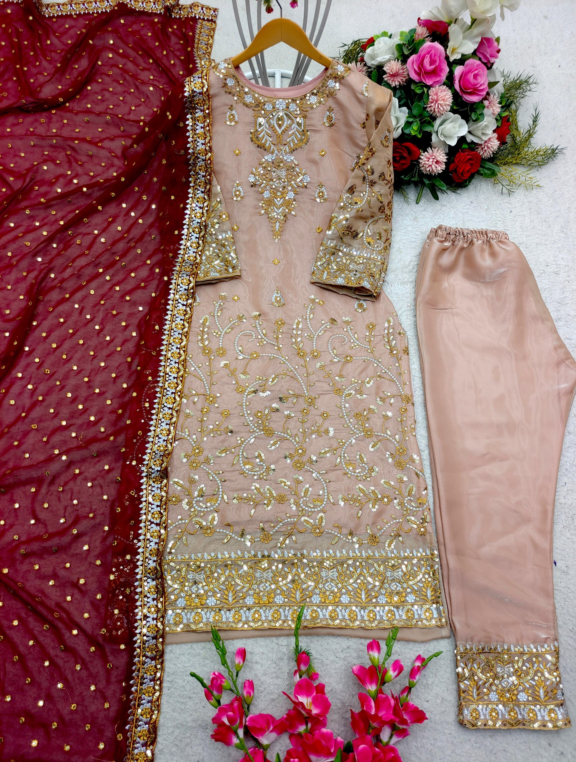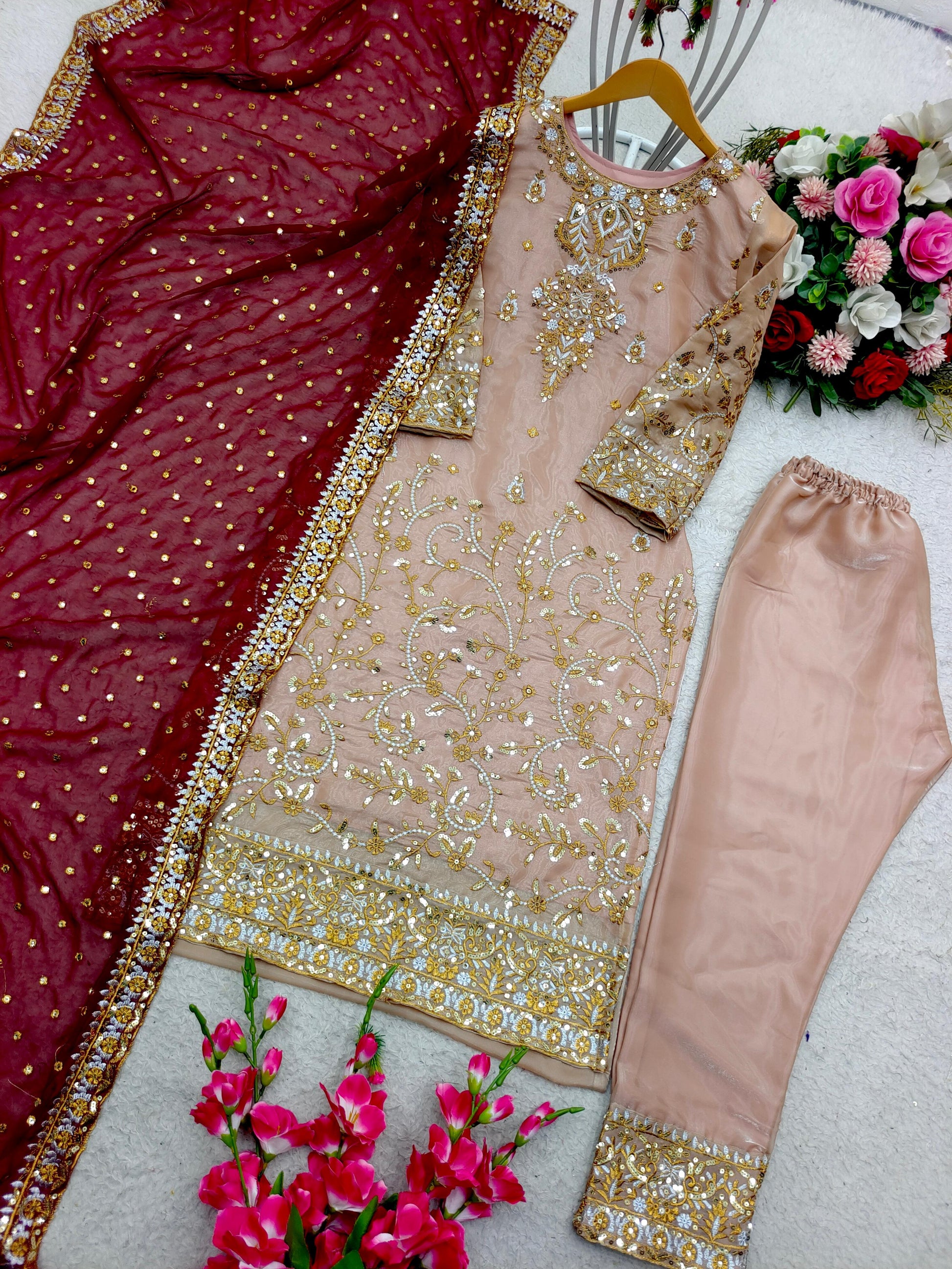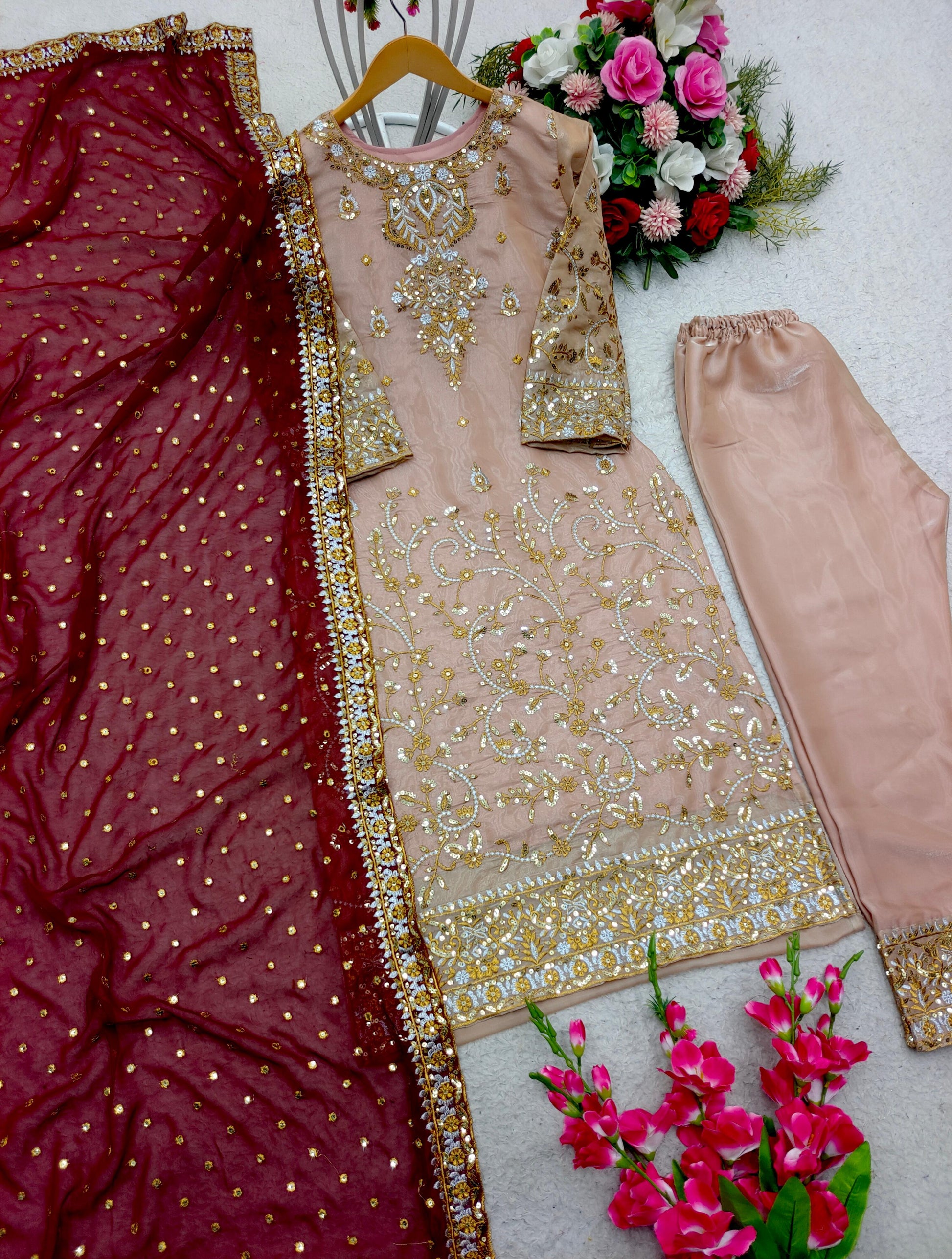 Peach Salwar Suit With Maroon Dupatta All Over Work