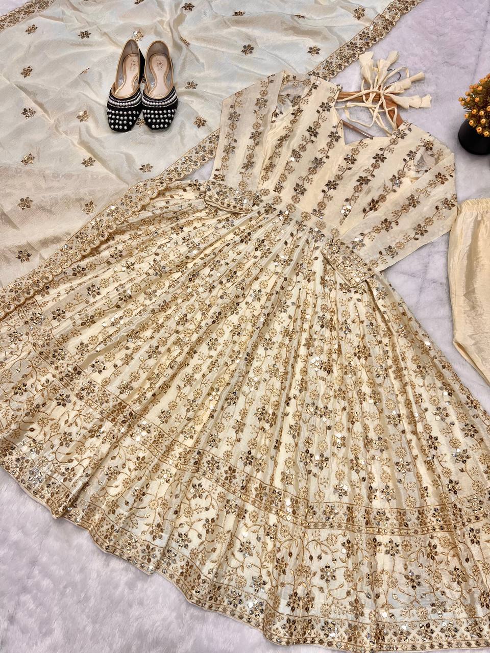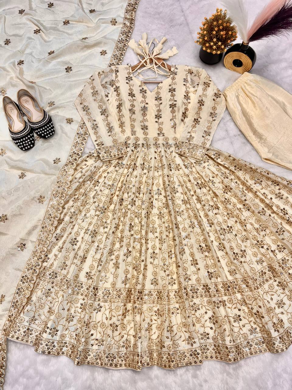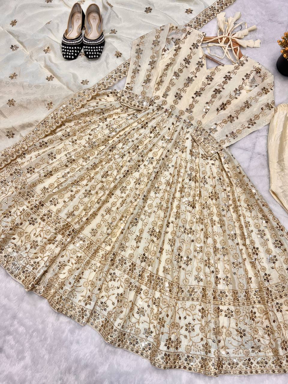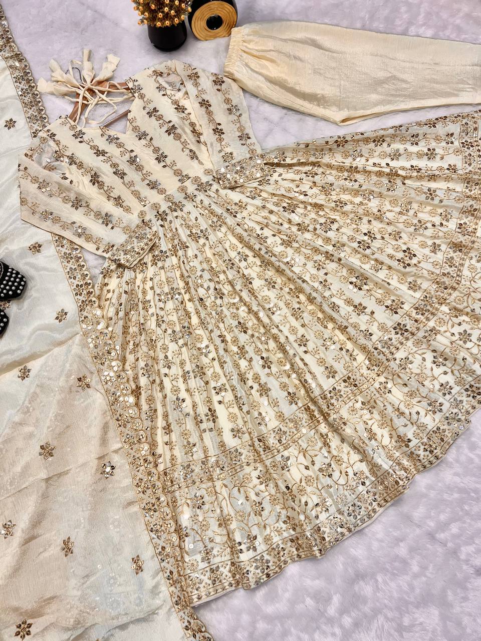 Precious Cream Color Pure Chinon Silk With Sequence Embroidery Work Anarkali Suit