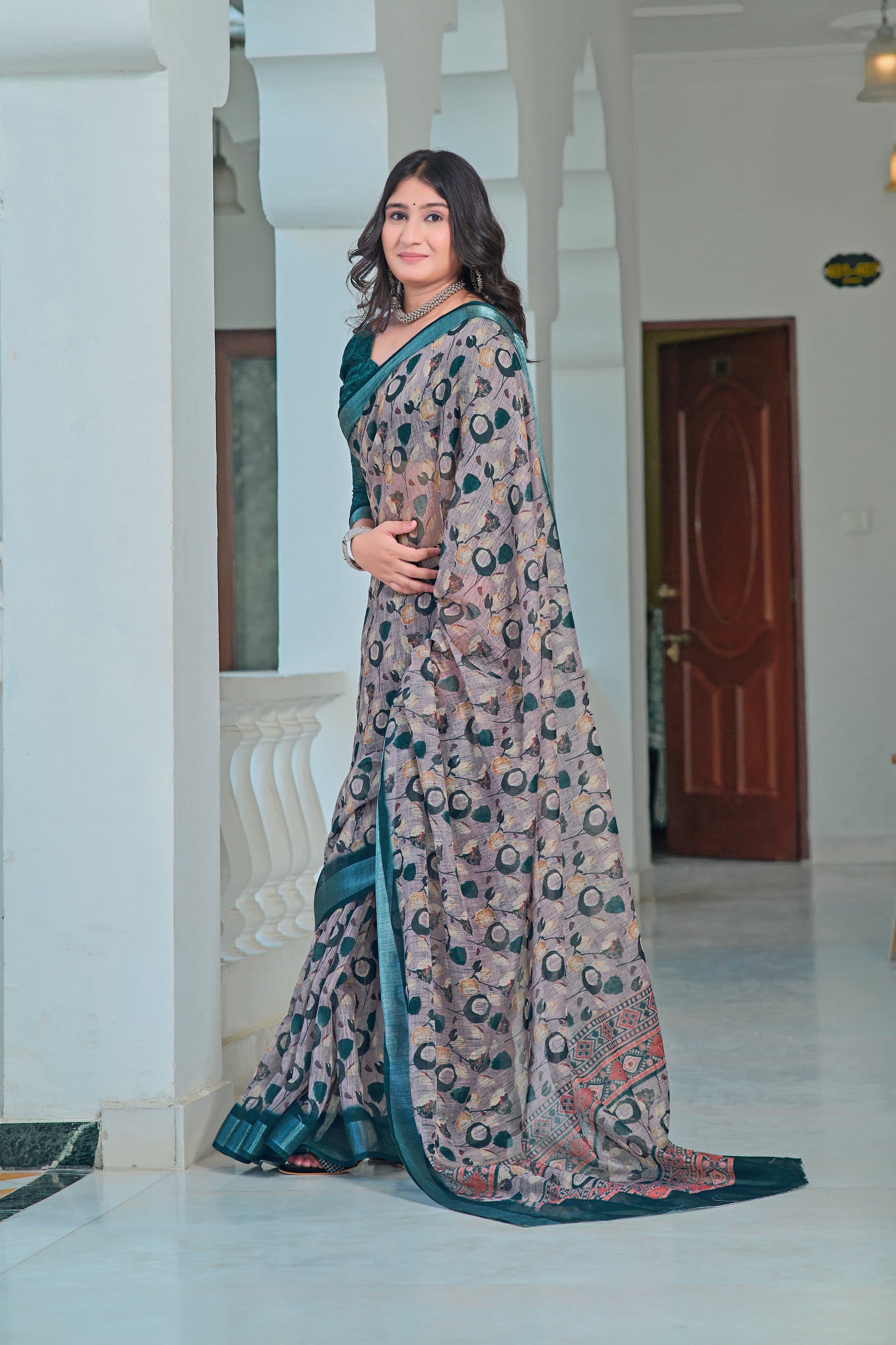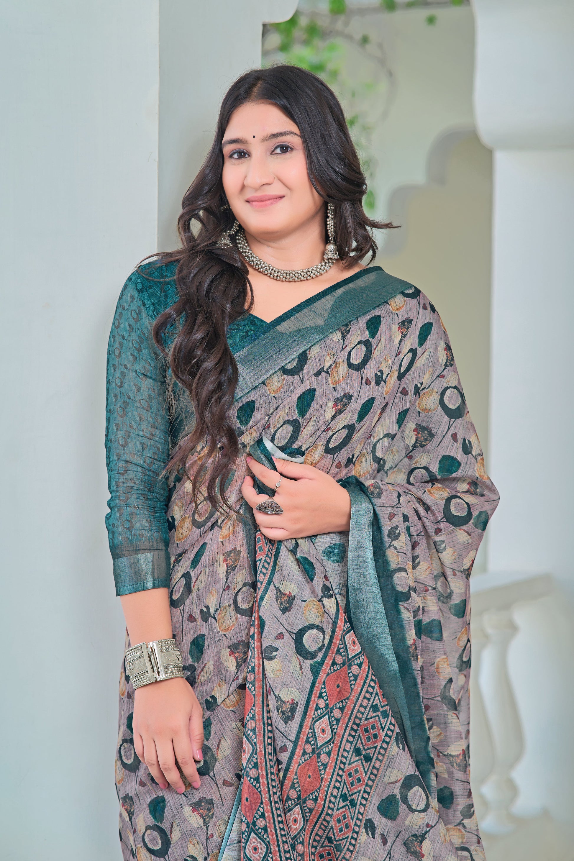 Precious Teal Color Color Pure Cotton Lilen With Digital Printed Designer Saree