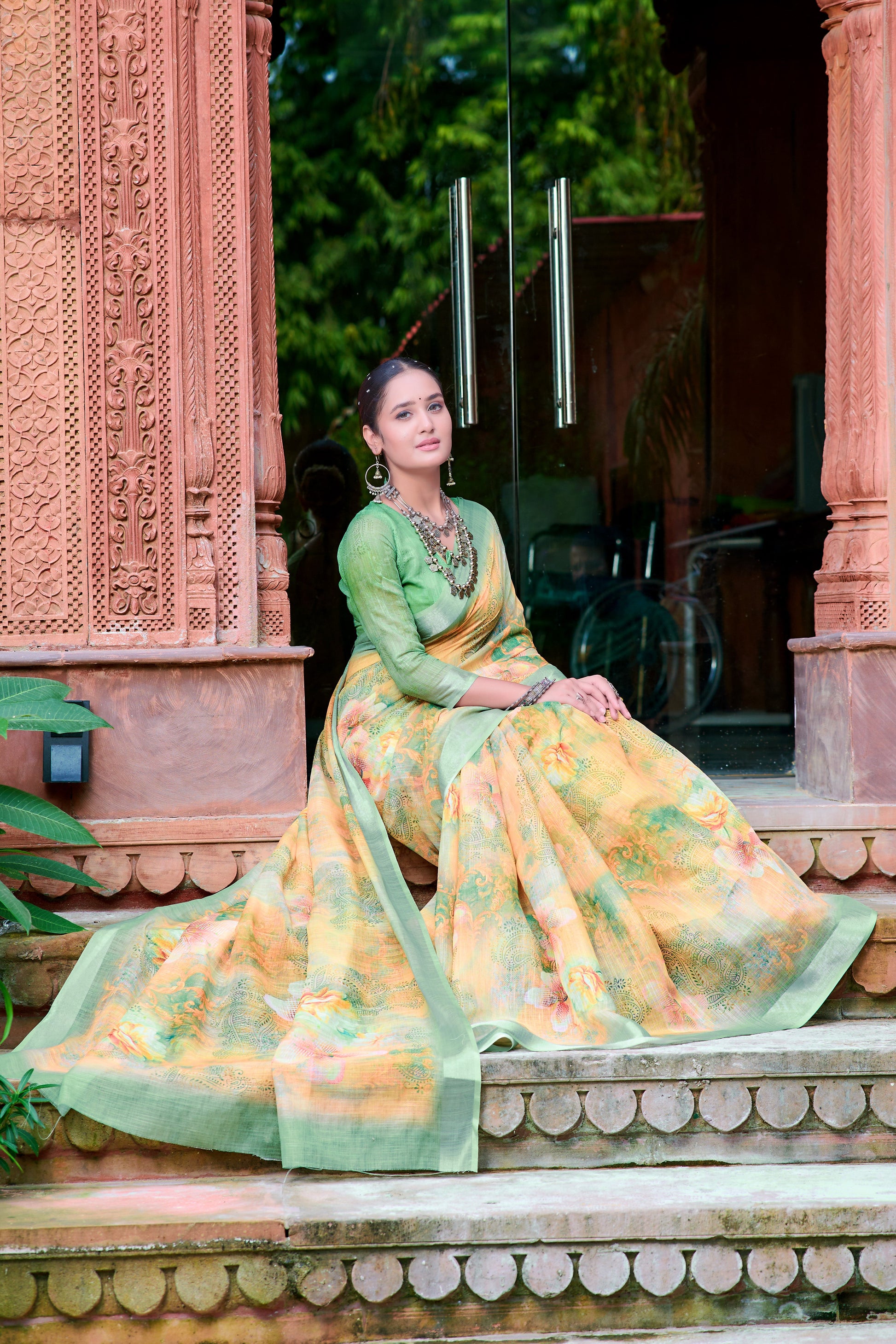 Preferable Yellow Color Color Pure Cotton Lilen With Digital Printed Designer Saree