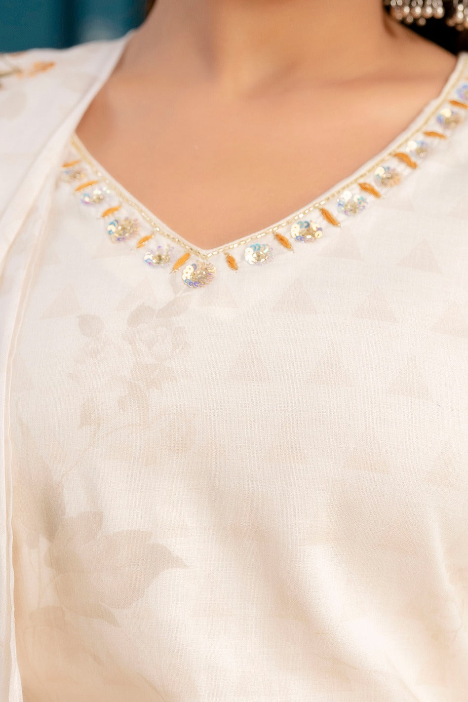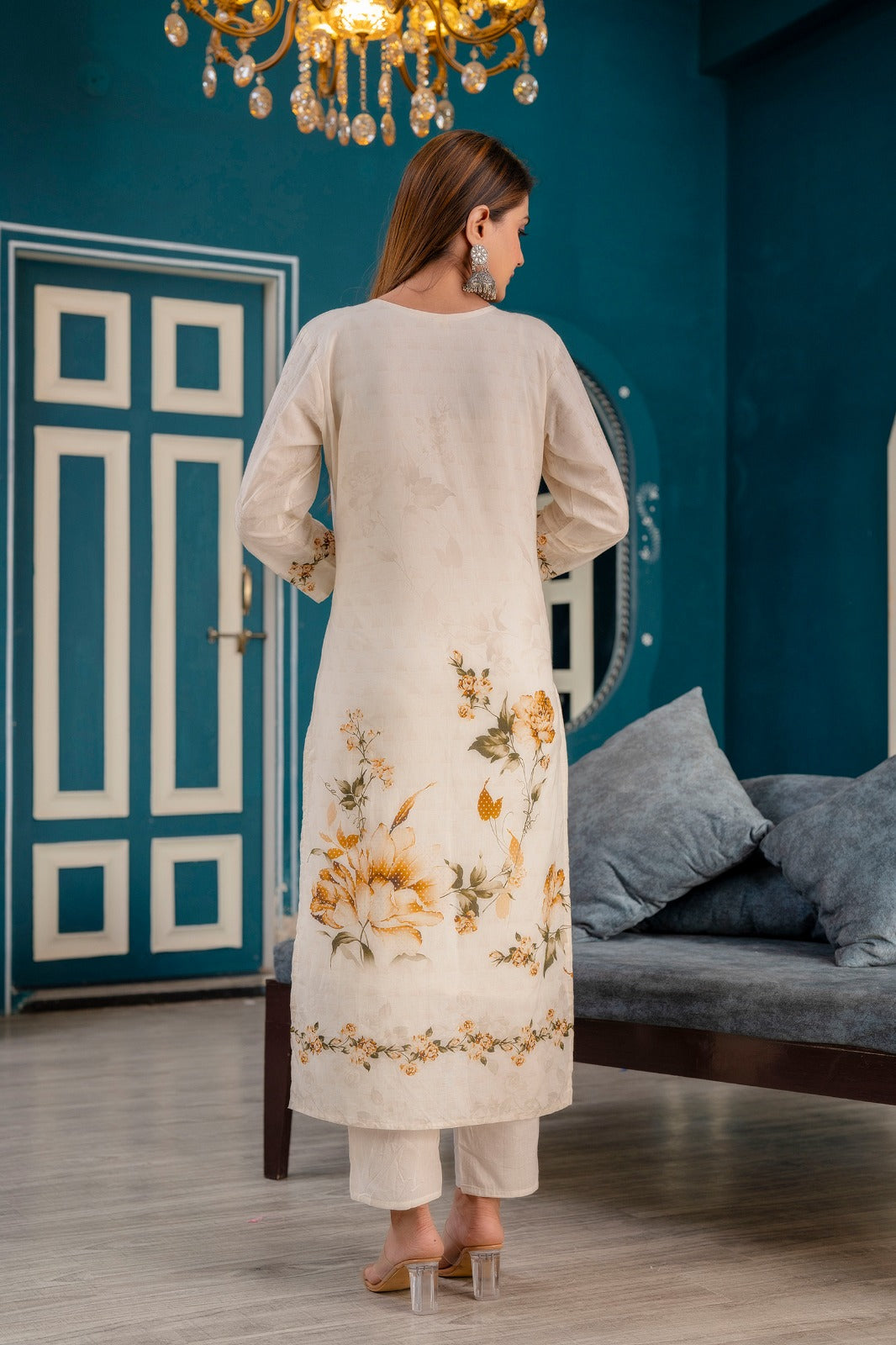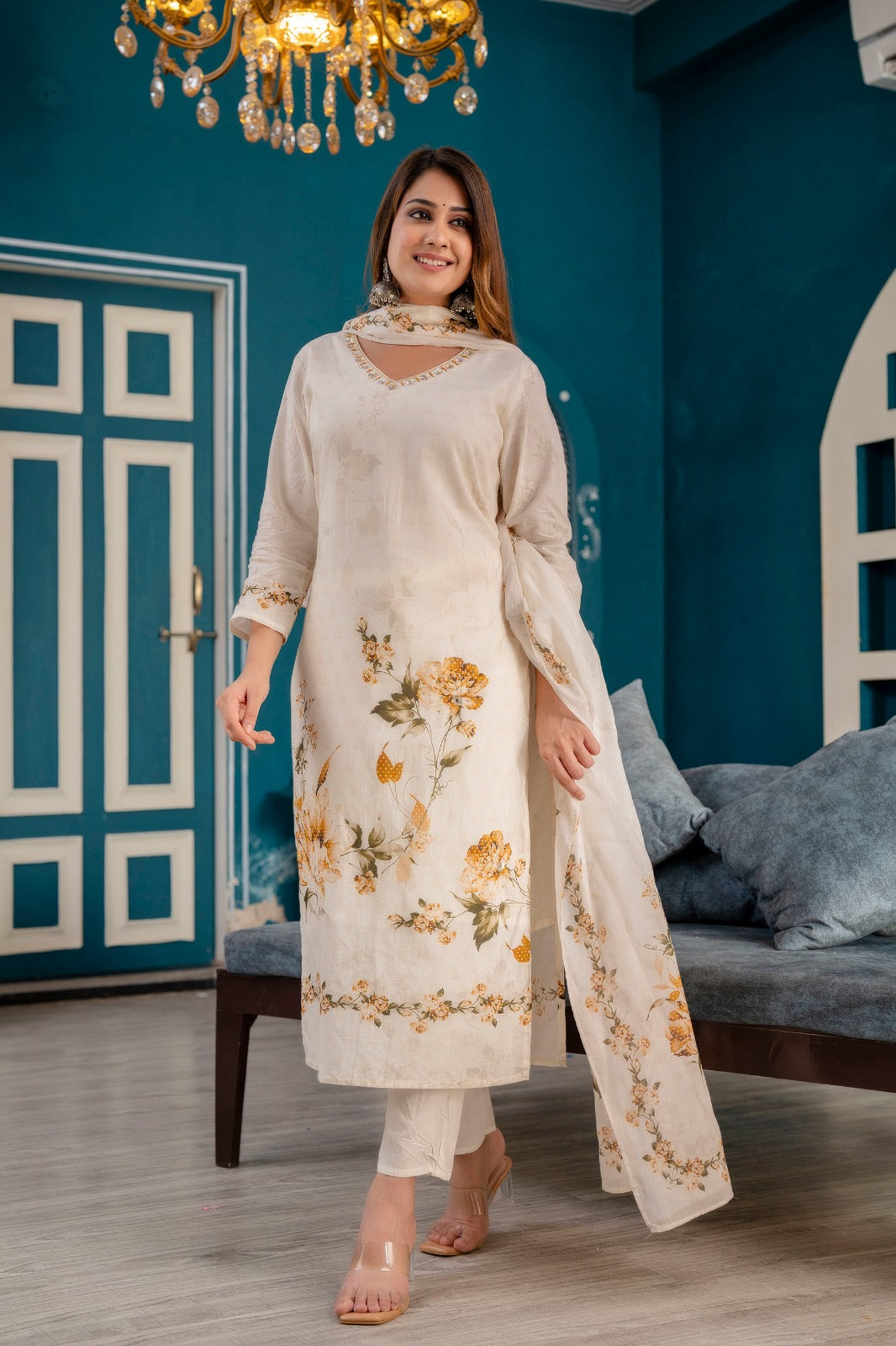 Pretty Cream Color Cotton With Hand Work And Digital Printed Kurta Set With Dupatta