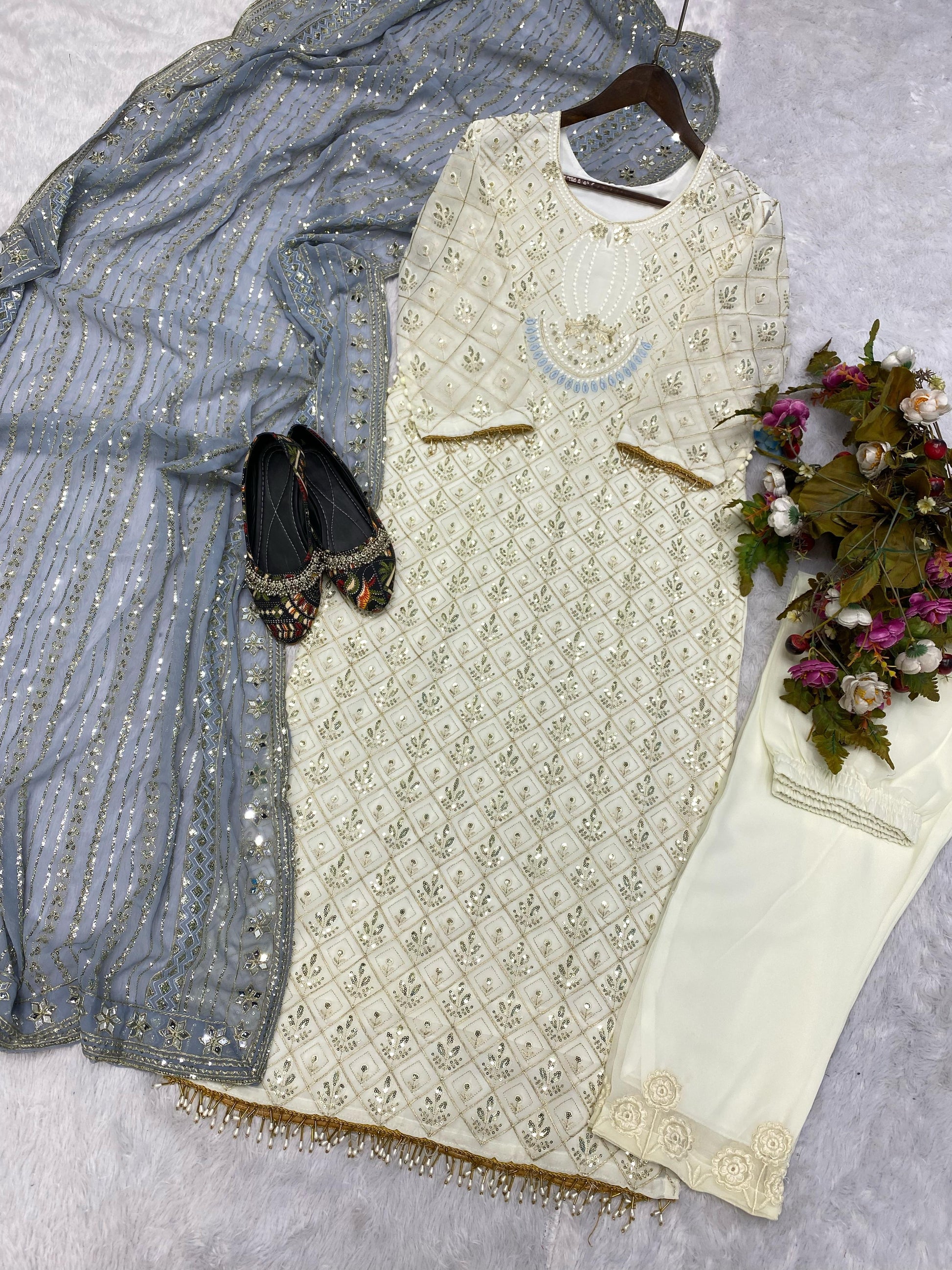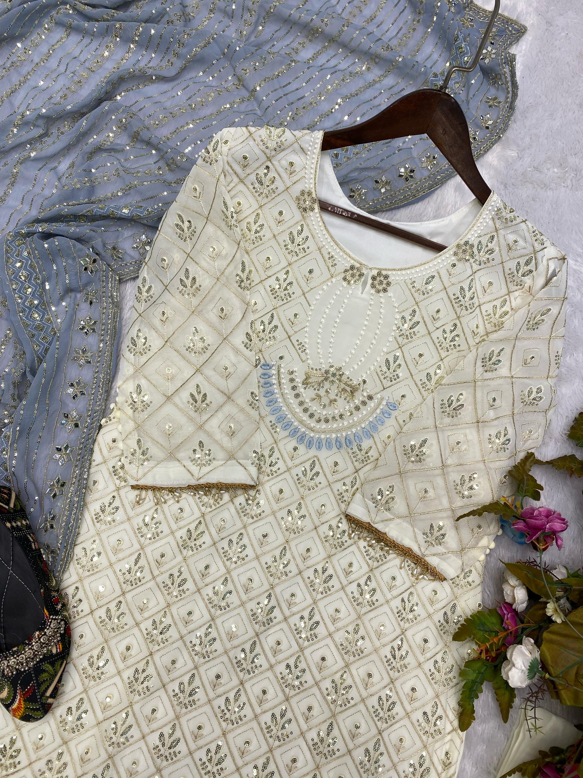 Pretty Sequence Work White Color Suit With Grey Dupatta