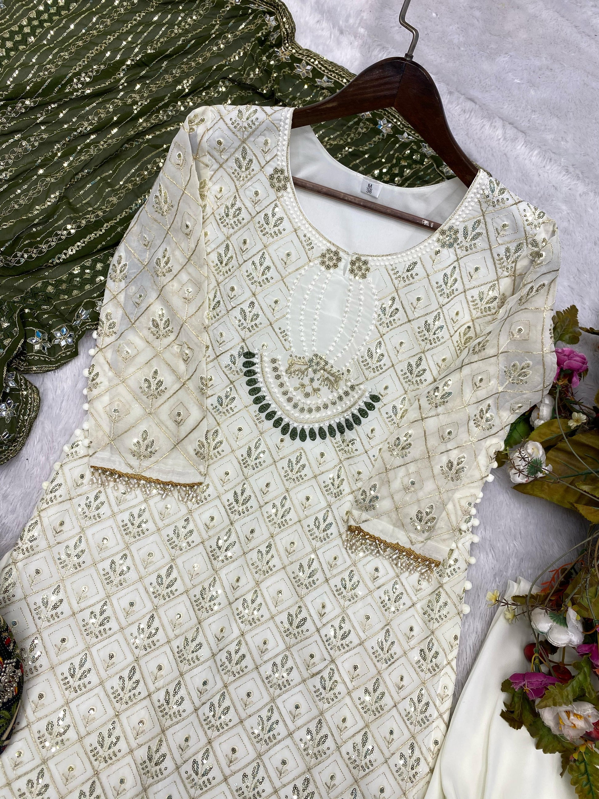 Pretty Sequence Work White Color Suit With Mehendi Dupatta