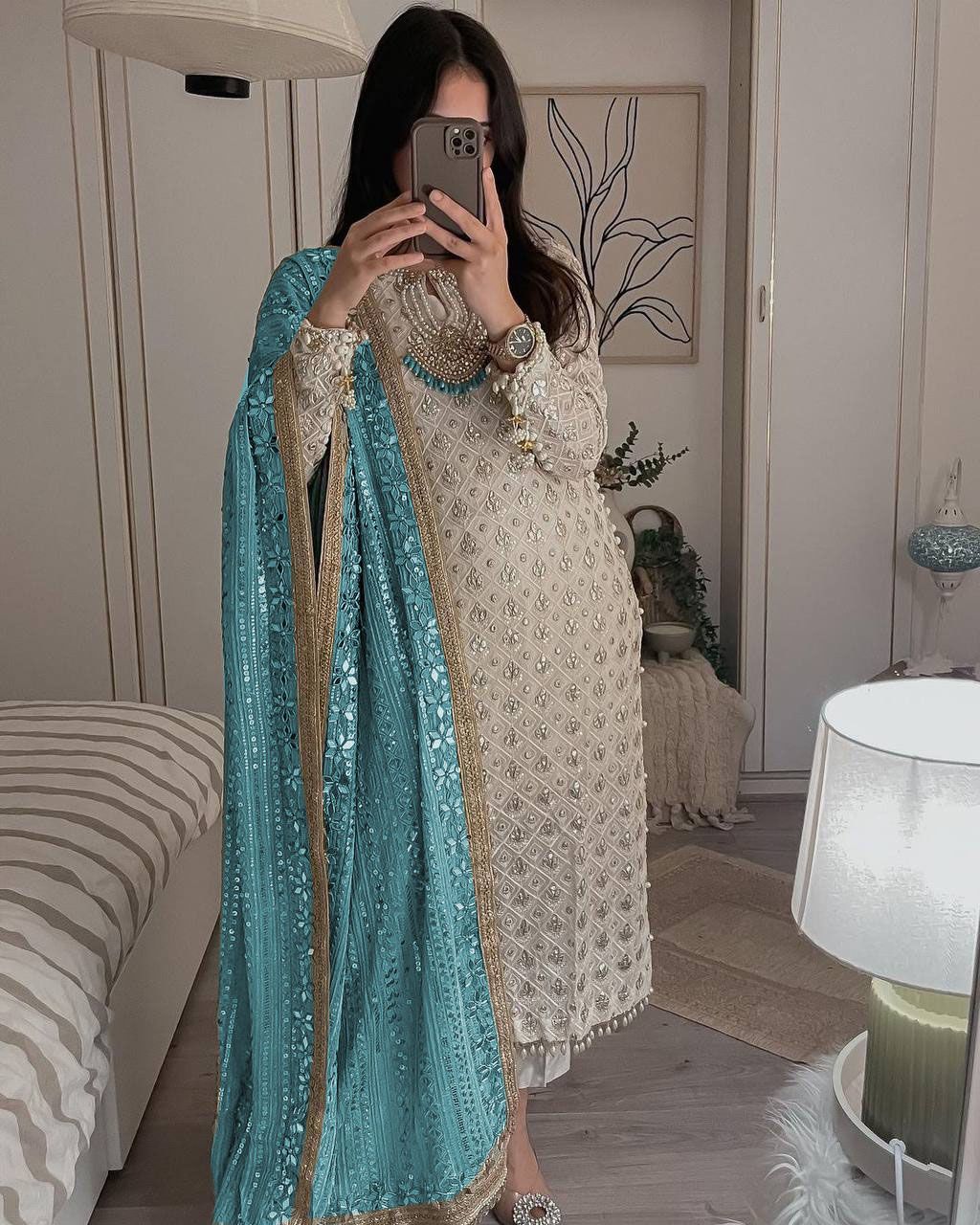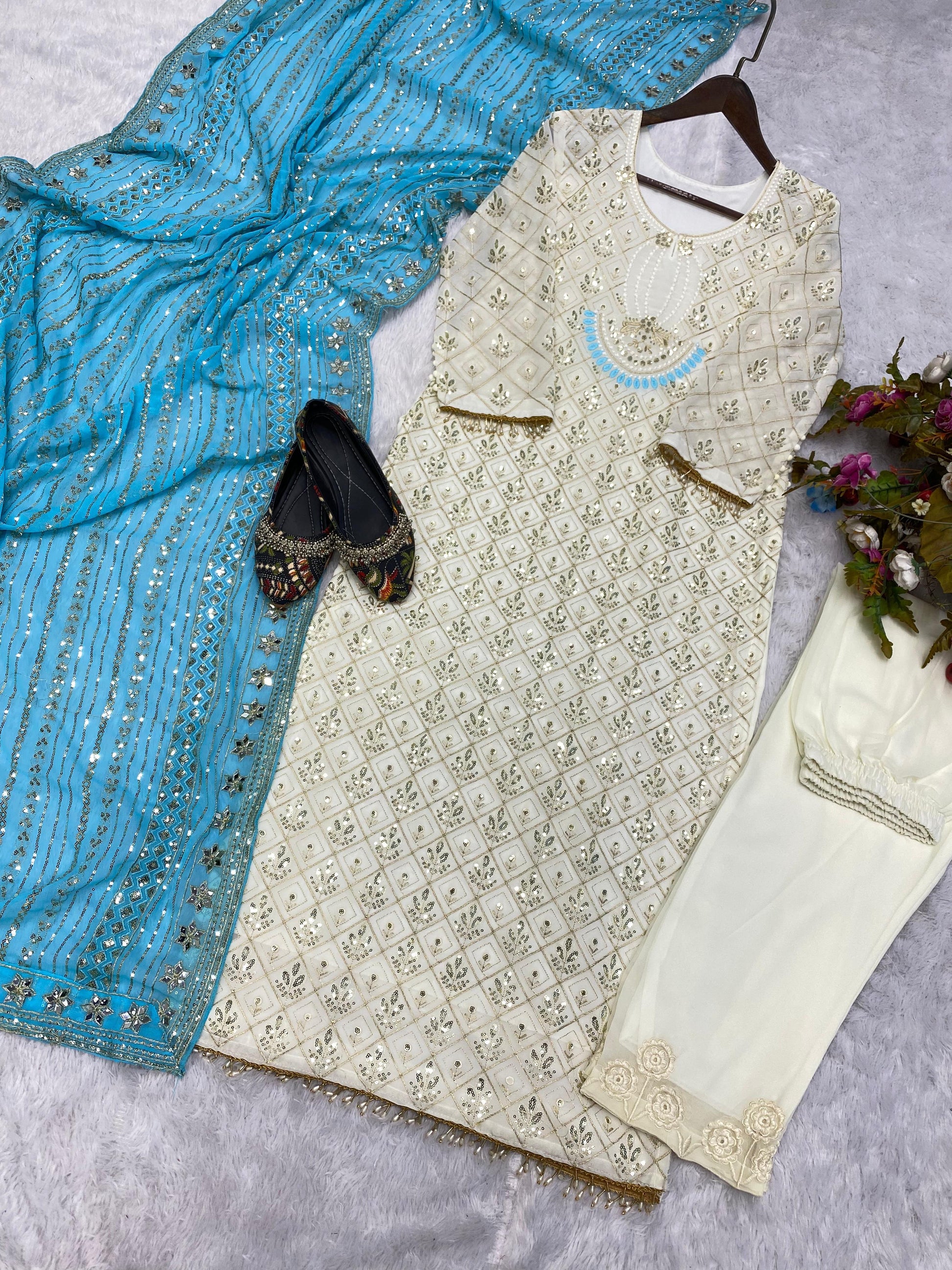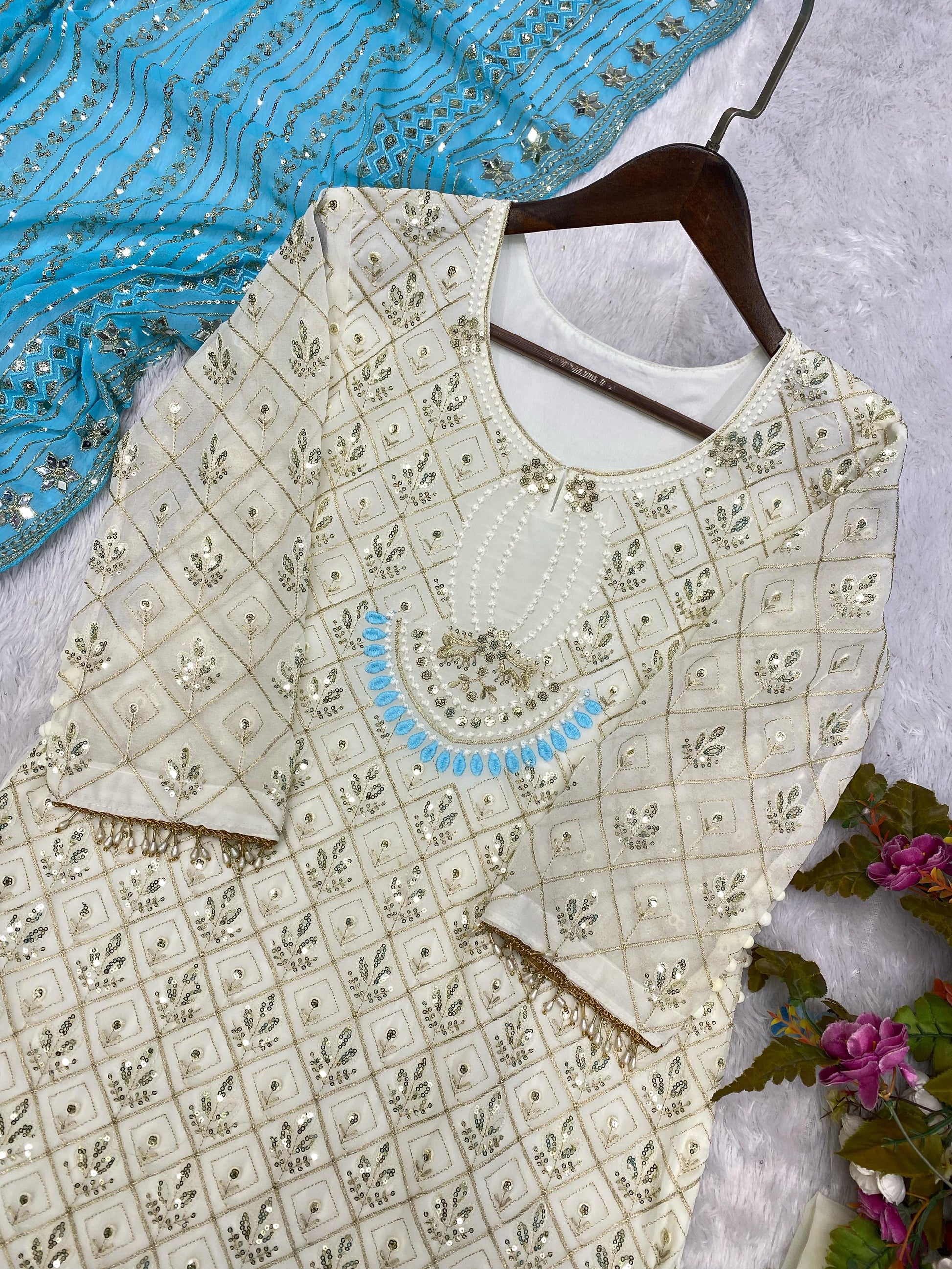 Pretty Sequence Work White Color Suit With Sky Blue Dupatta