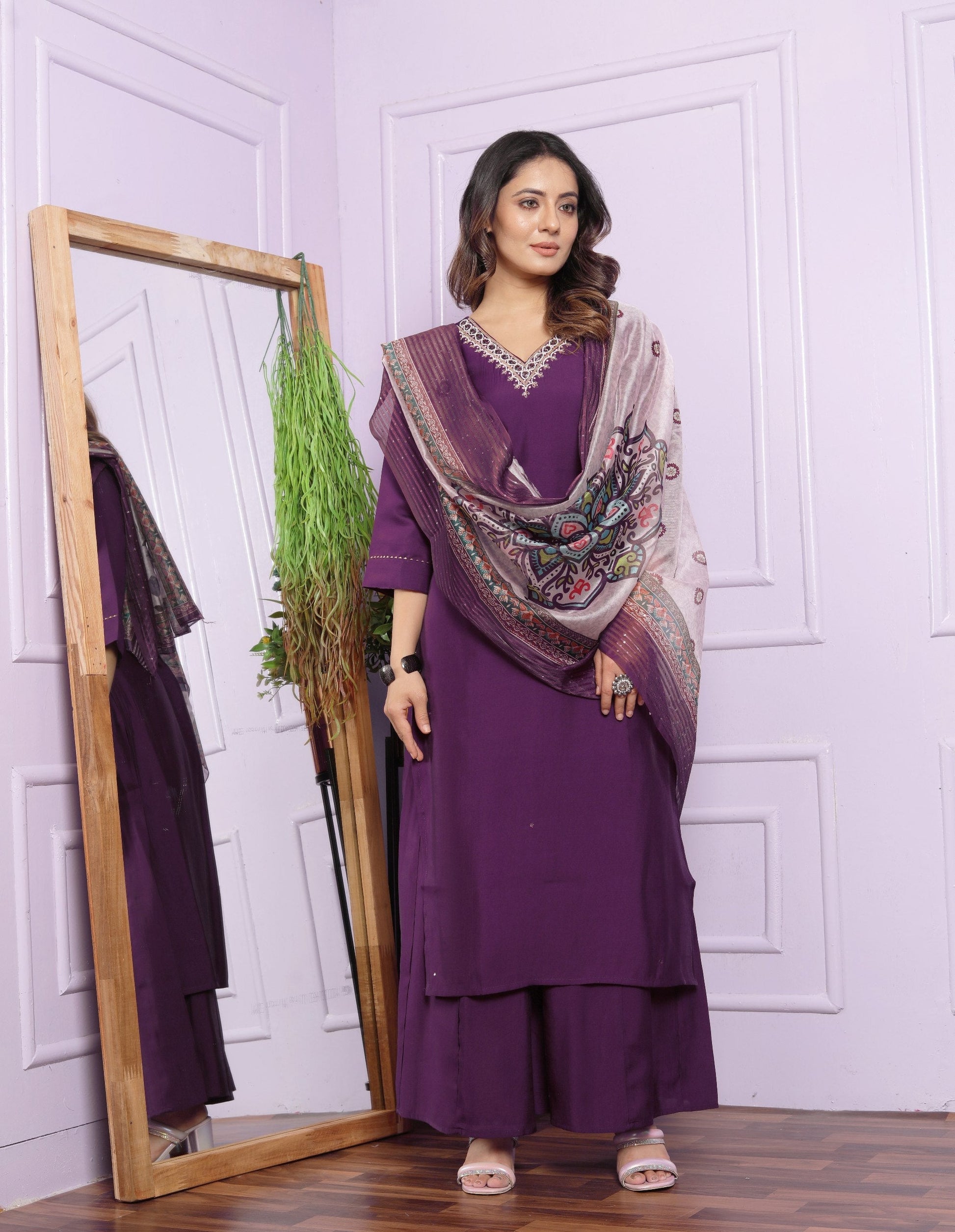 Pretty V Neck Wine Straight Kurti Palazzo Suit