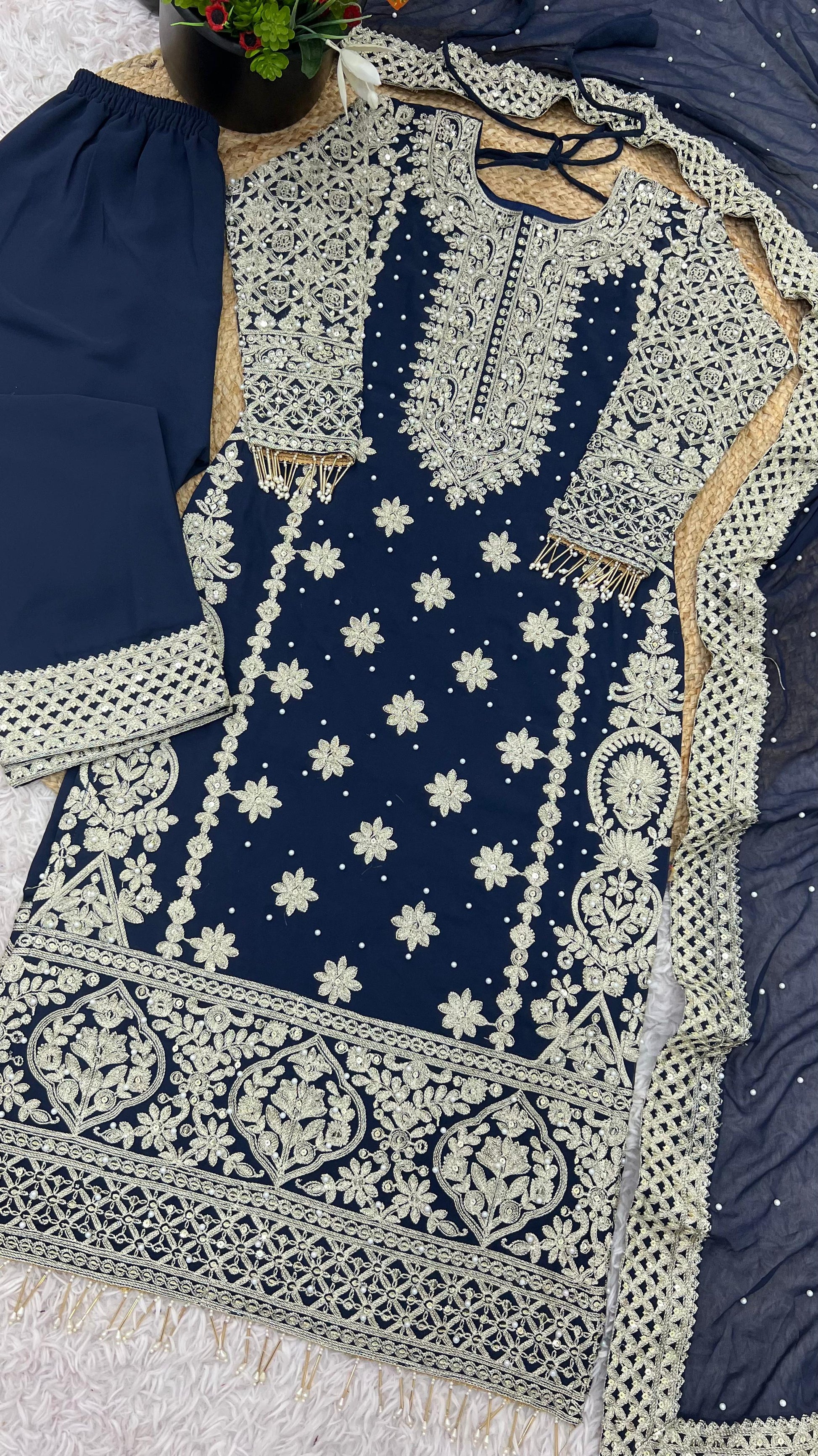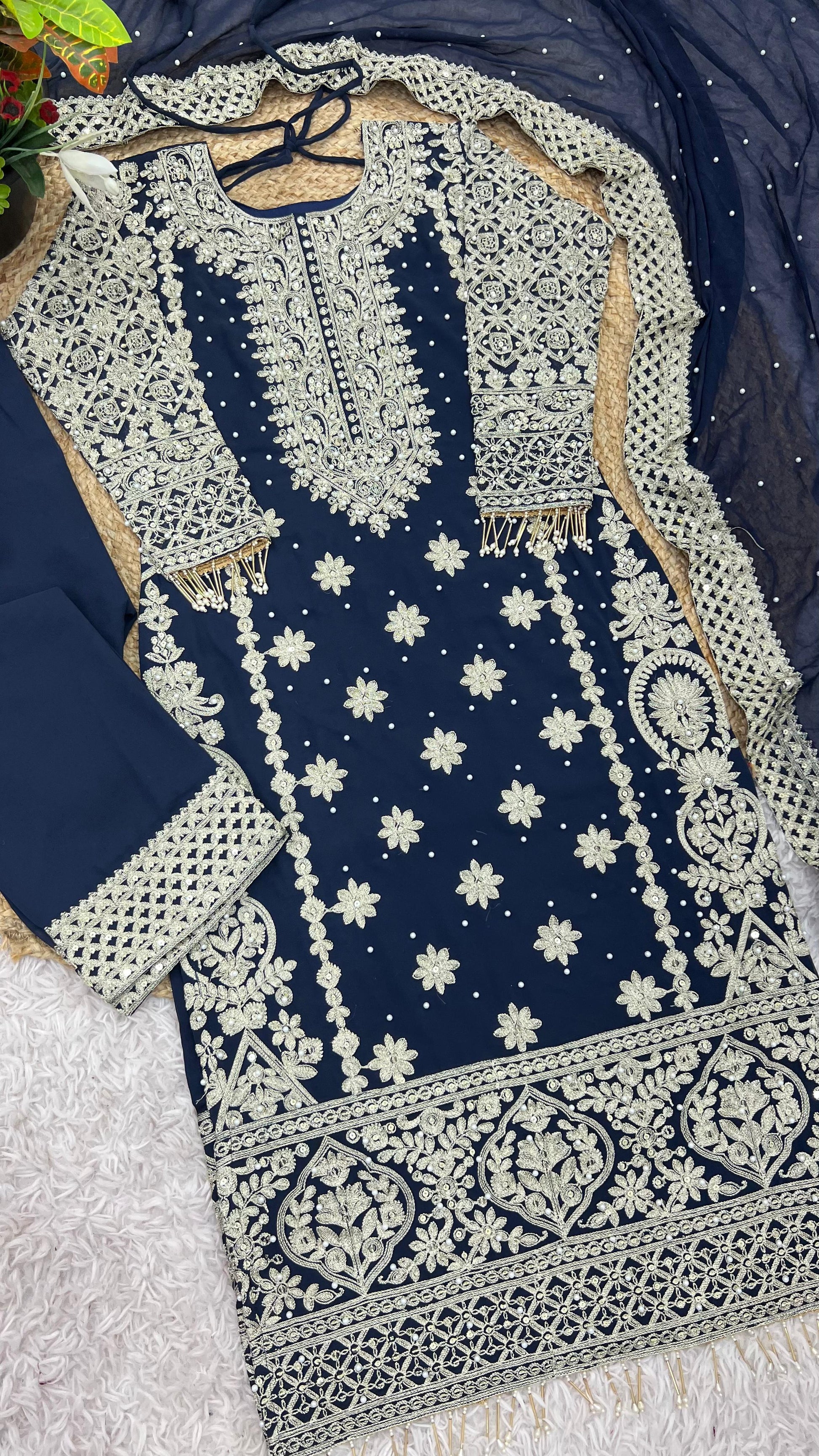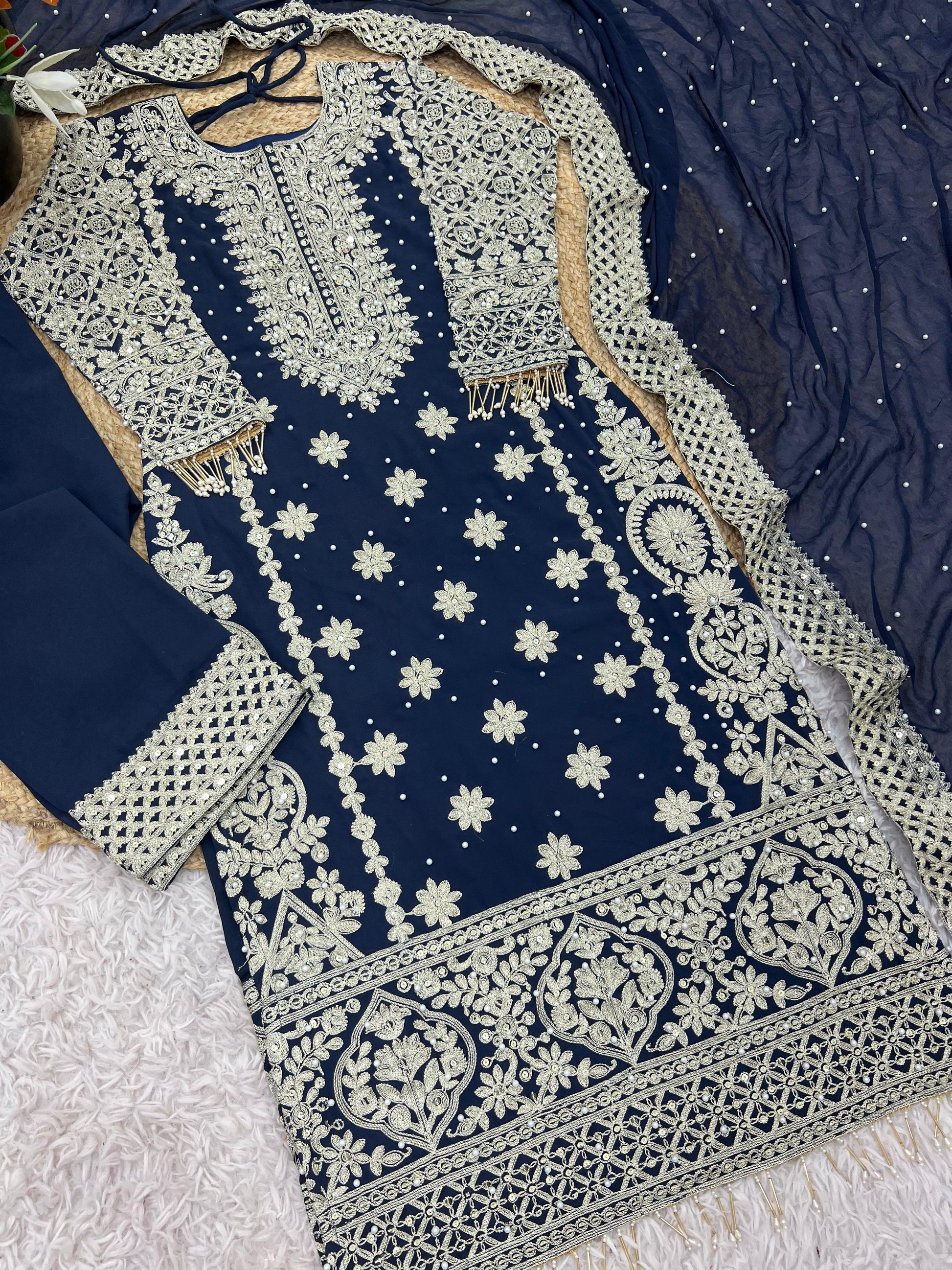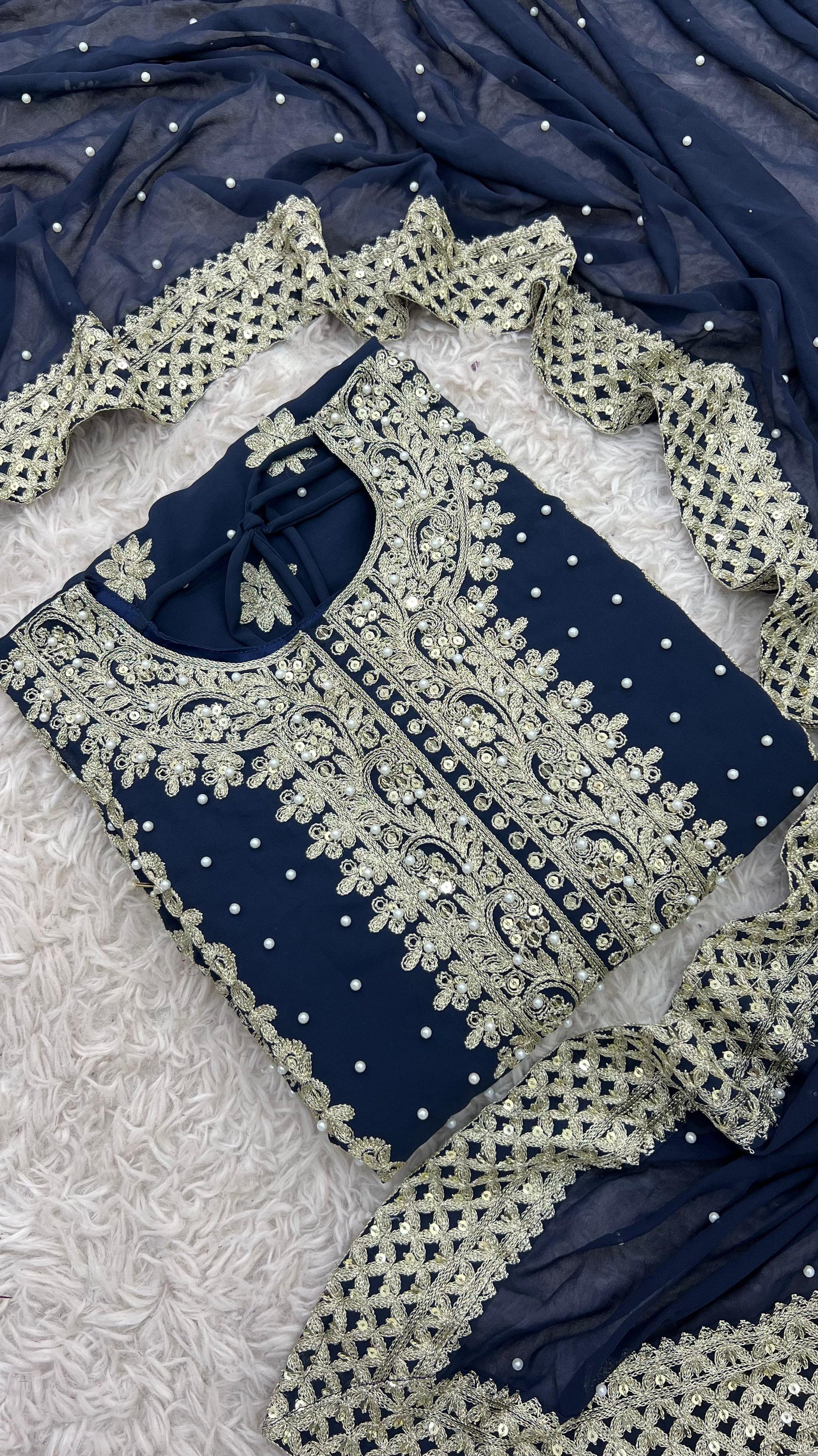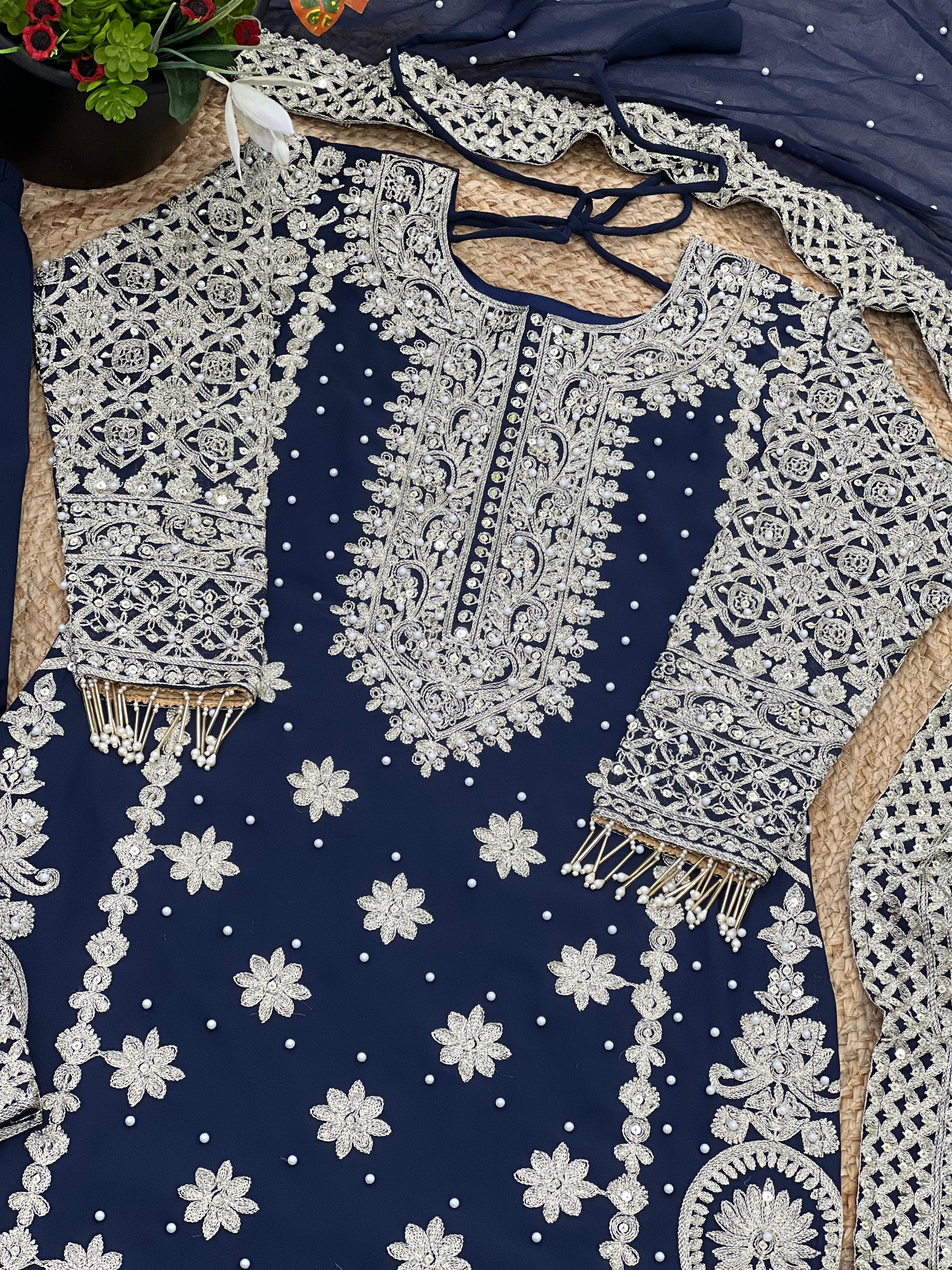 Reception Wear Navy Blue Color Faux Georgette With Heavy Embroidery Sequence Work Designer Salwar Suit