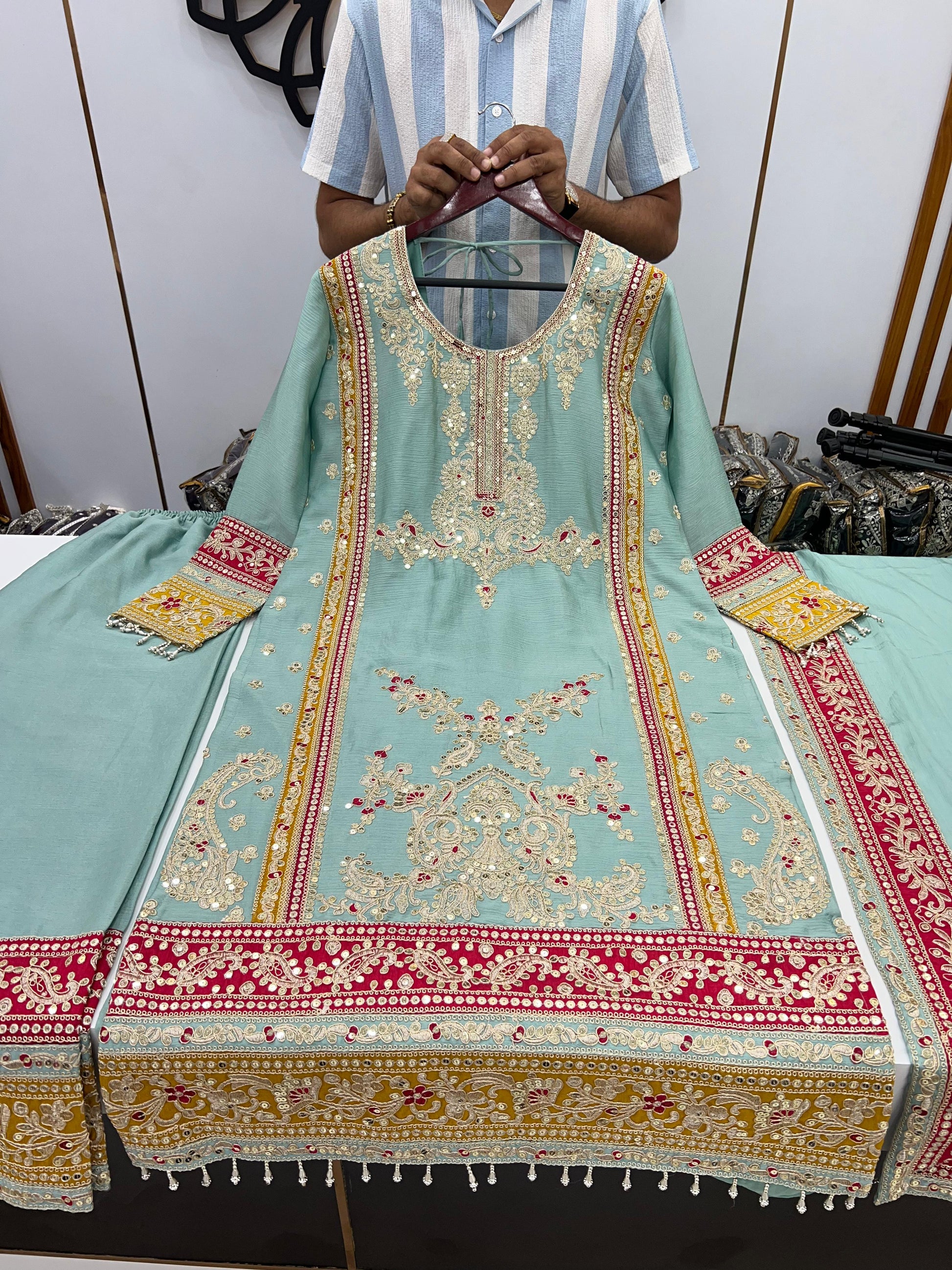 | Fabric | Pure Chinnon Silk With Embroidered Cording Sequence Work |