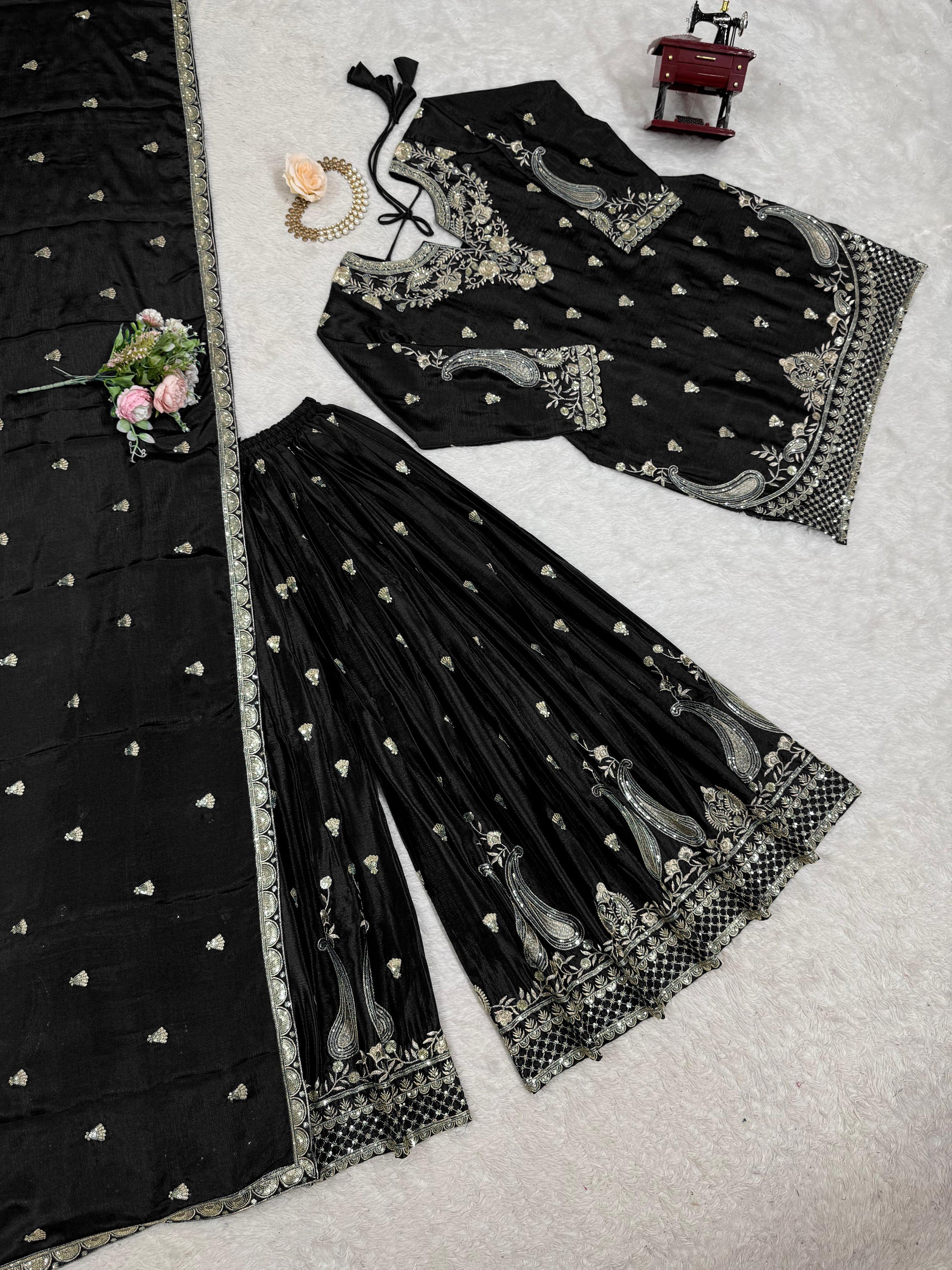 Stunning Black Color Chinon Silk And Thread With Sequence Work Palazzo Suit
