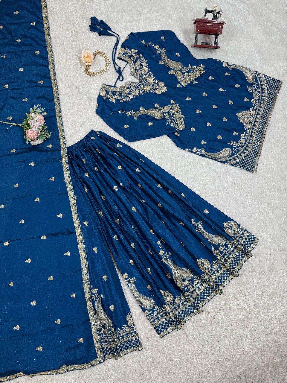 Stunning Teal Blue Color Chinon Silk And Thread With Sequence Work Palazzo Suit