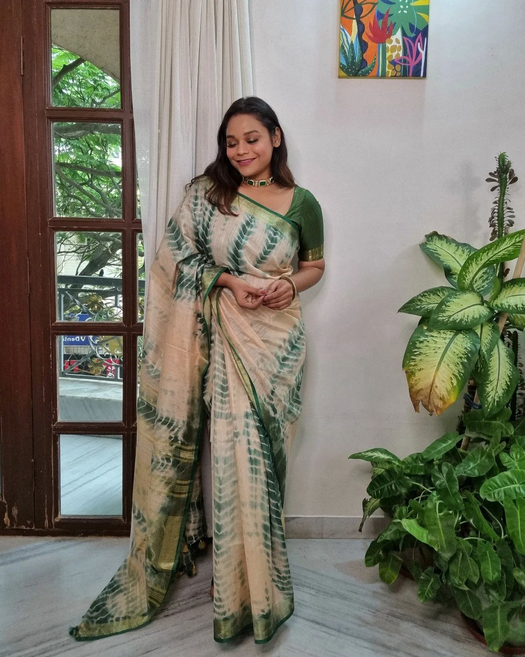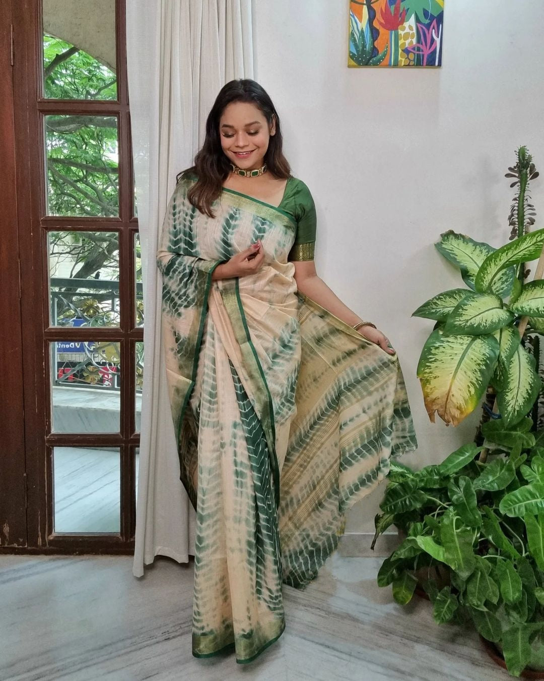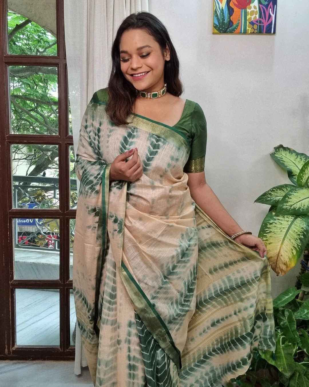 Stylish Cream Color Pure Cotton Lilen With Digital Printed Designer Saree