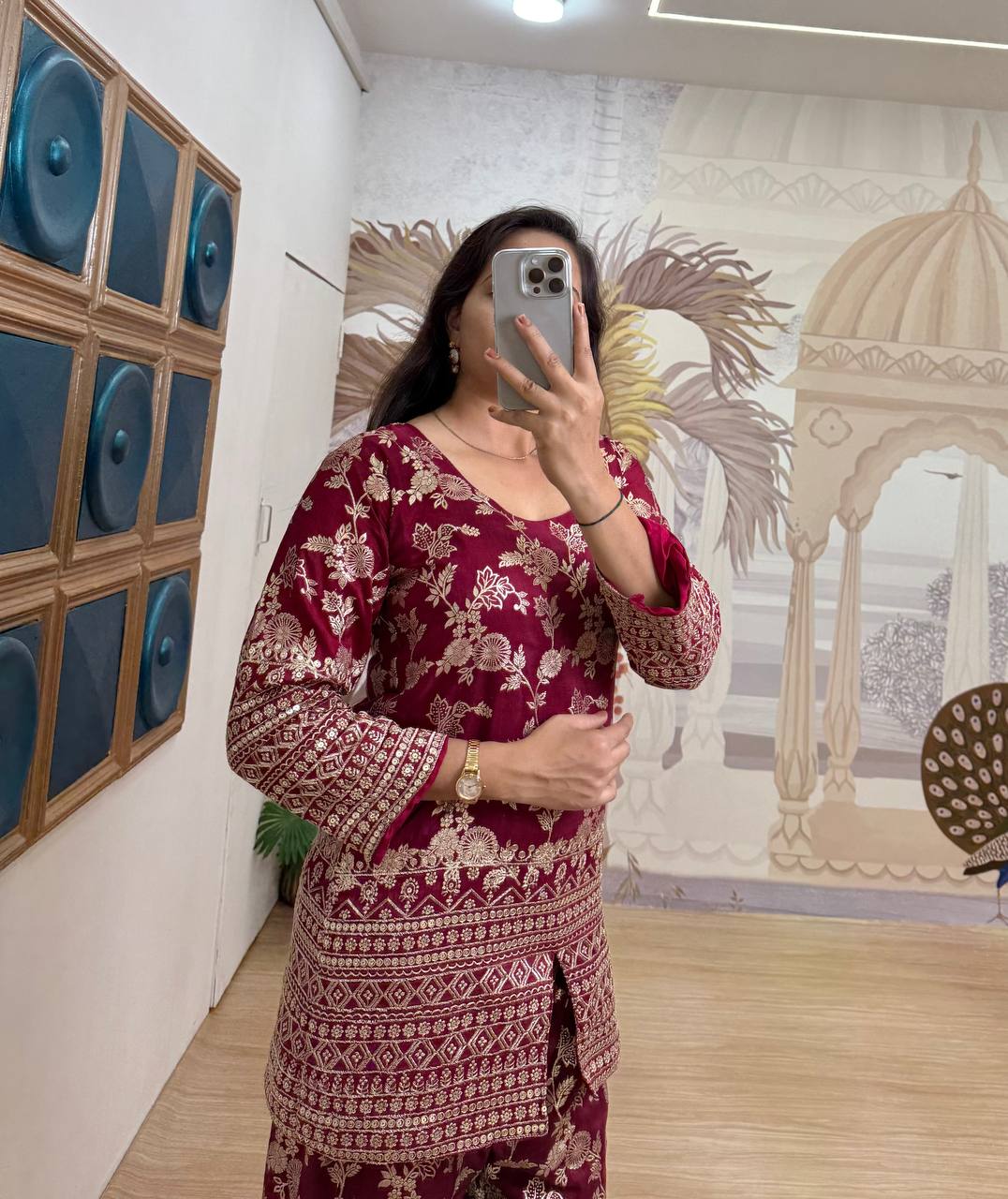 Stylish Maroon Color Dola Silk With Embroidery Work Designer Palazzo Suit