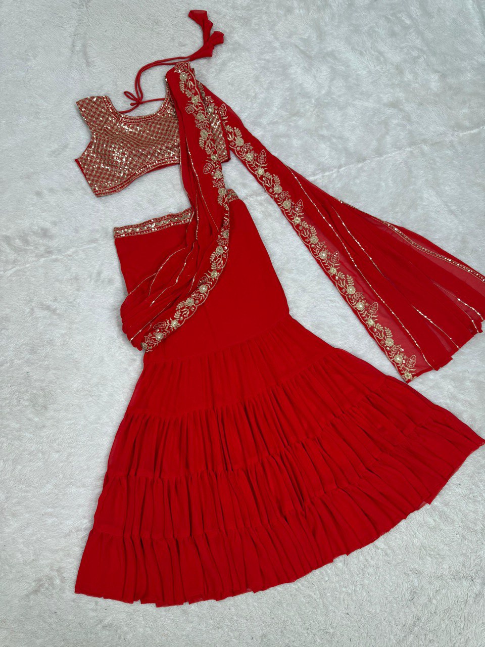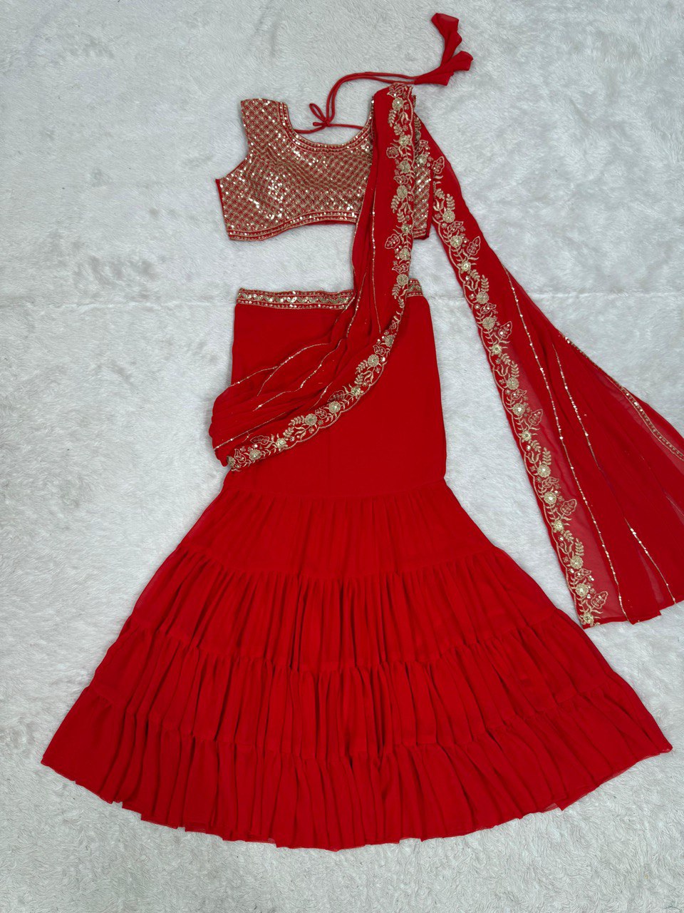 Stylish Red Color Faux Georgette Thread With Sequence Work Ready Wear Lehenga Saree