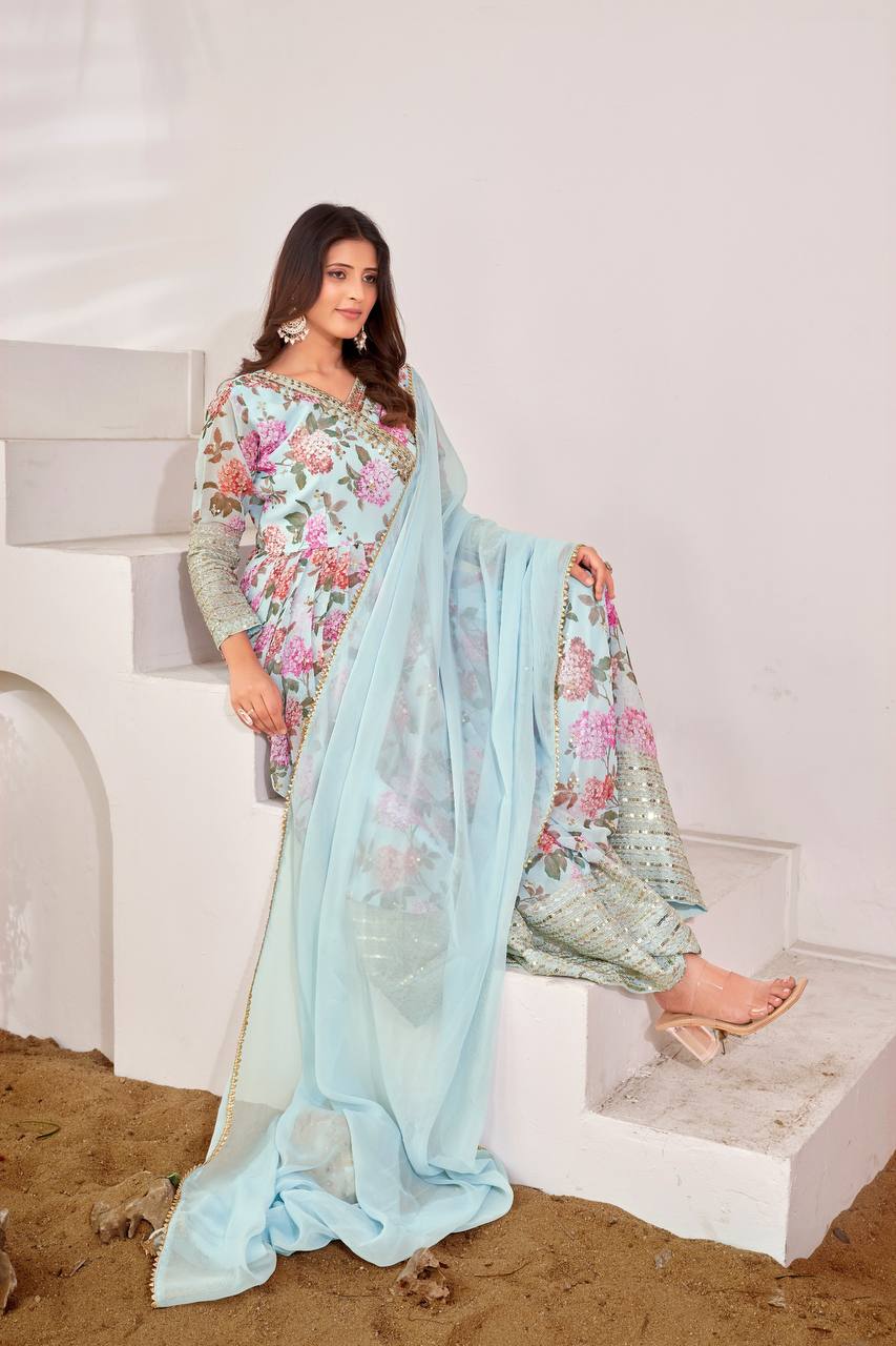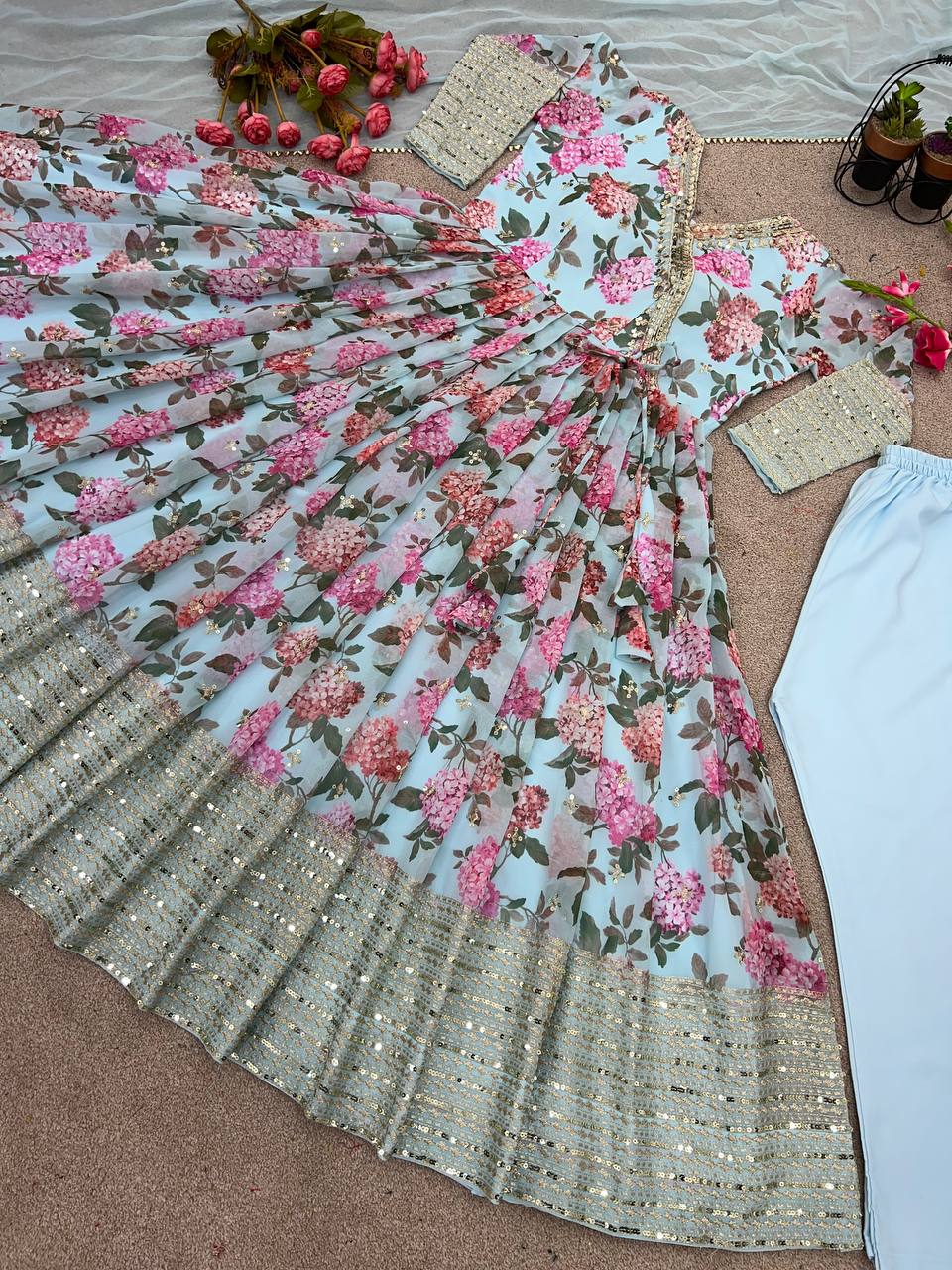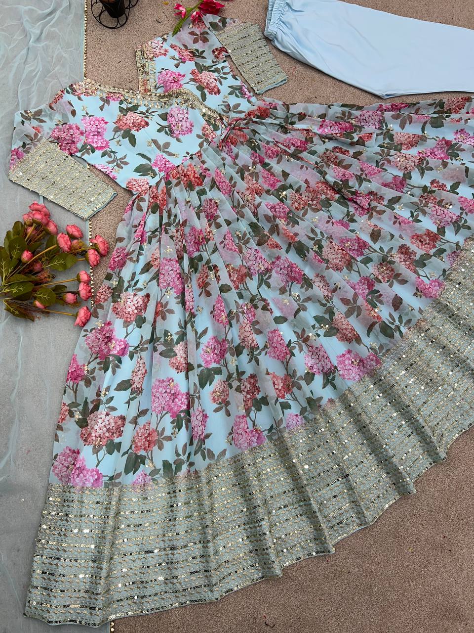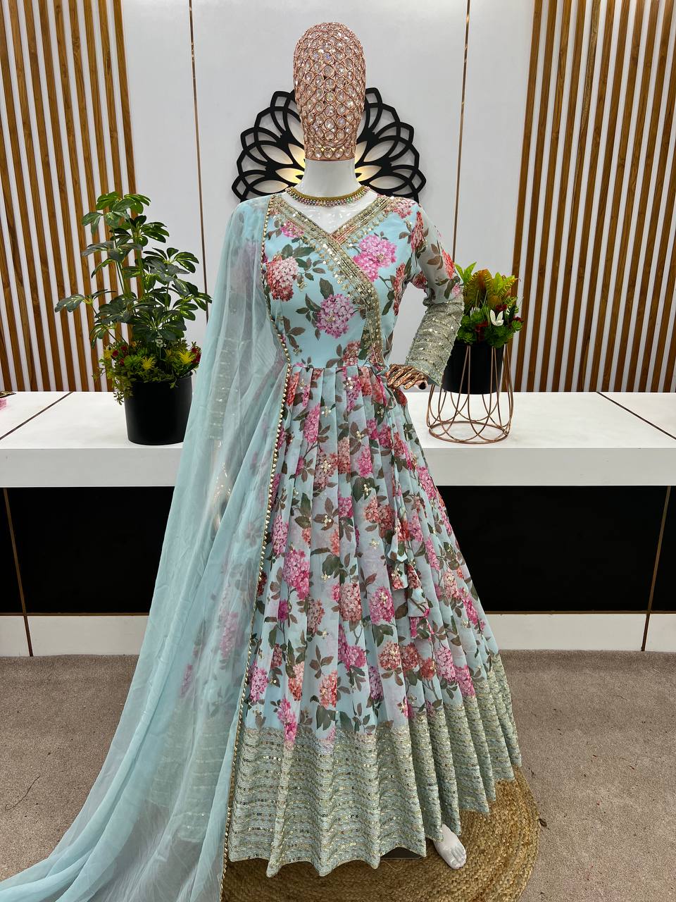 Stylish Sky Blue Color Embroidery Sequence Work Gown