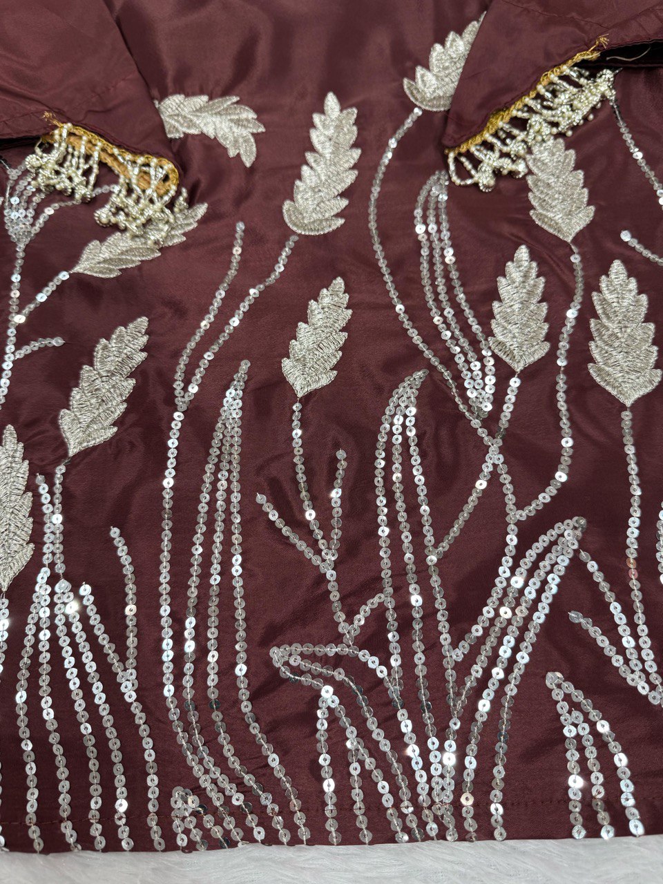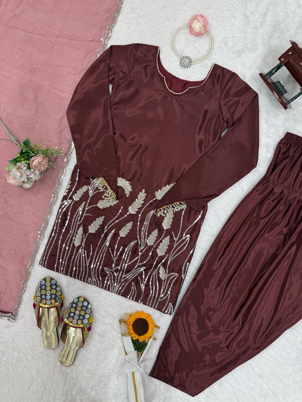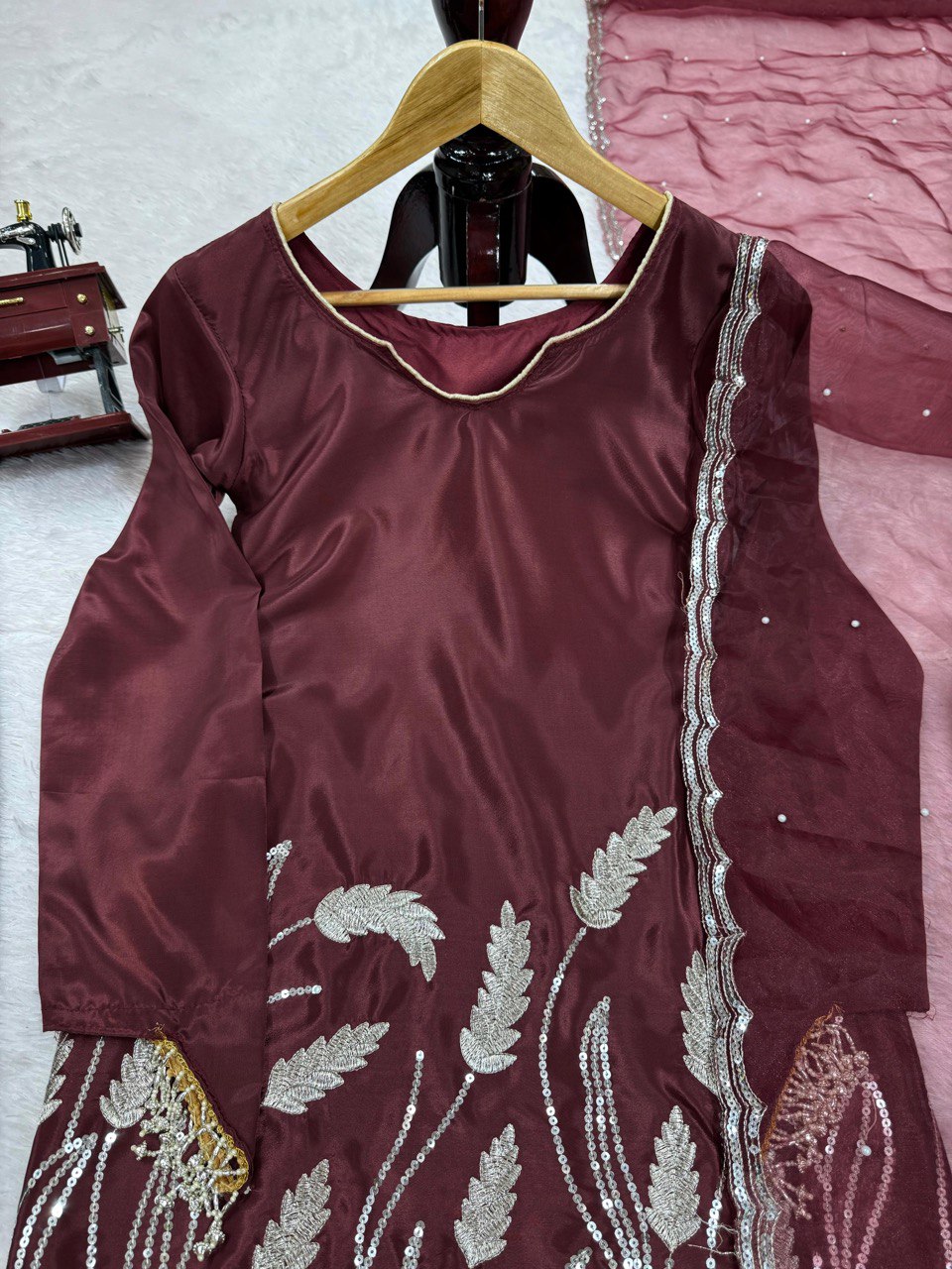 Stylish Wine Color Faux Georgette Thread With Sequence Work Palazzo Suit