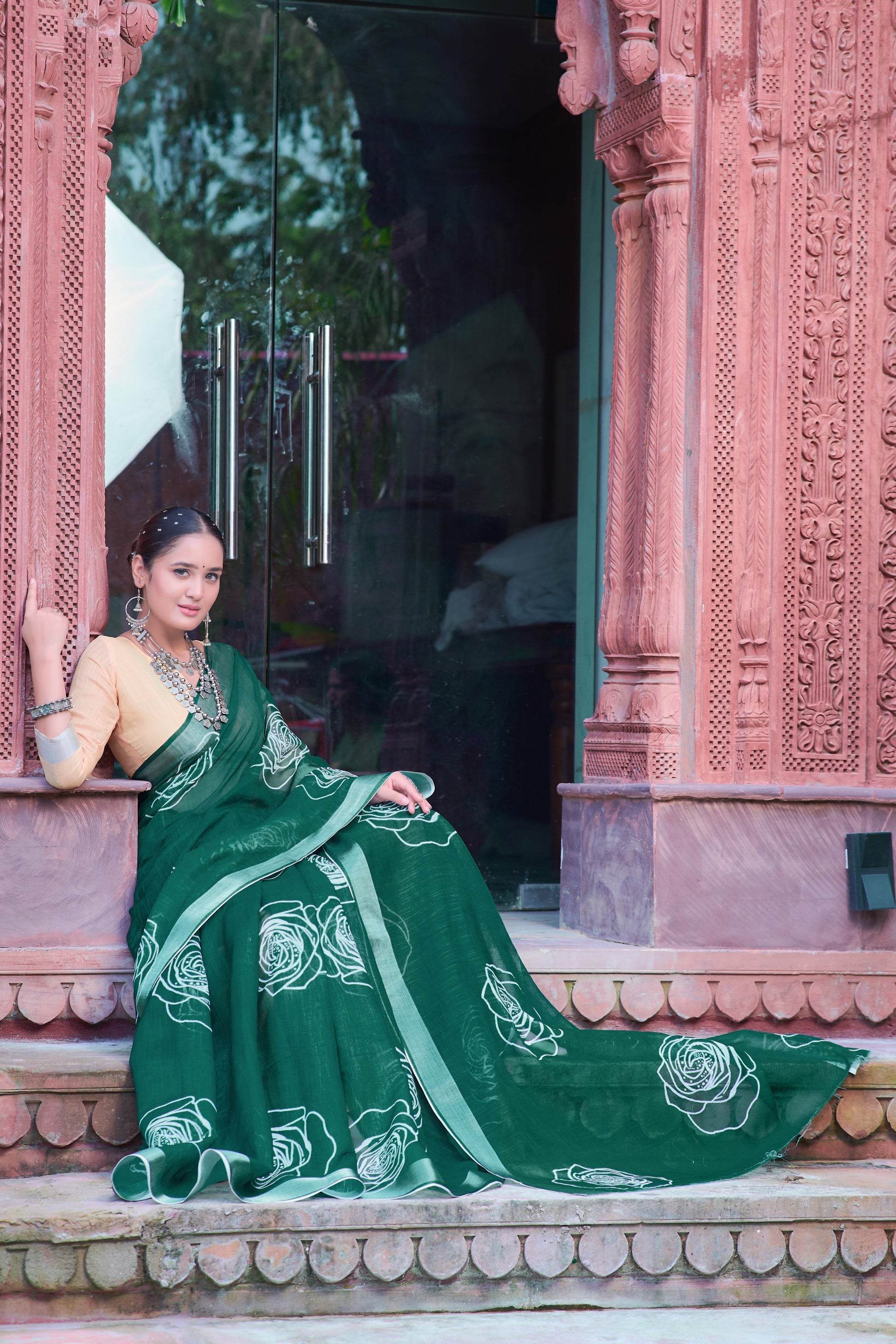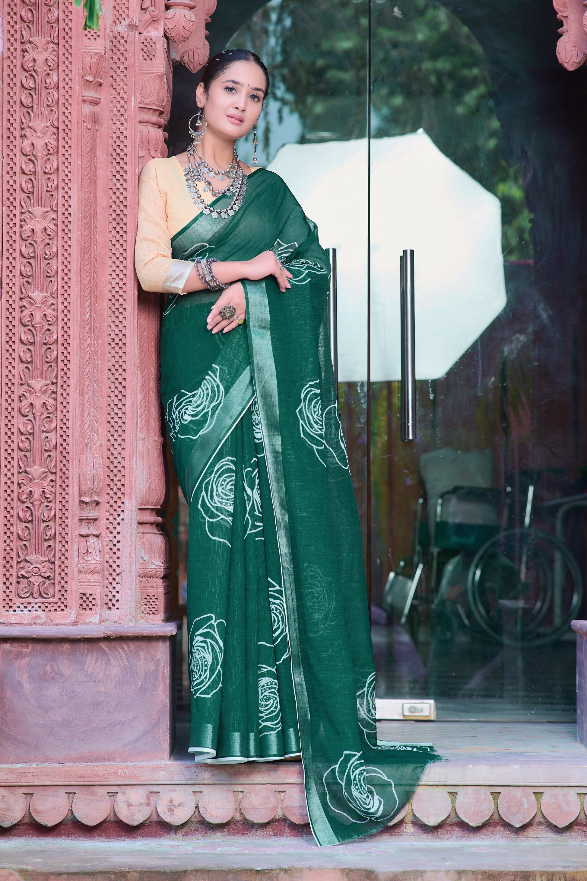 Superhit Green Color Color Pure Cotton Lilen With Digital Printed Designer Saree
