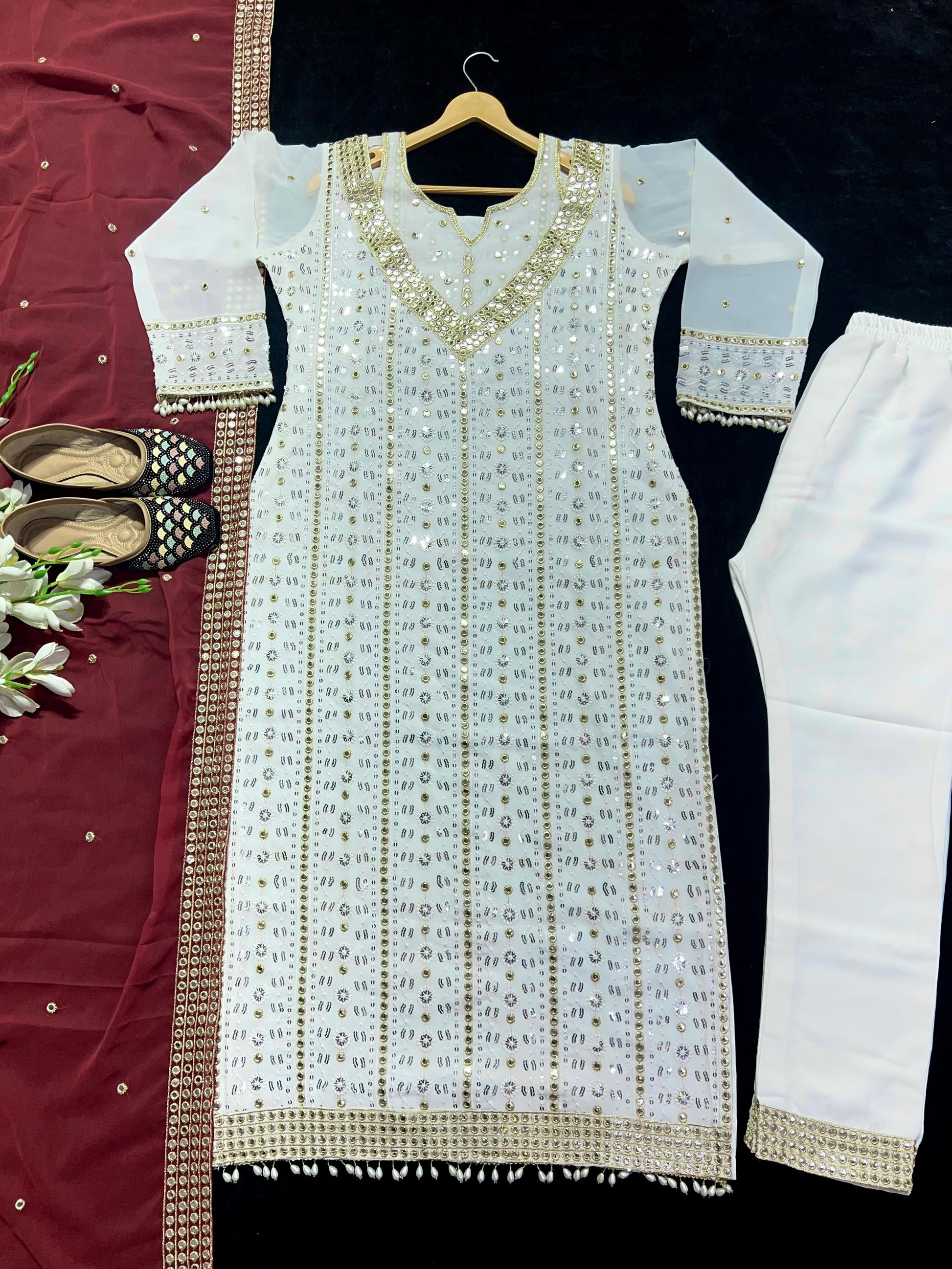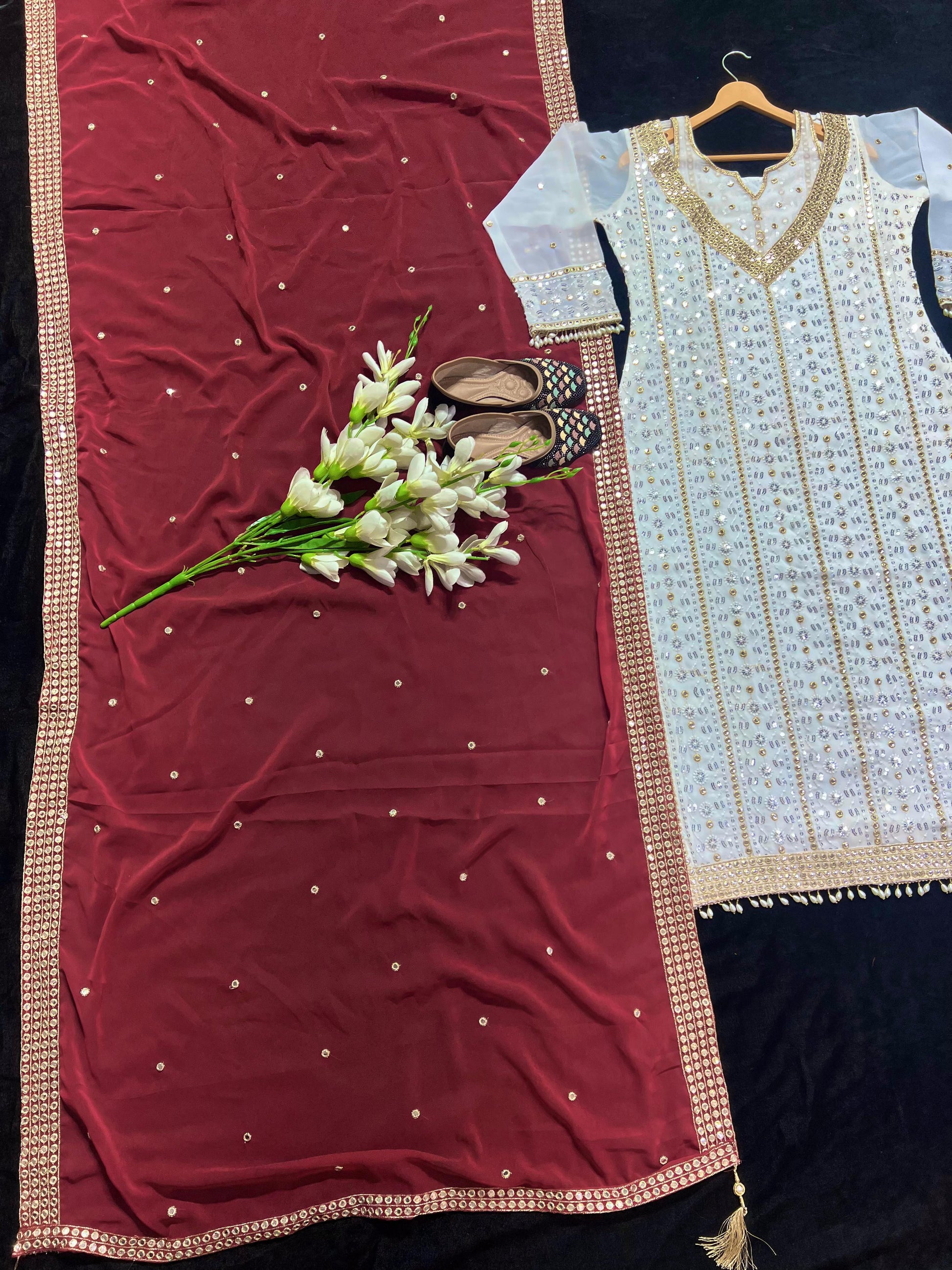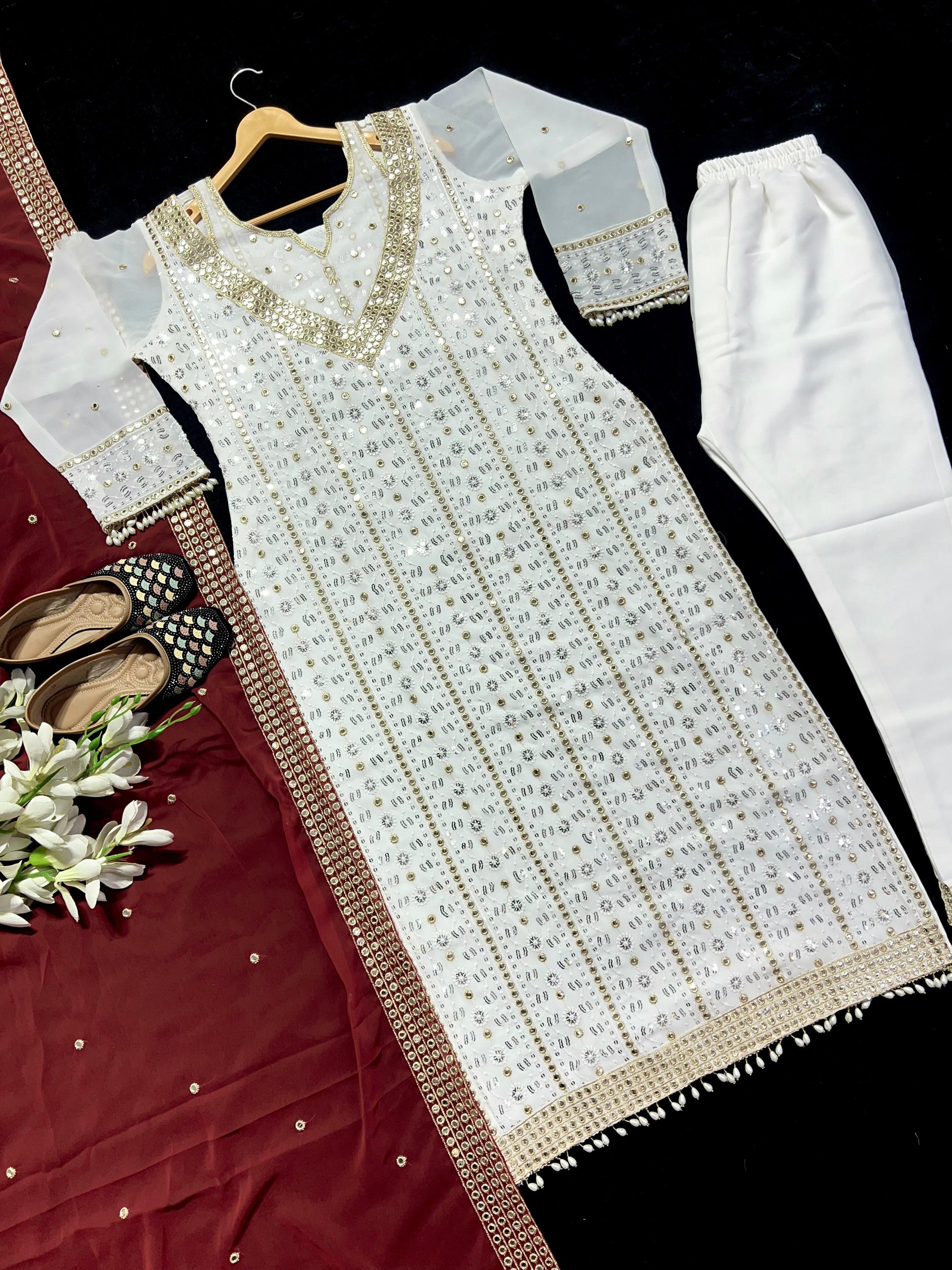 Terrific Embroidered White Salwar Suit With Maroon Dupatta